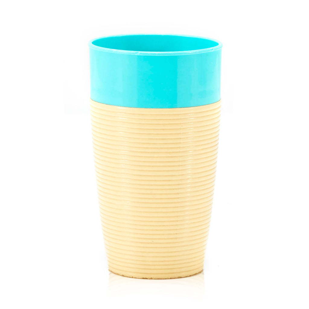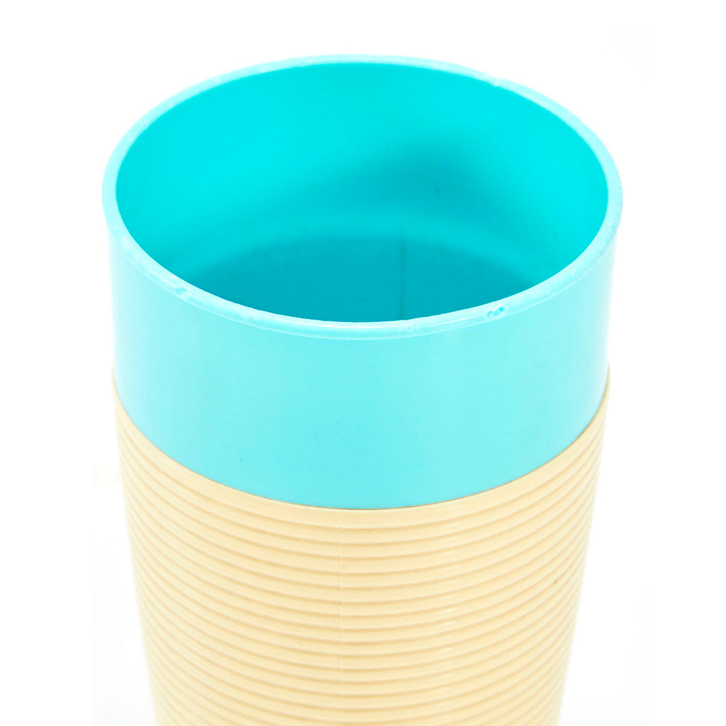 Details: Blue and cream colored Raffiaware drinking cup Dimensions: 5.25" H x 3" W x 3" D Quantity: 1