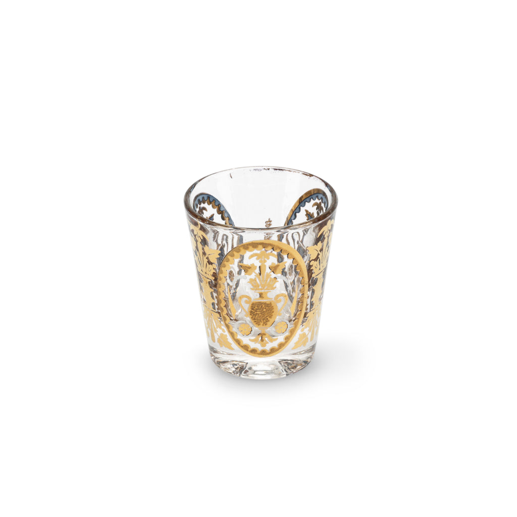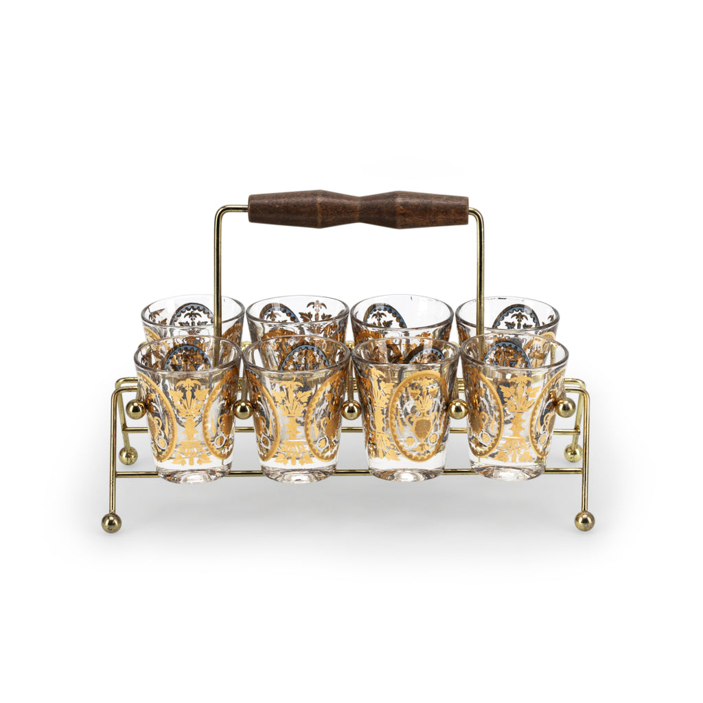 Details: Gold glassware with brass / wood carrier. Dimensions: 6" H x 9" W x 4" D