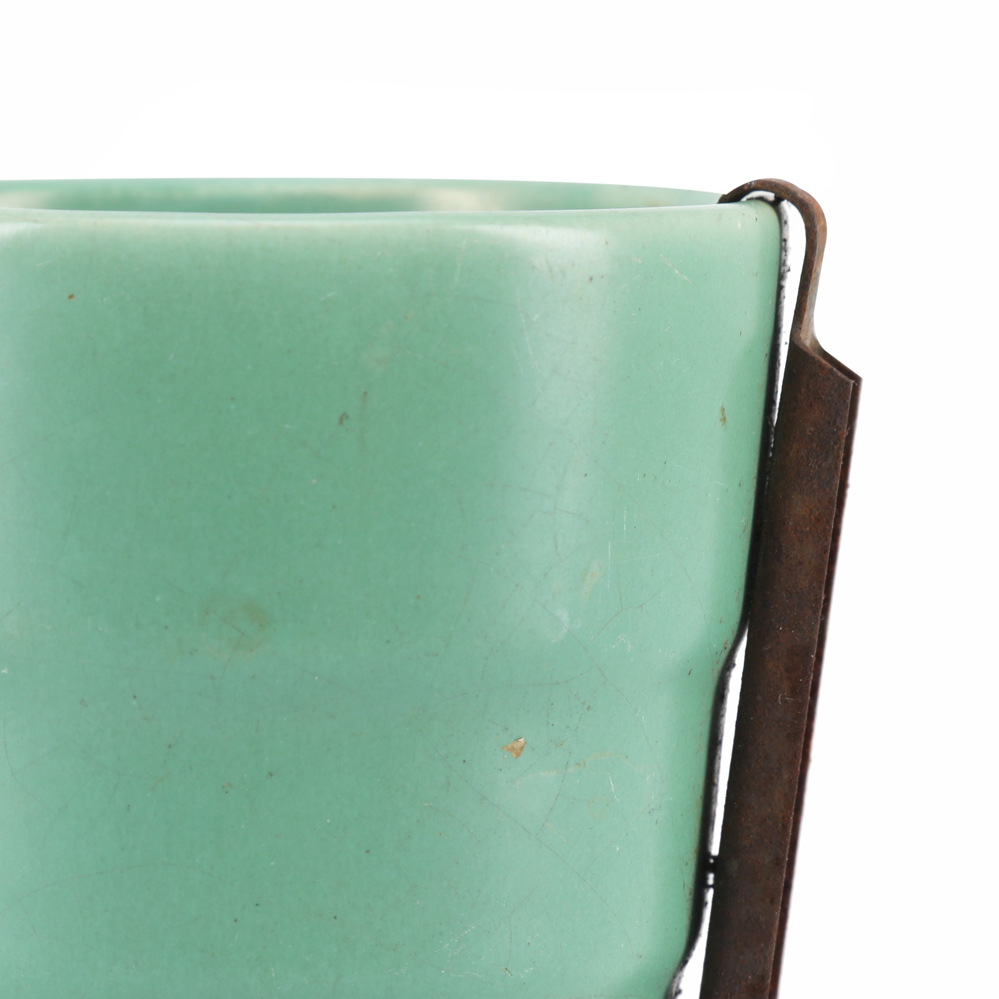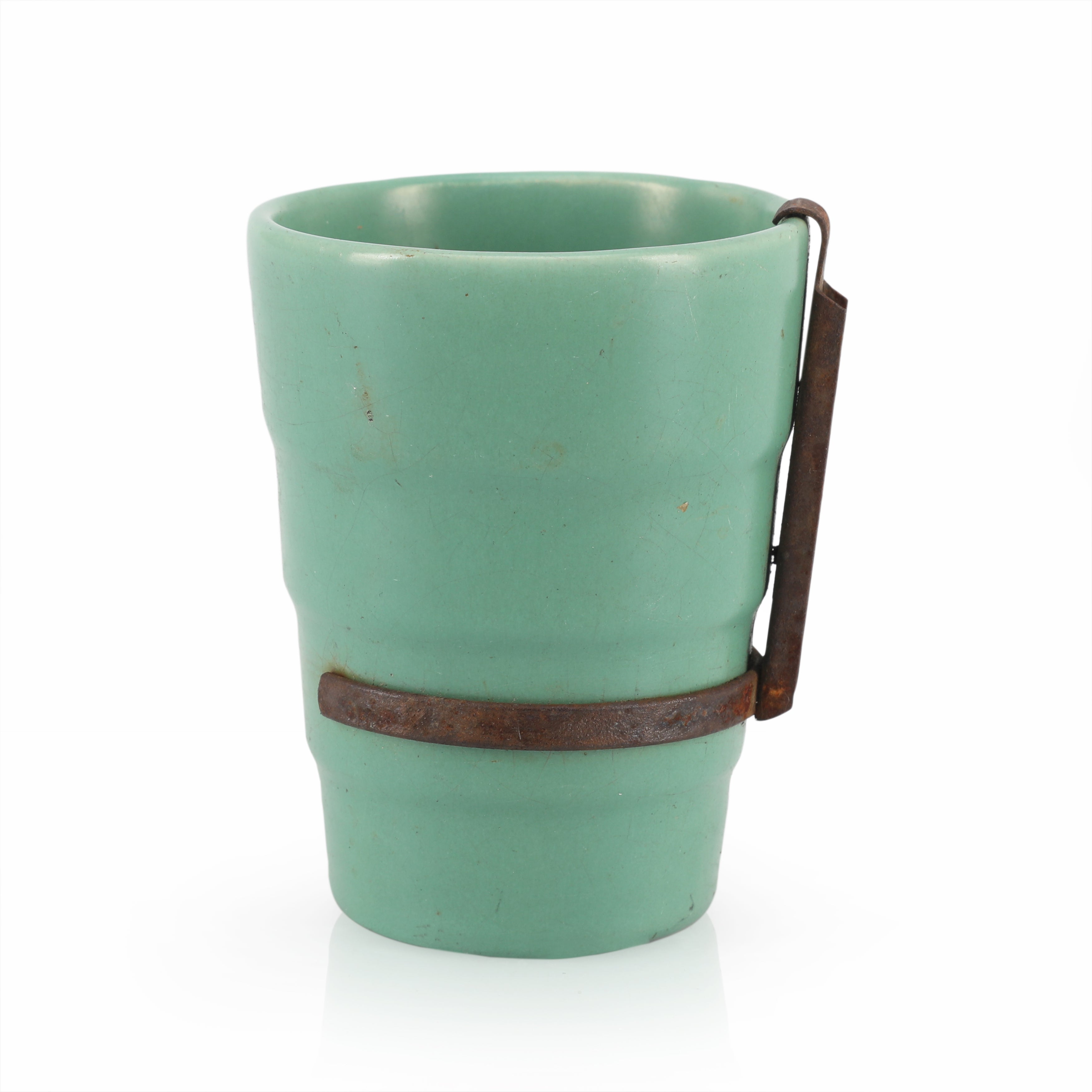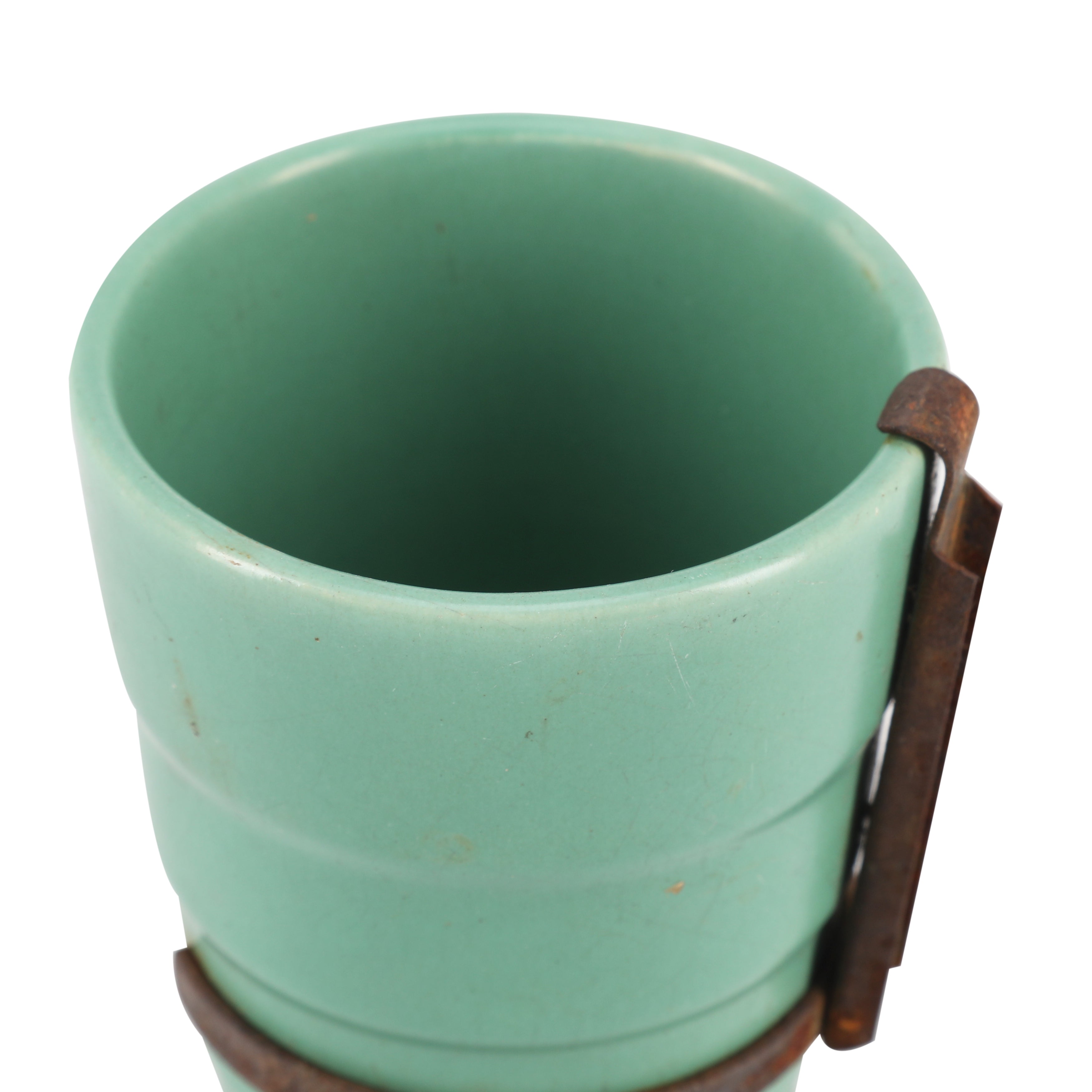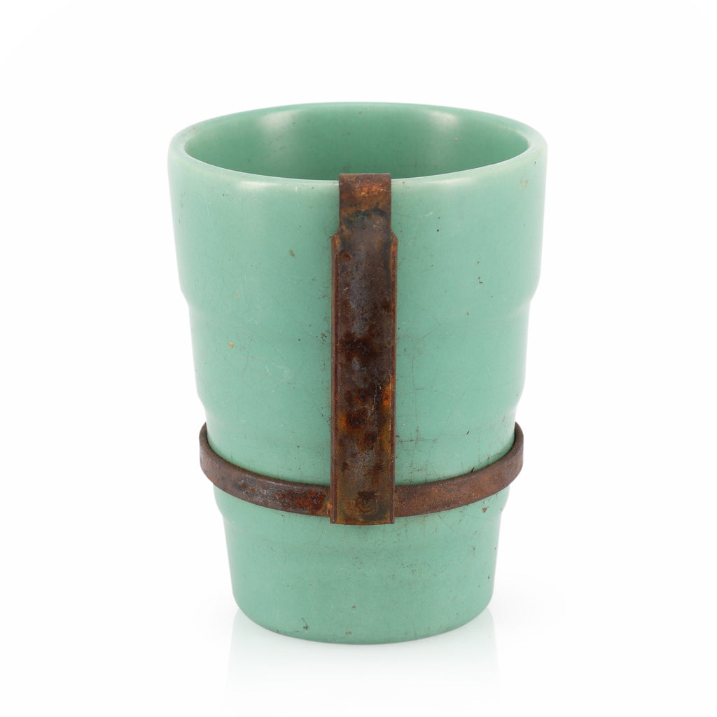 Details: Teal ceramic cup with cast iron hardware on side Dimensions: 4" H x 3" D