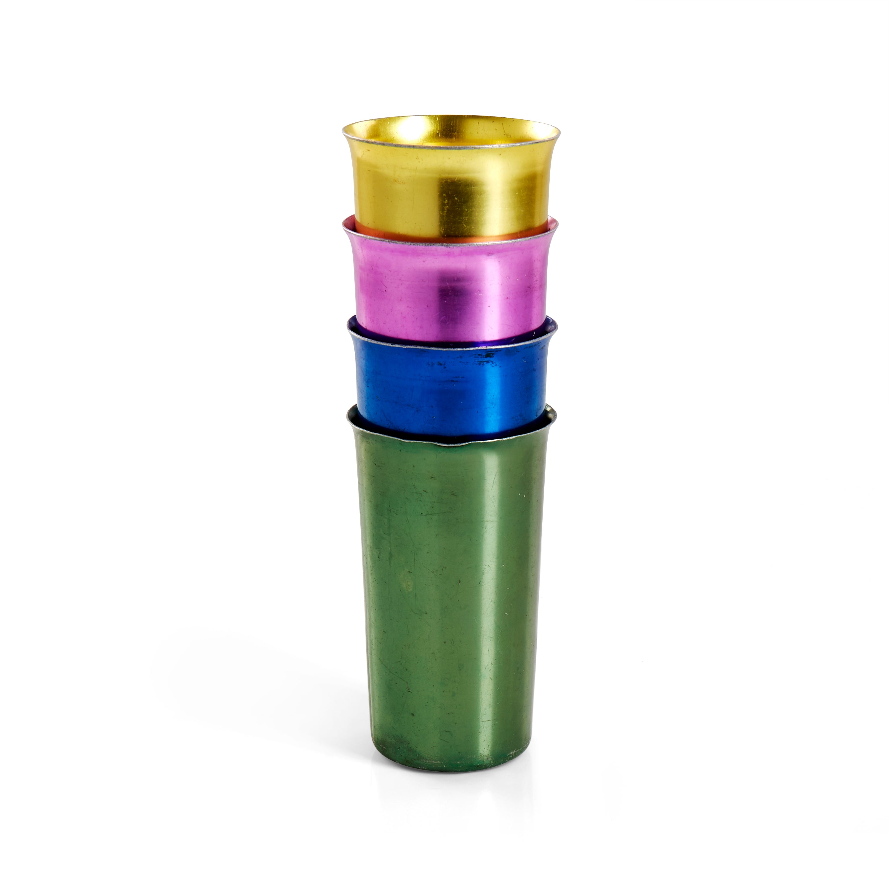 Details: Set of four metallic cups (gold, pink, blue, and green) Dimensions: 5" High x 3" Diameter (each)