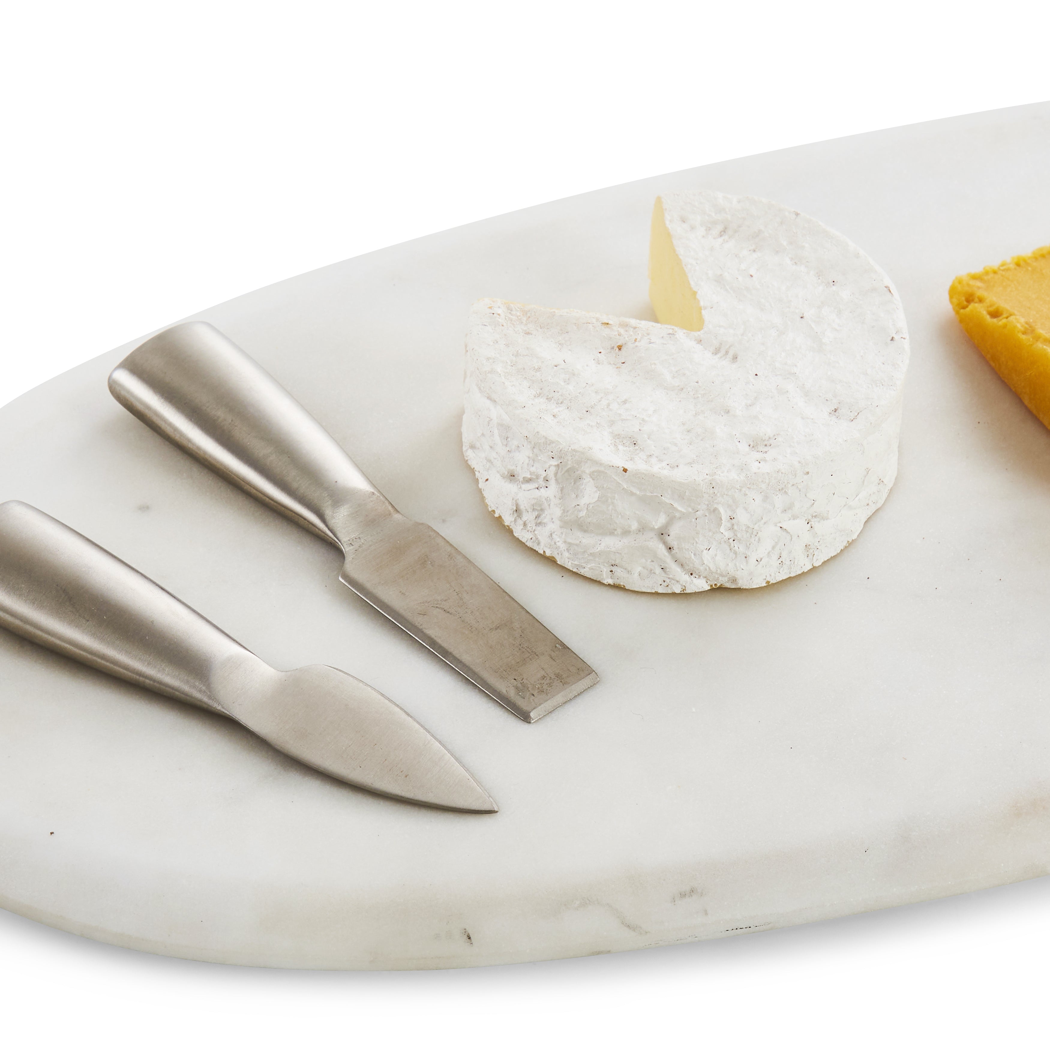 Details: White and black marble stone with fake cheese and silver knives Dimensions: 2" H x 19" W x 9" L