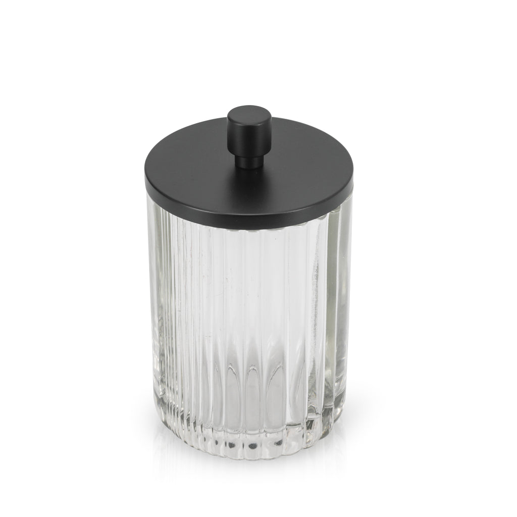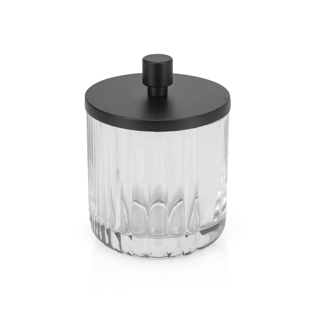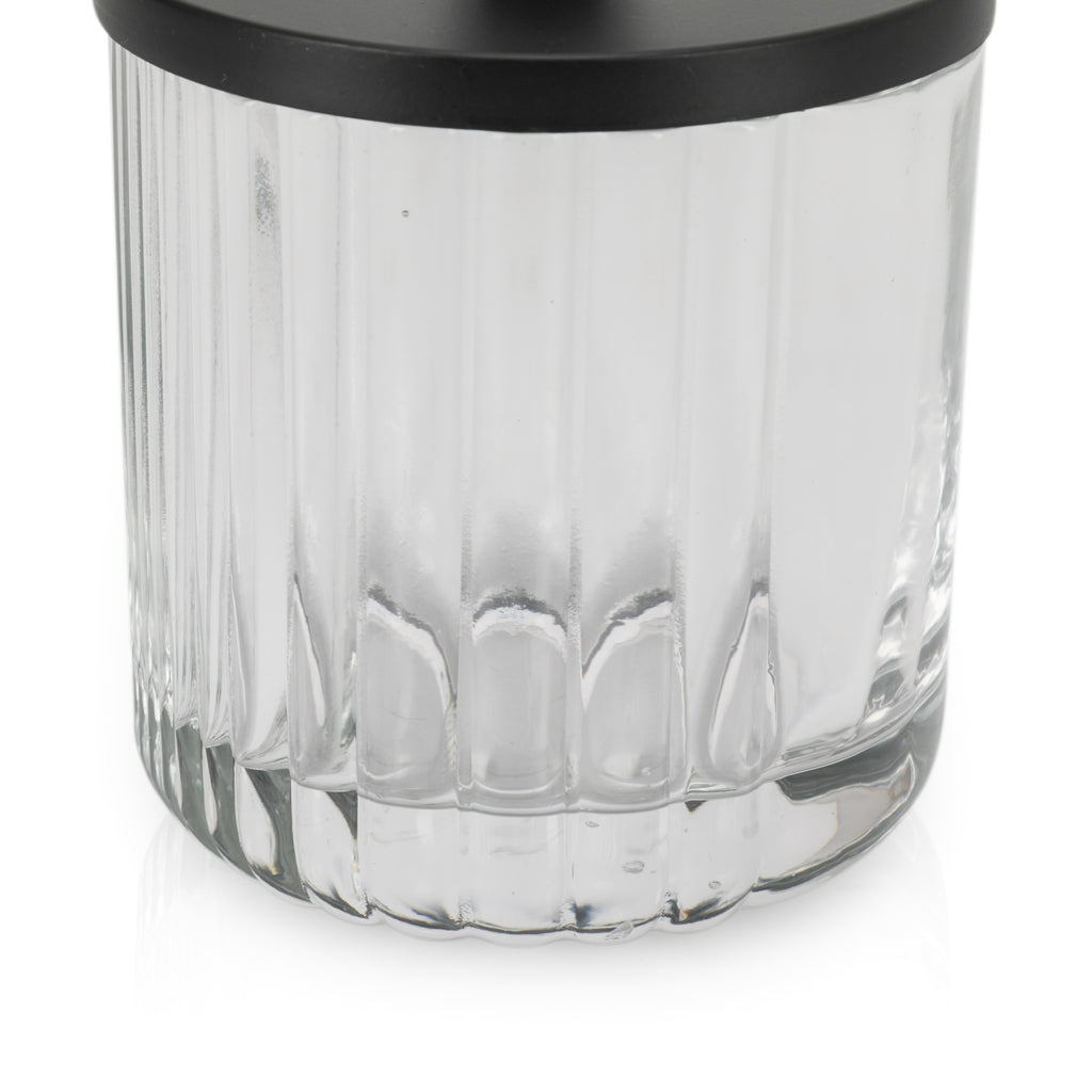 Details: Glass jar featuring a ribbed exterior and black metal top. Dimensions: 6" H x 4" D
