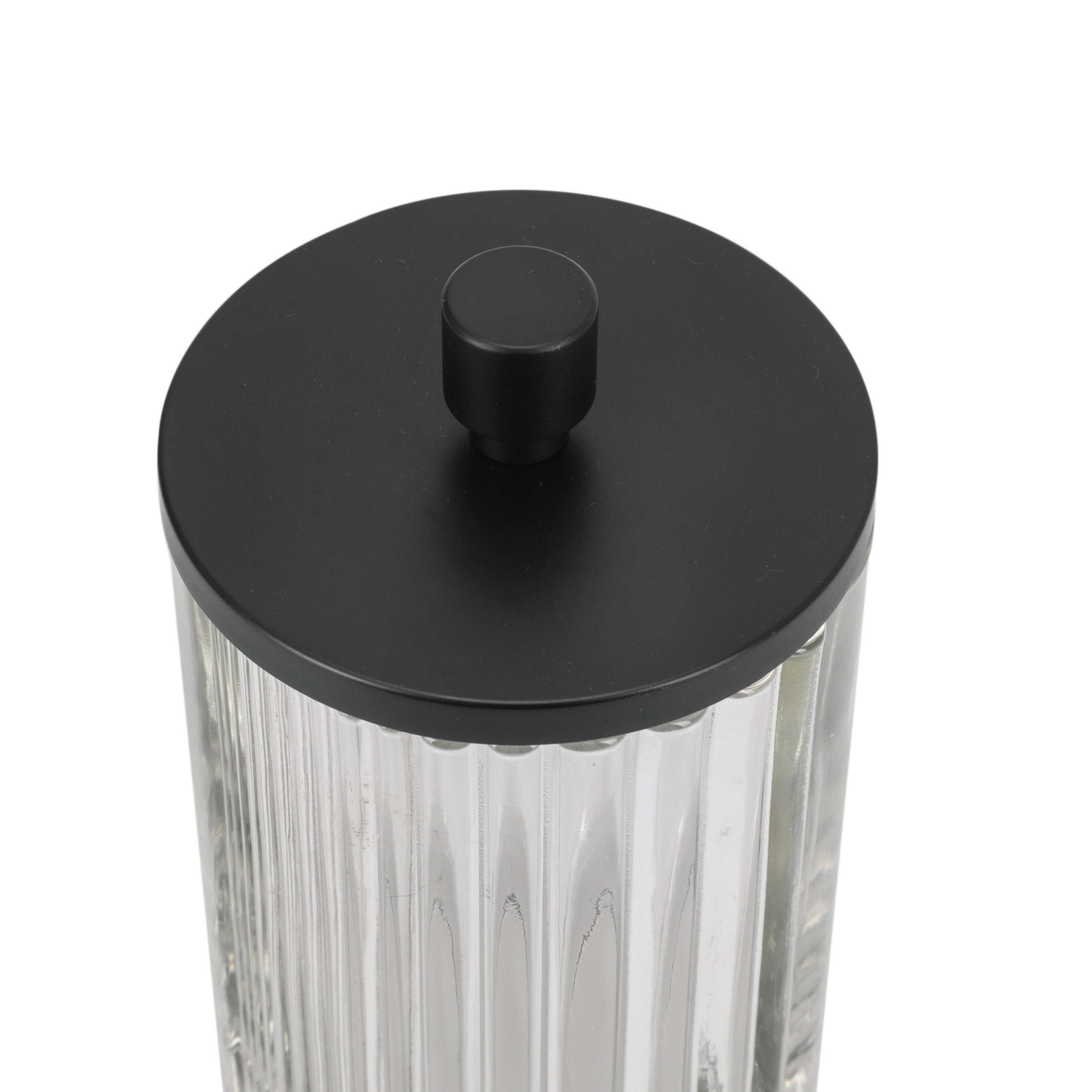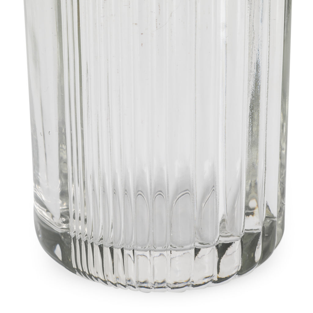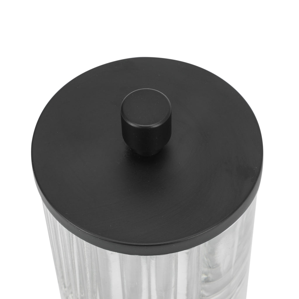 Details: Glass jar featuring a ribbed exterior and black metal top. Dimensions: 6" H x 4" D