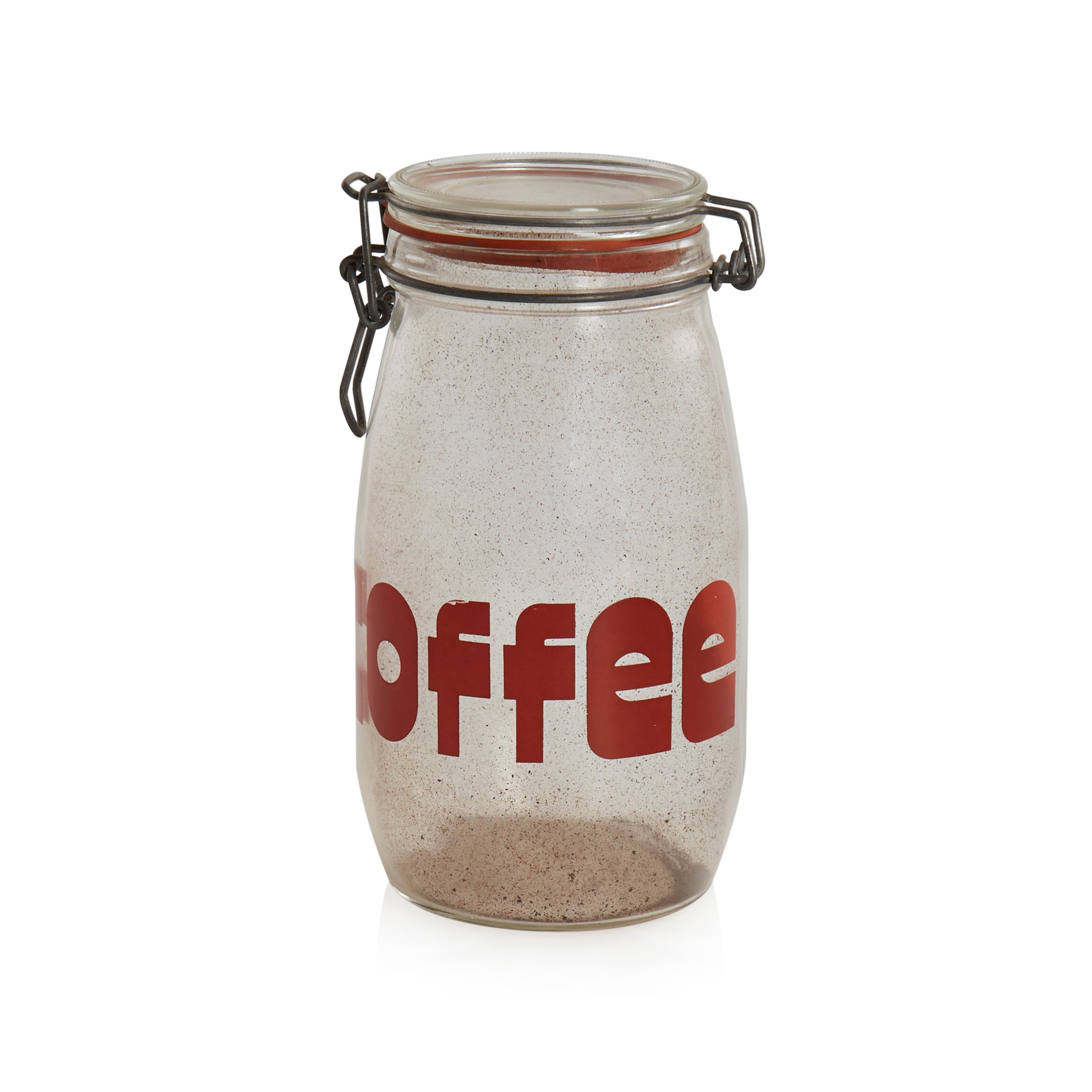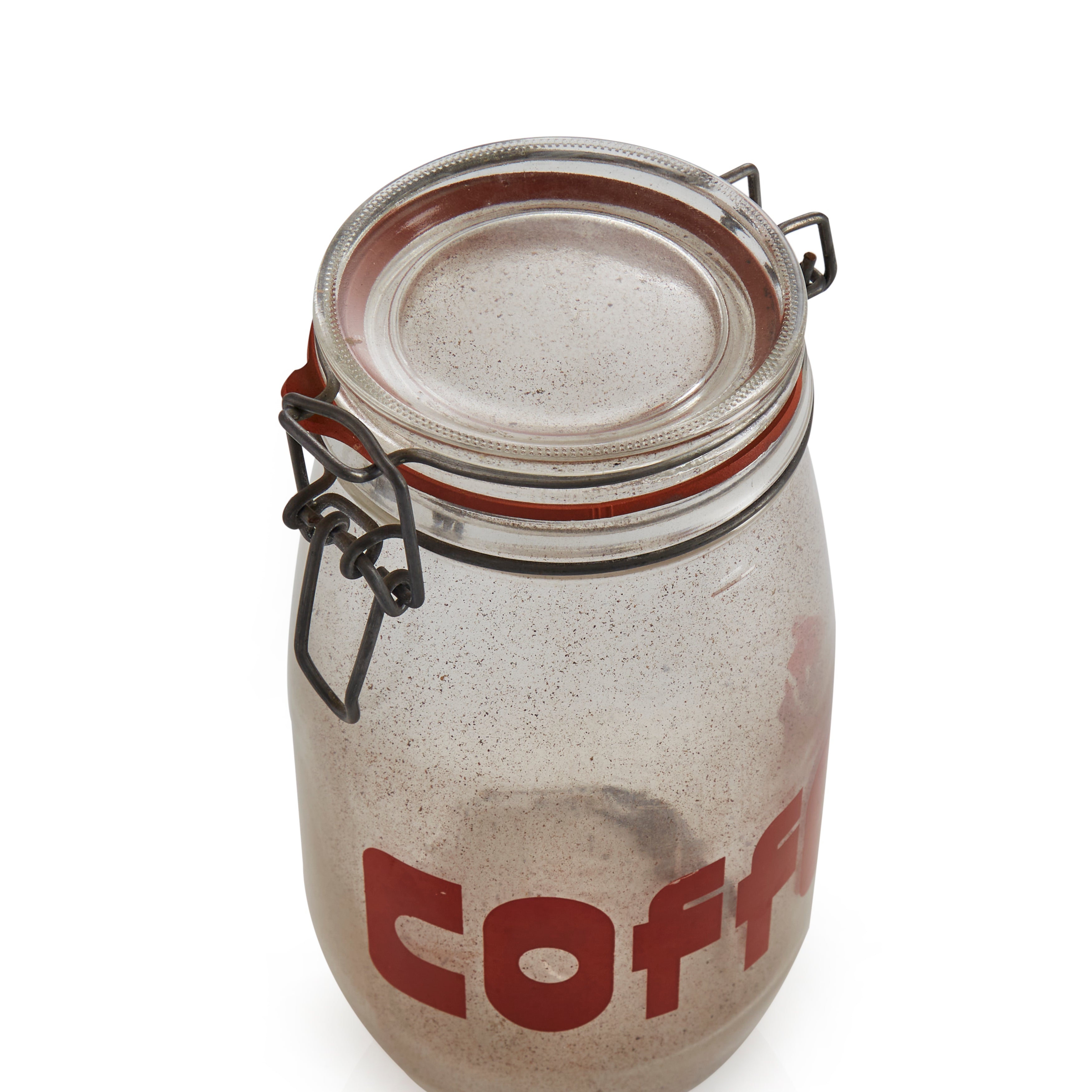 Clear glass flip top jar with red "coffee" label Dimensions: 9" H x 5" D Set of 6 available