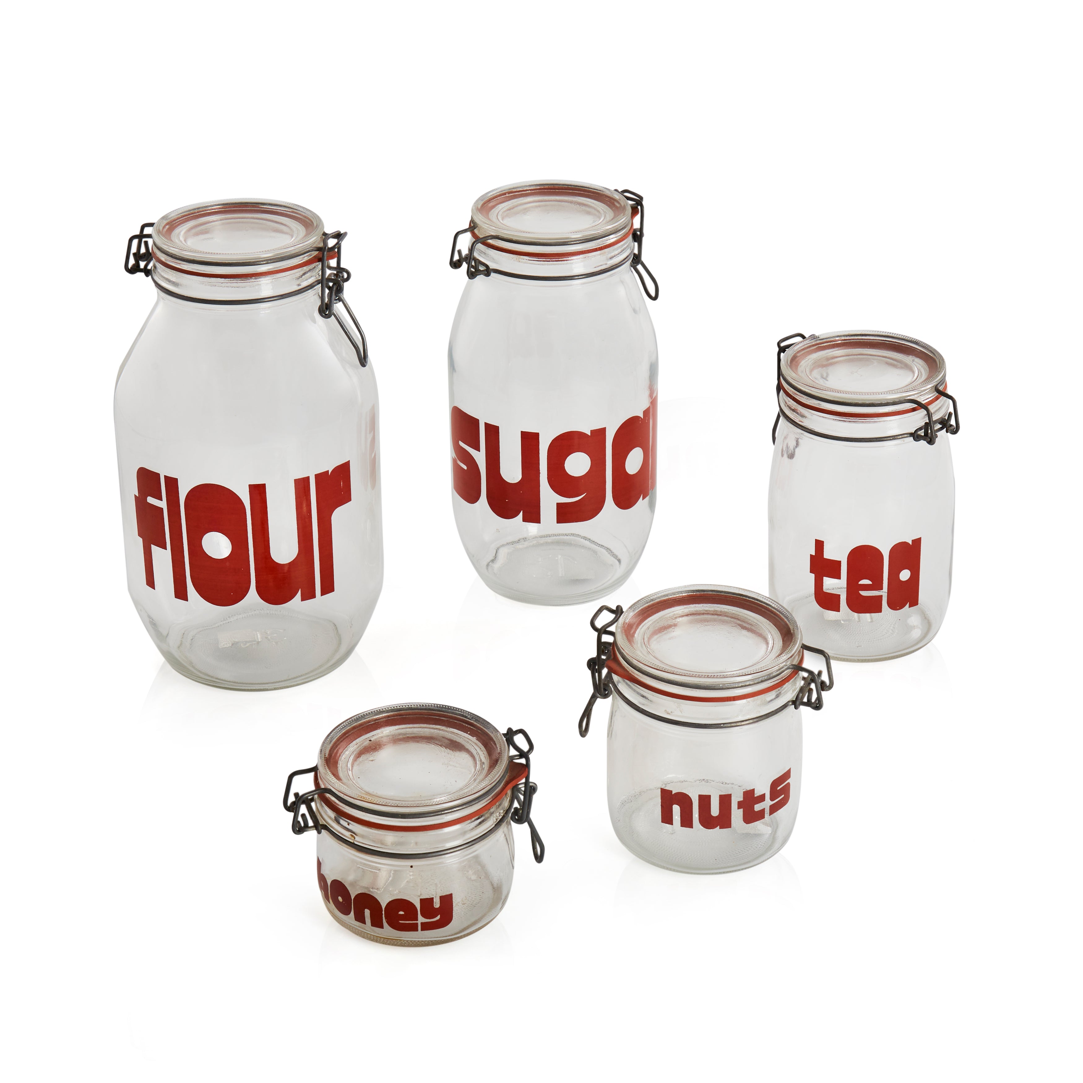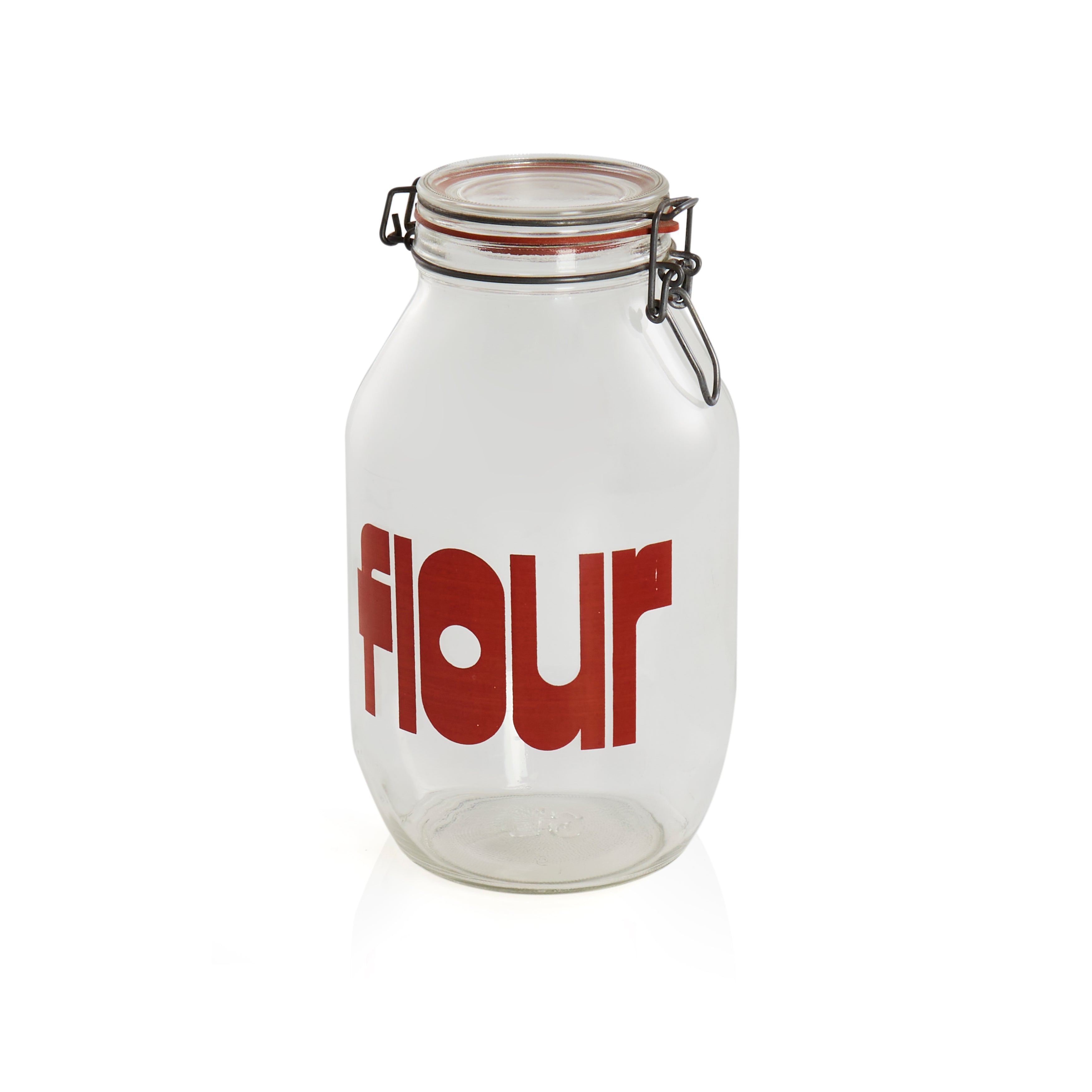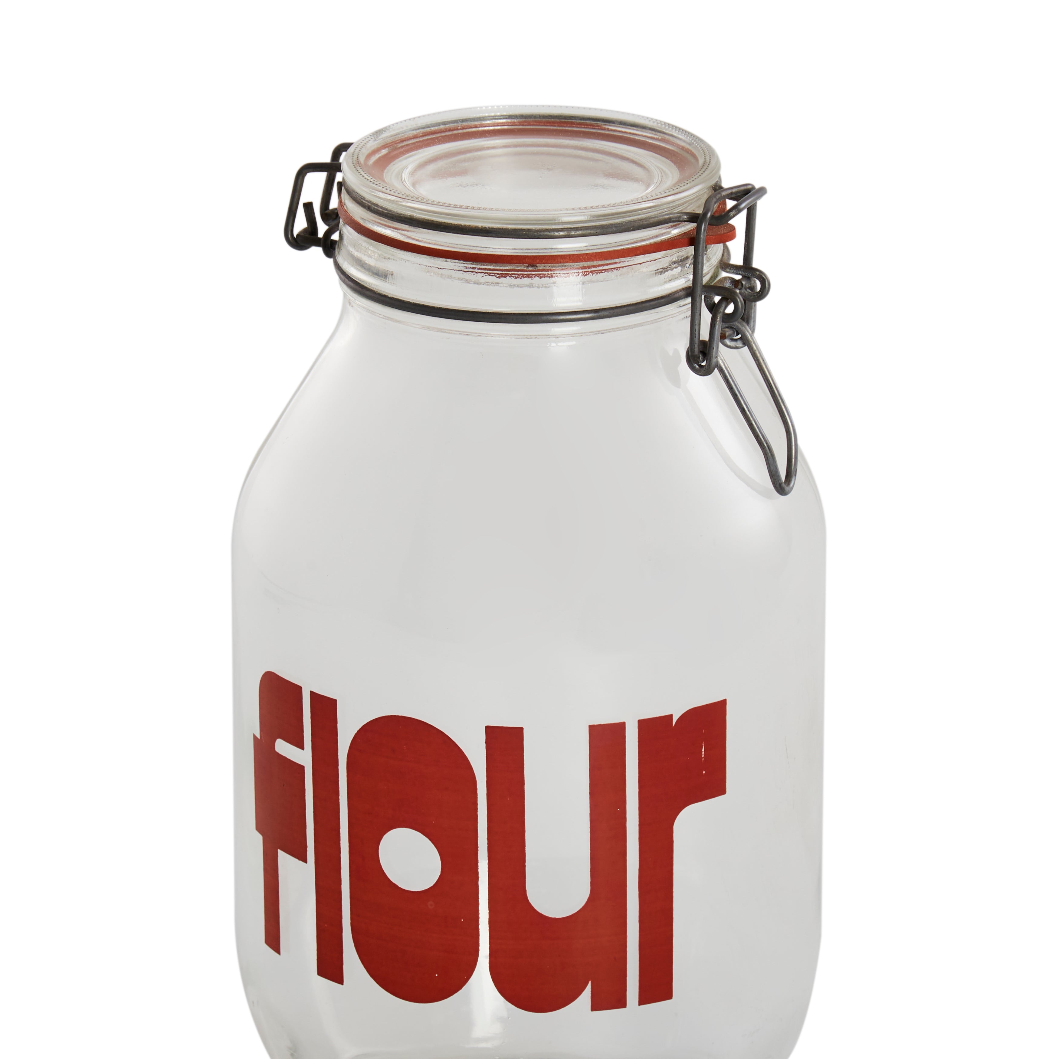 Clear glass flip top jar with red "flour" label Dimensions: 10" H x 6" D Set of 6 available