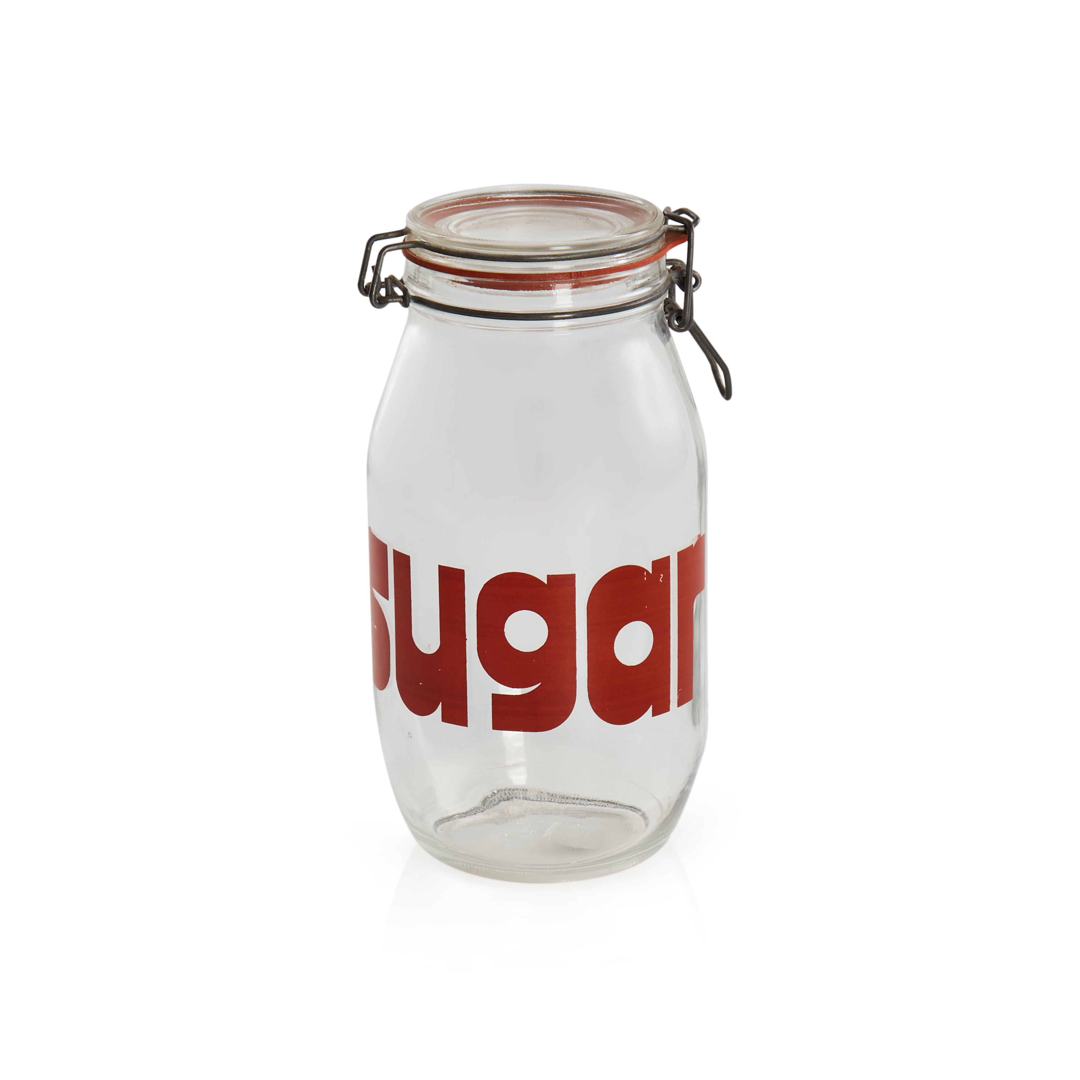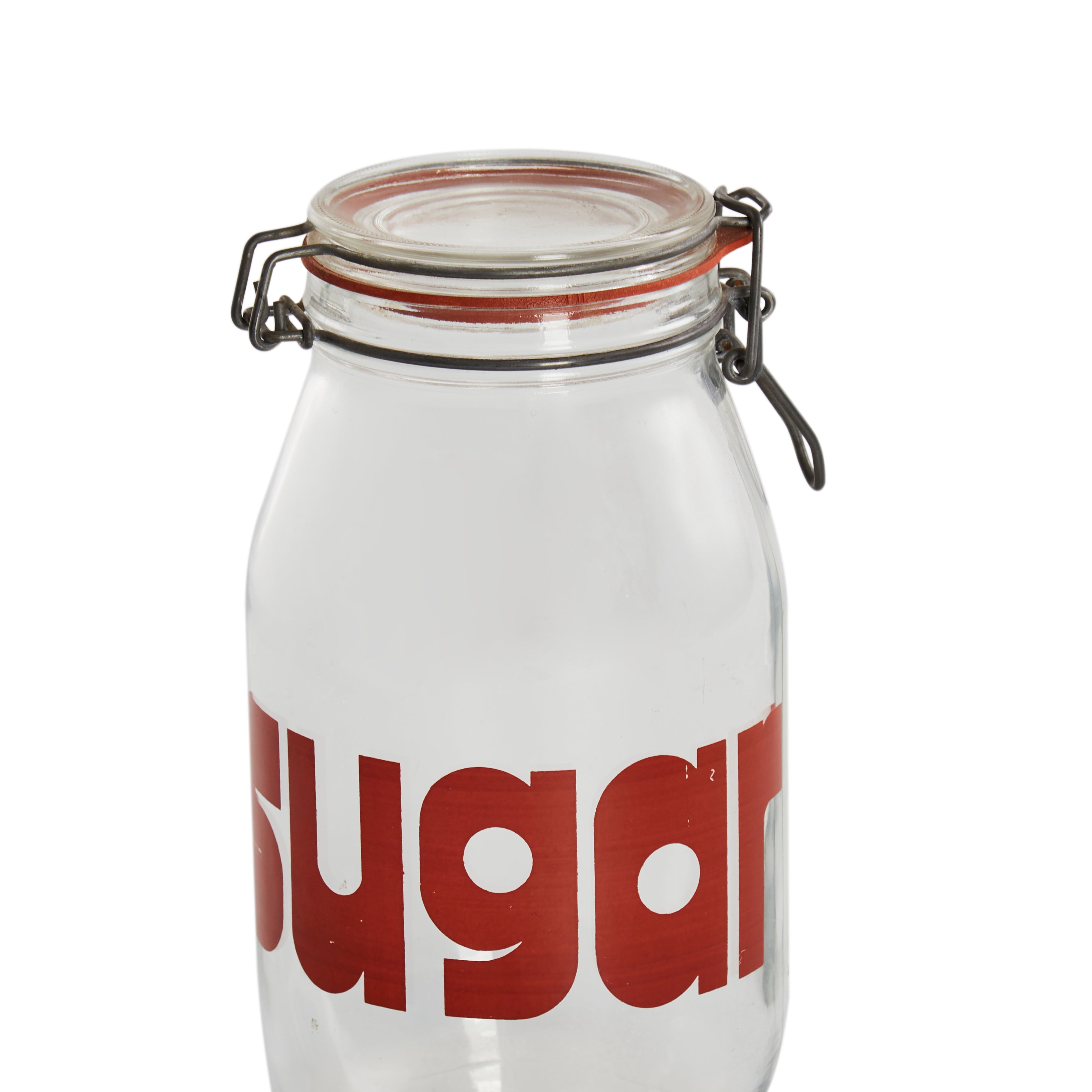 Clear glass flip top jar with red "sugar" label Dimensions: 10" H x 5" D Set of 6 available