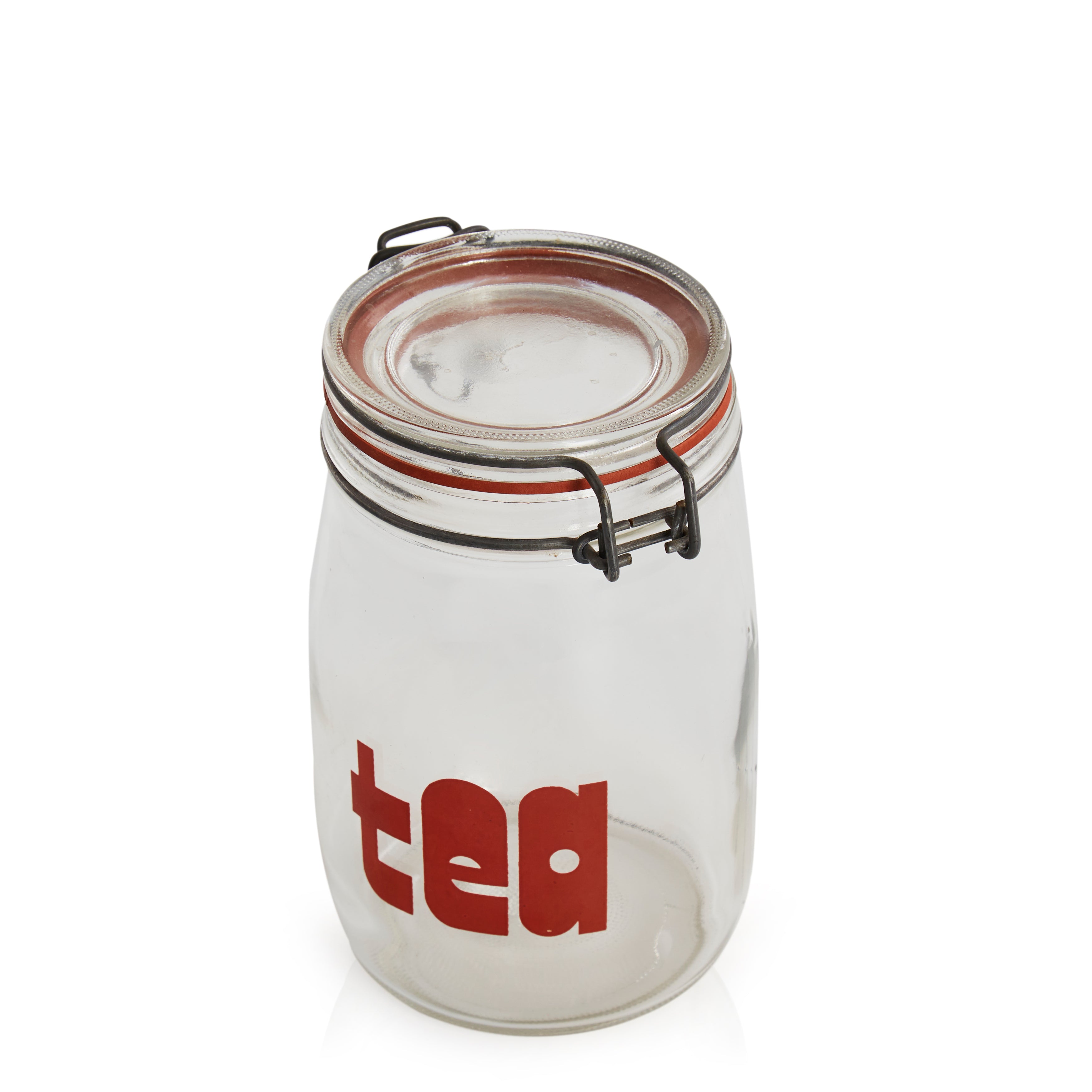 Clear glass flip top jar with red "tea" label Dimensions: 7" H x 5" D Set of 6 available