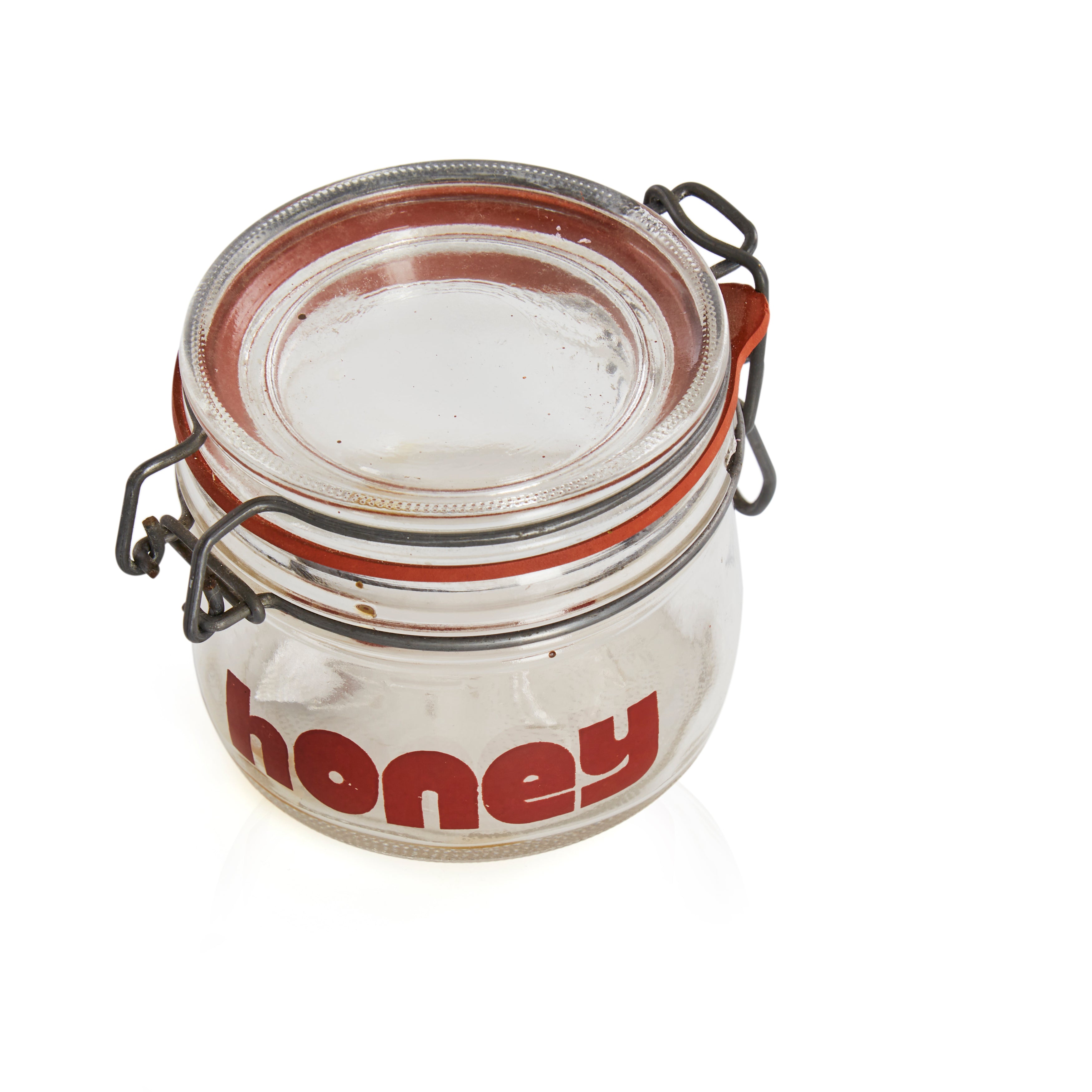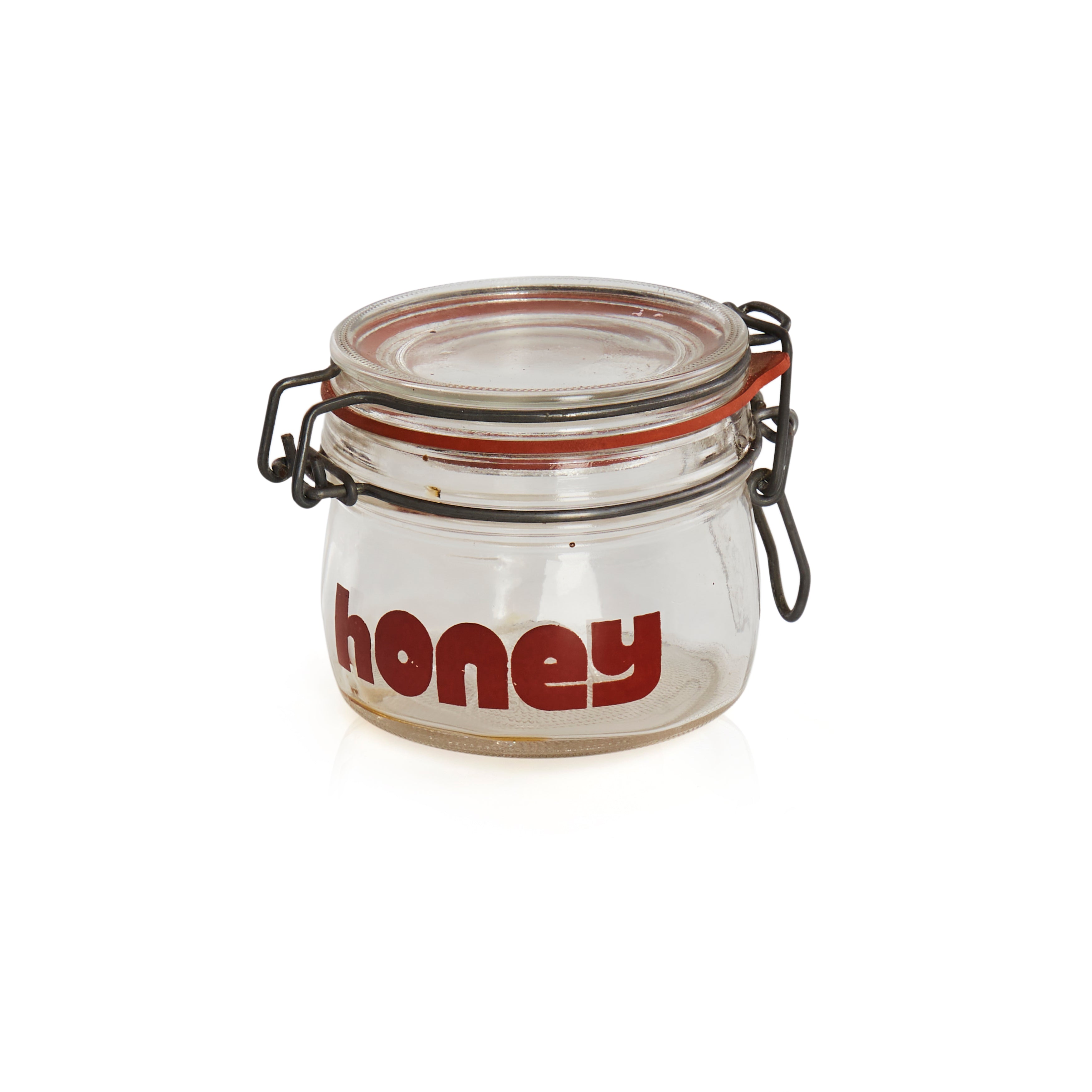 Clear glass flip top jar with red "honey" label Dimensions: 4" H x 5" D Set of 6 available