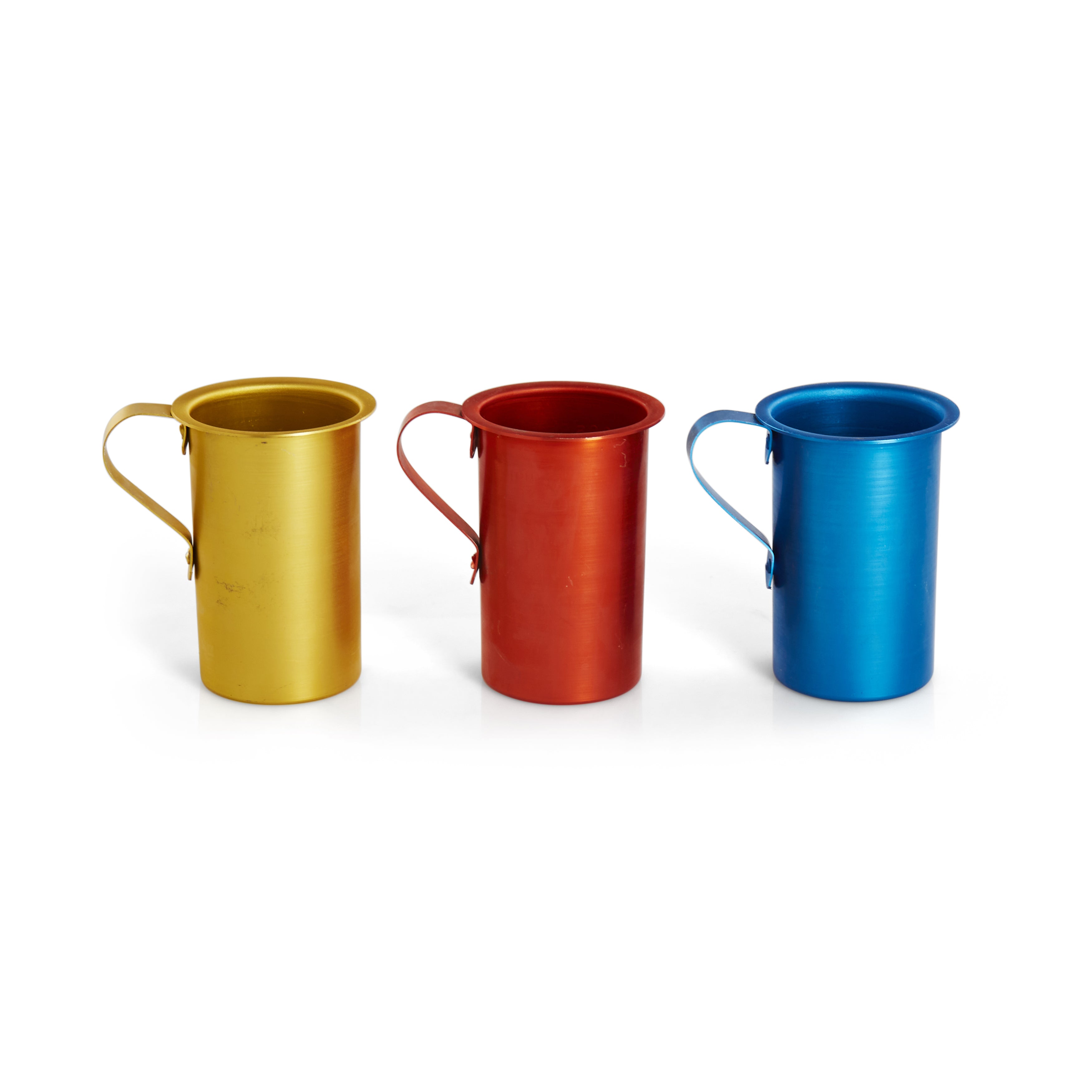 Details: Red, Blue, and Yellow/Gold aluminum camping mugs Dimensions: 5" H x 4" W x 3" D *Price per mug