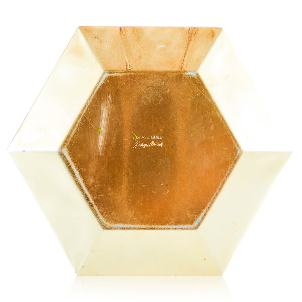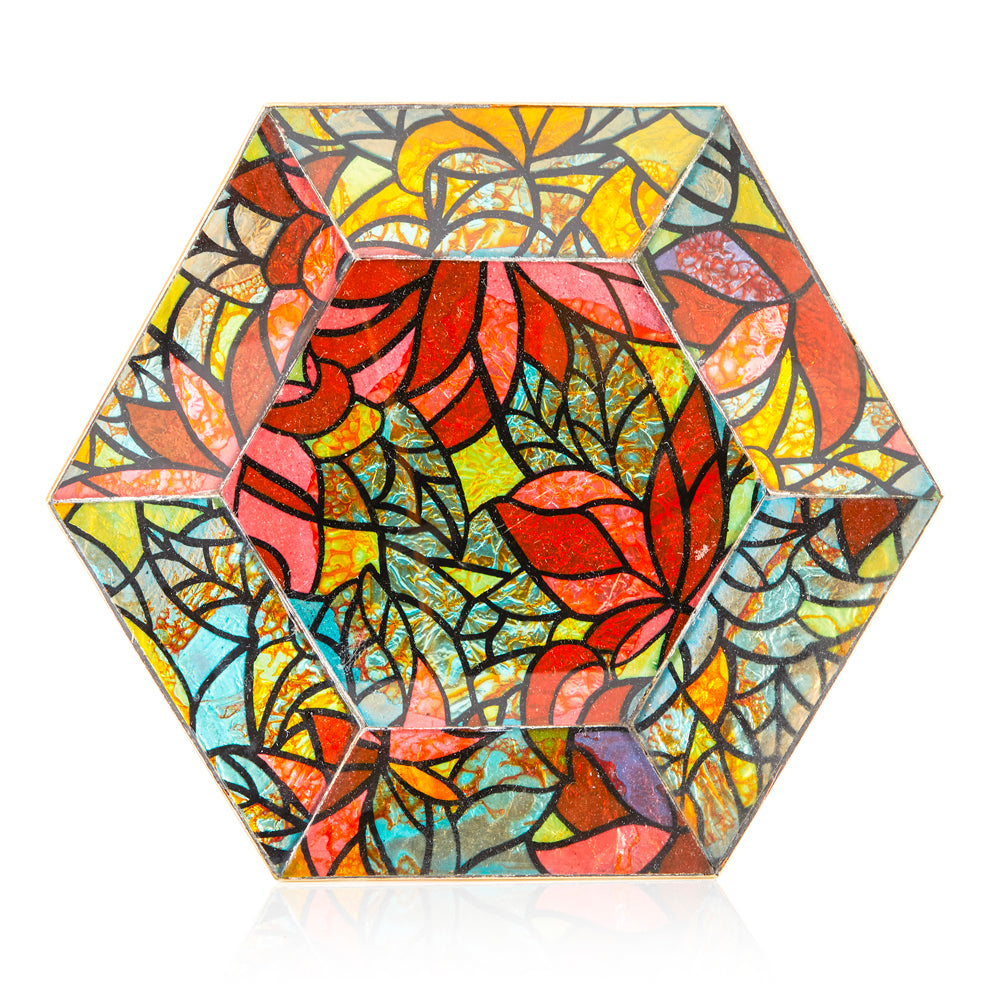 Details: Stain glass plate with flower designs Dimensions: 1" H x 9" W x 10" D Quantity: 1