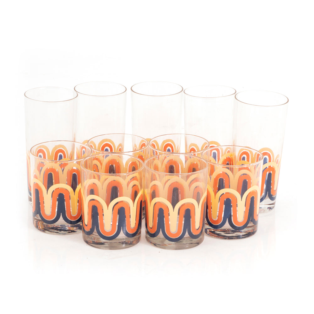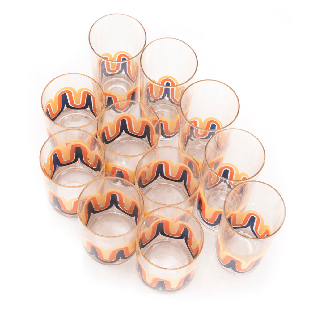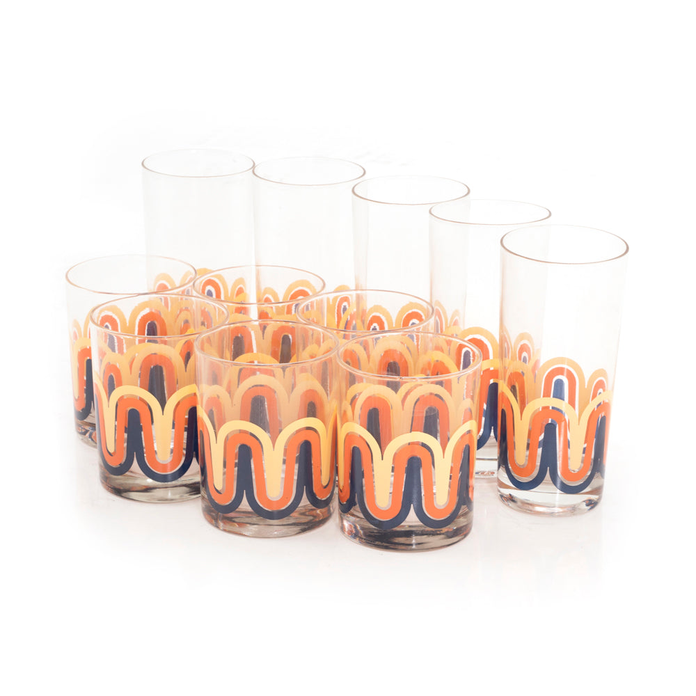 Details: Set of colored drinking glasses with gold ring at the top. Dimensions: 5.5" H x 3" W x 3" D