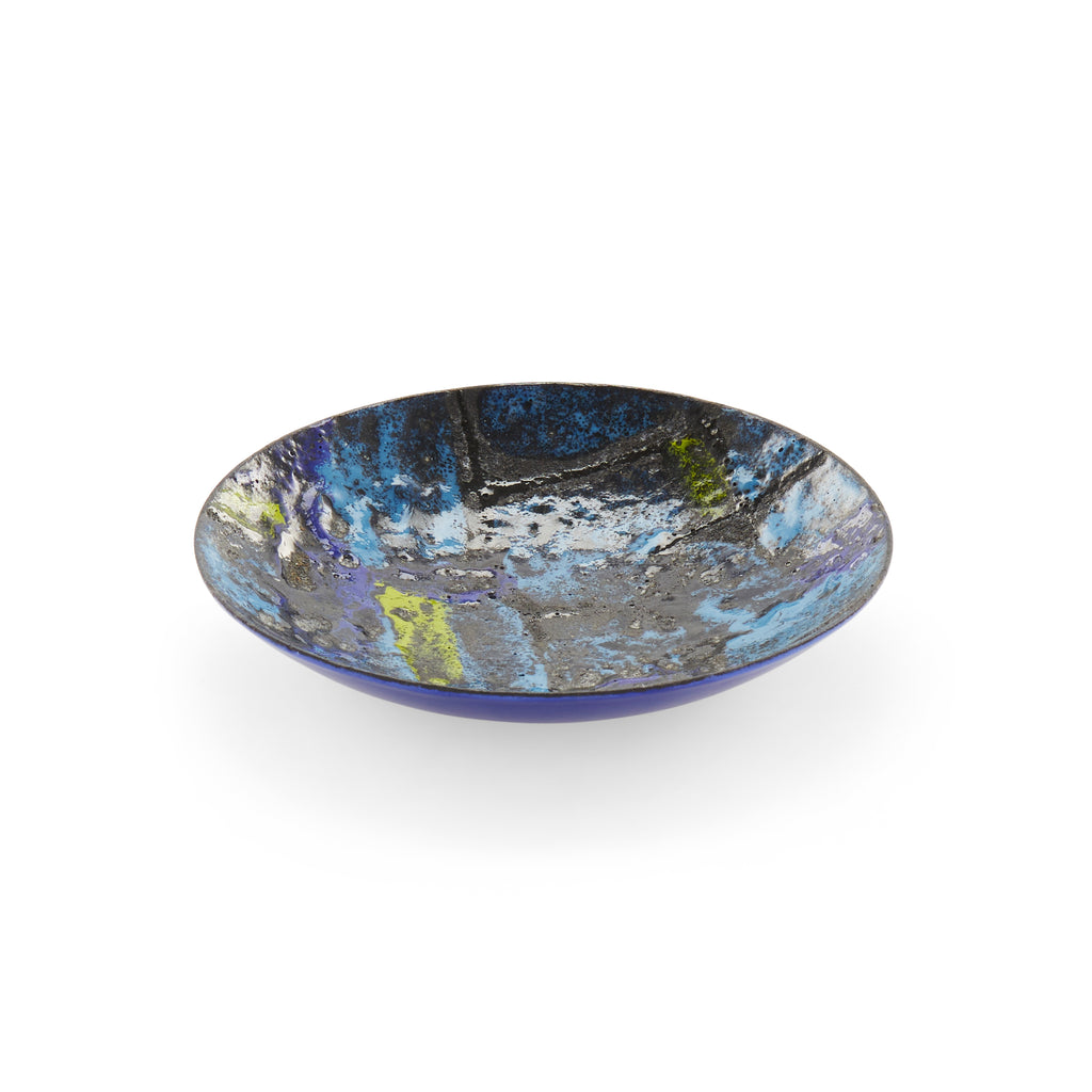 Details: Abstract blue, black, and yellow ceramic plate