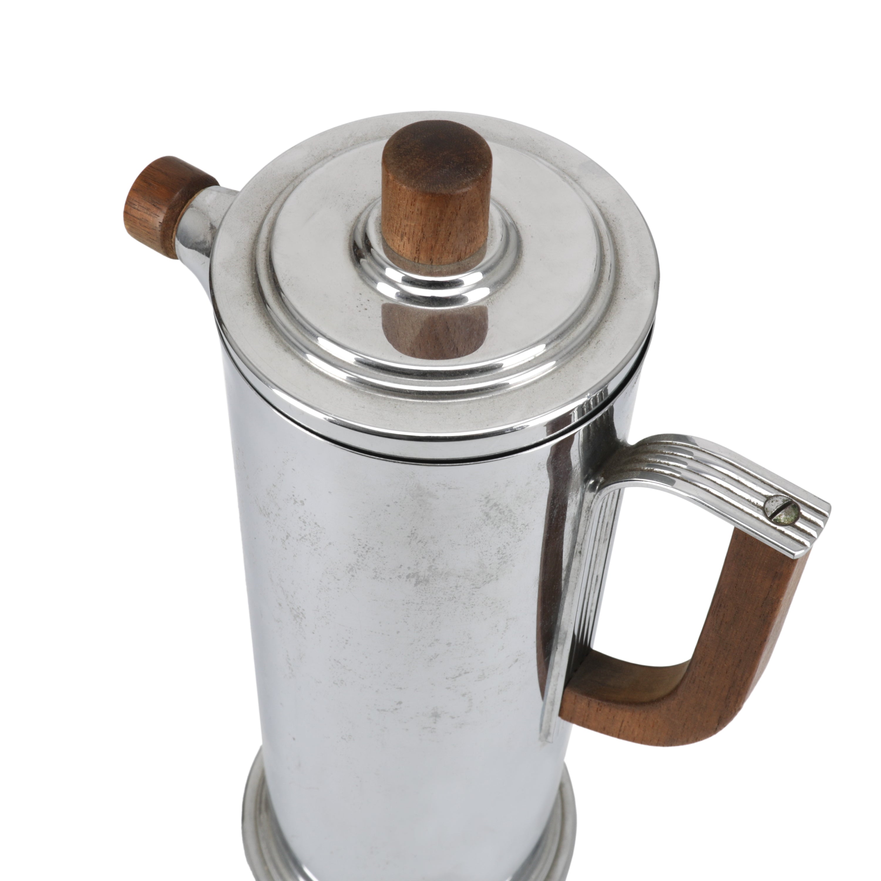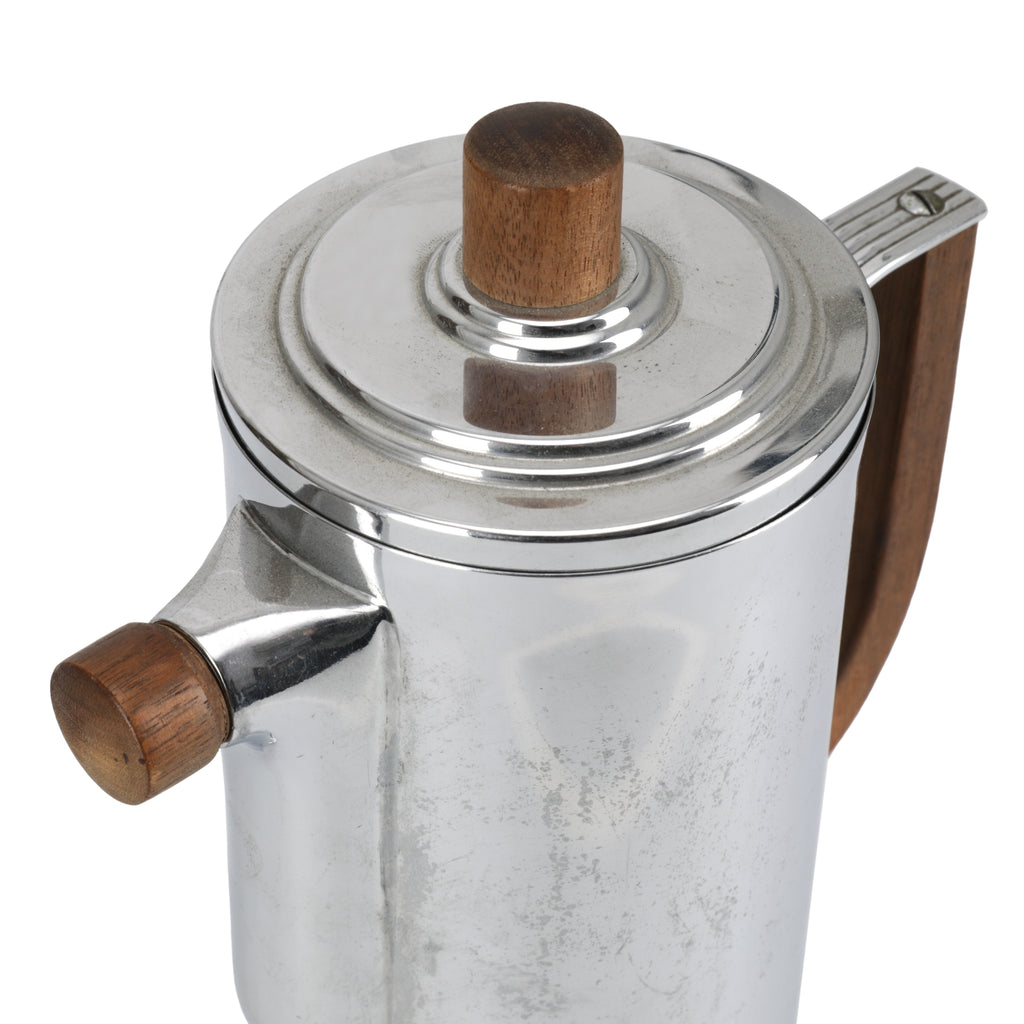 Details: Vintage chrome kettle with wooden handle.