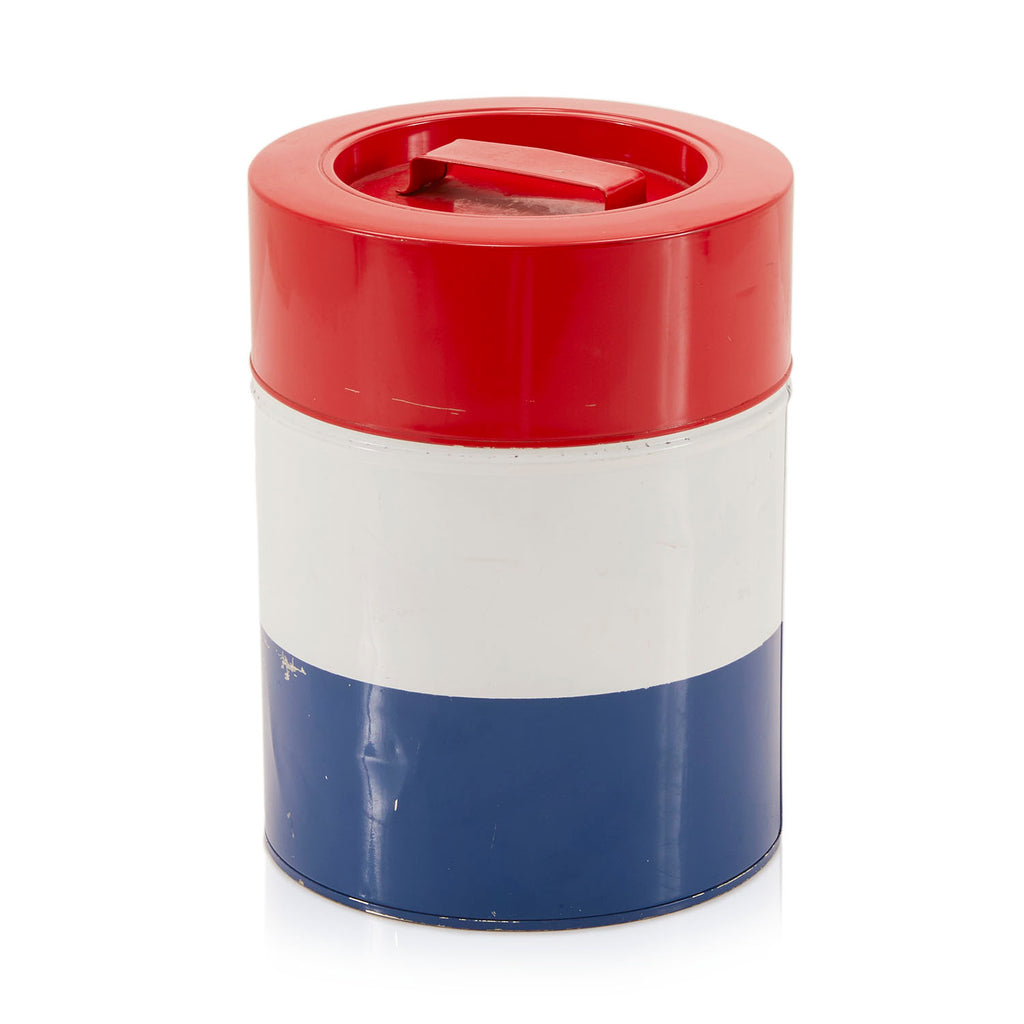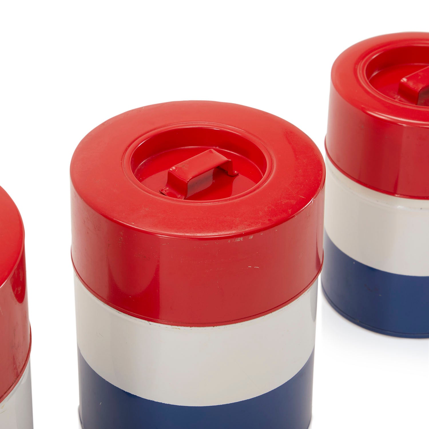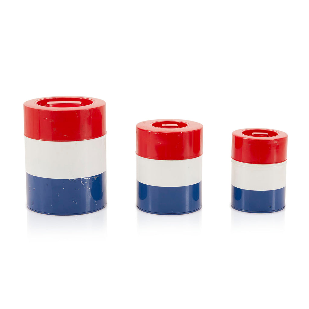 Details: Set of 3 red, white and blue striped tin canisters