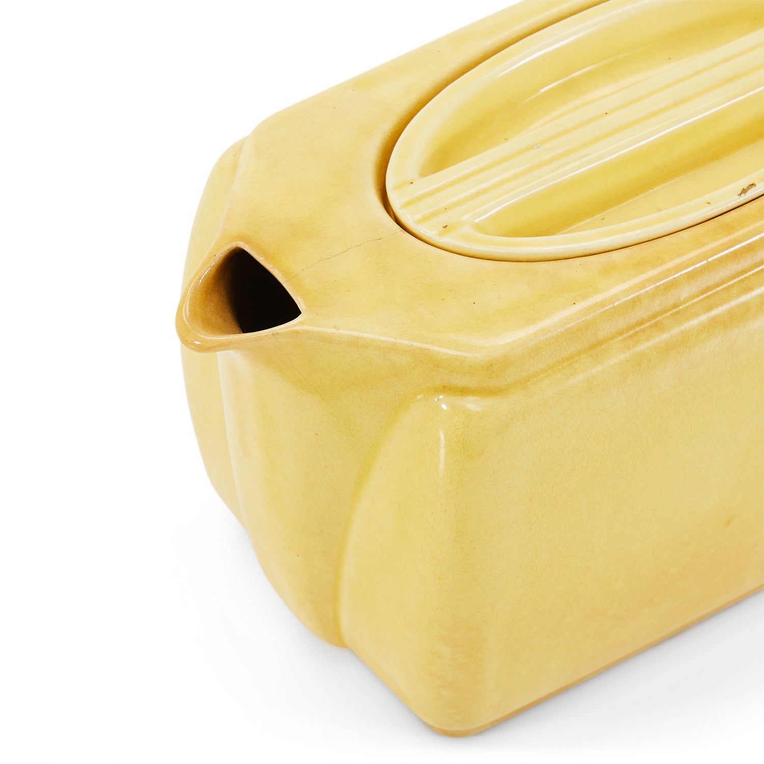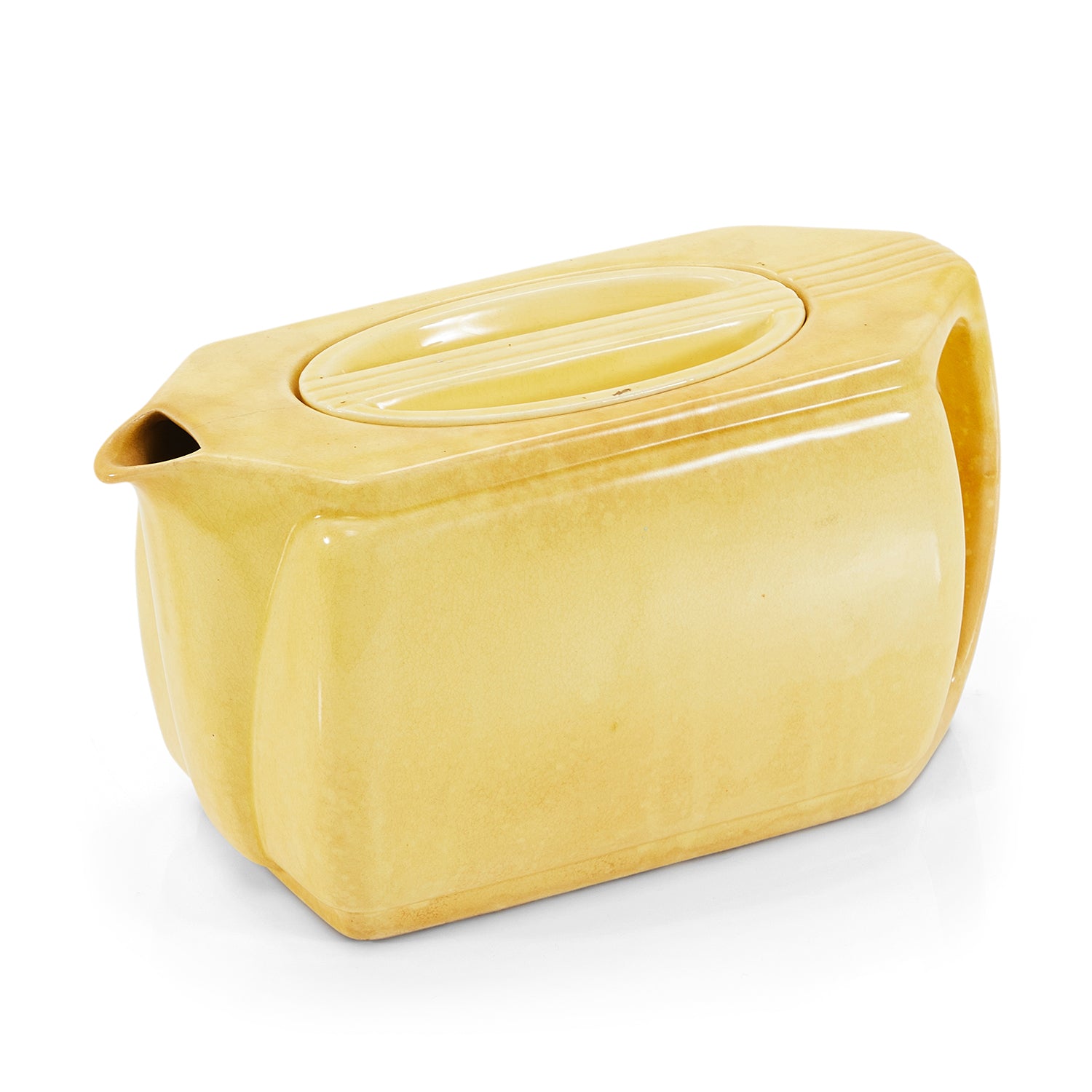 Details: Stout ceramic pitcher with a light yellow glaze and a modern design