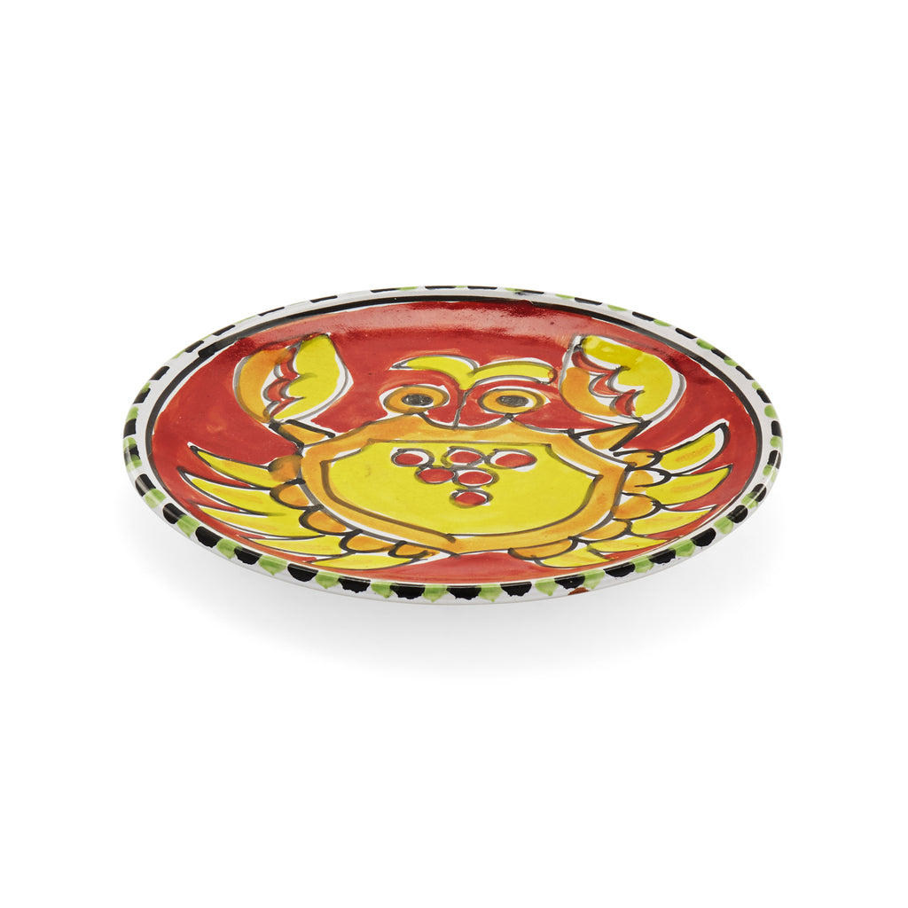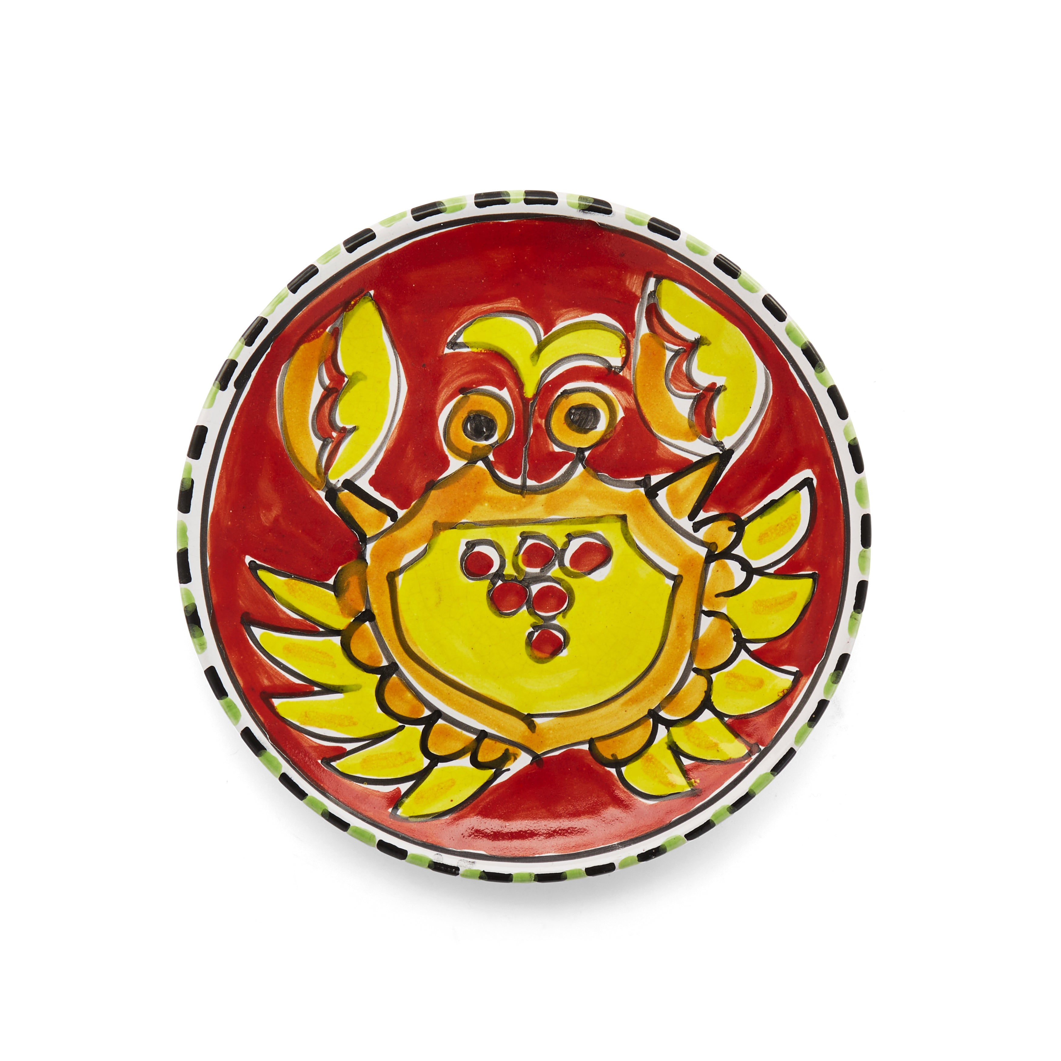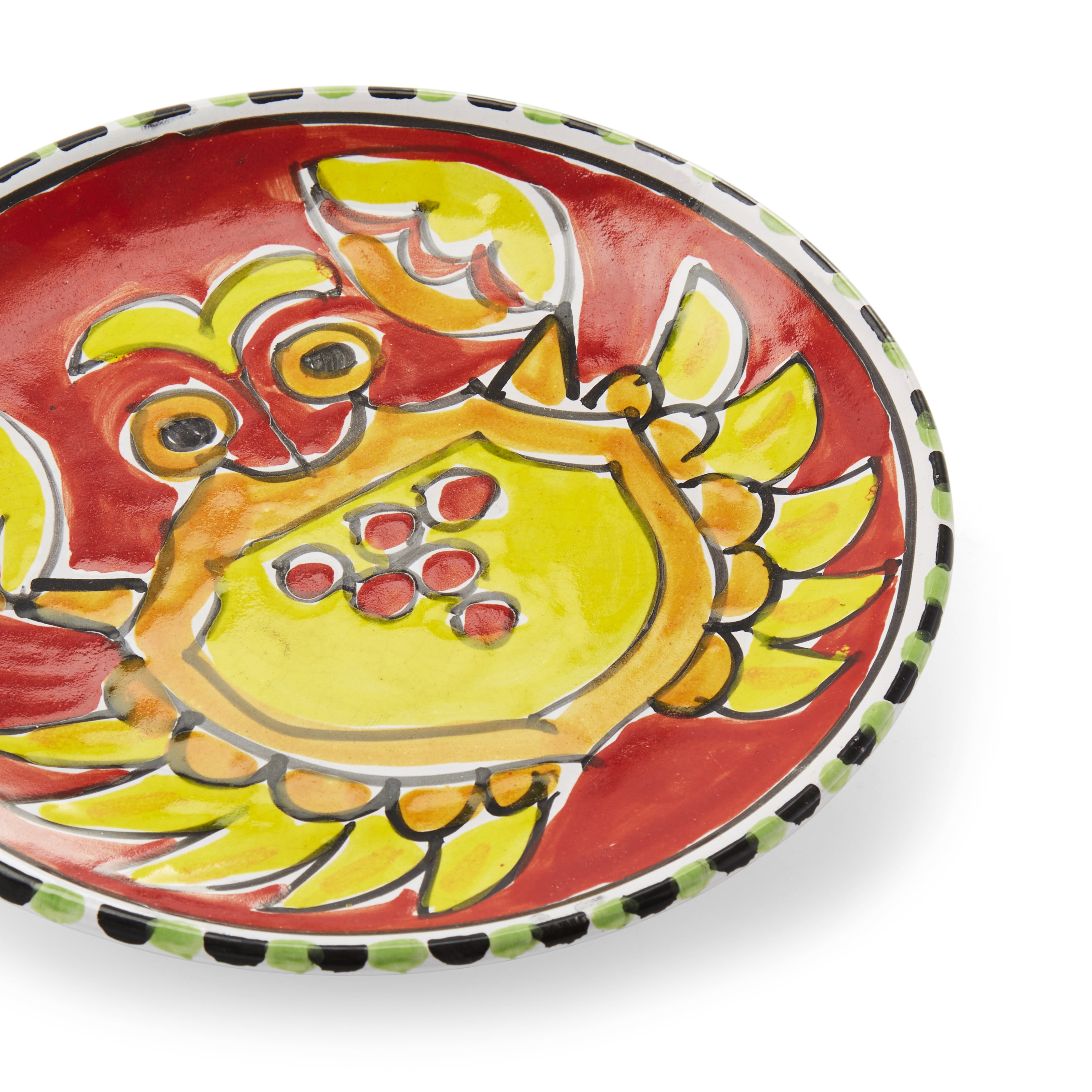 Details: Red ceramic plates and bowls with swirl glaze design and white border Dimensions:Bowls: 2" H x 7" W x 7" D; Quantity - 3...