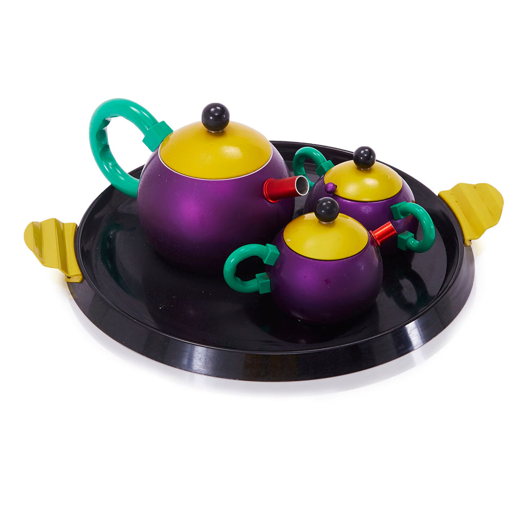 Details: Memphis / 80s style tea set with sugar dish, creamer, and tea pot (all have yellow lids) - plus black tray with yellow handles Dimensions: 14"...