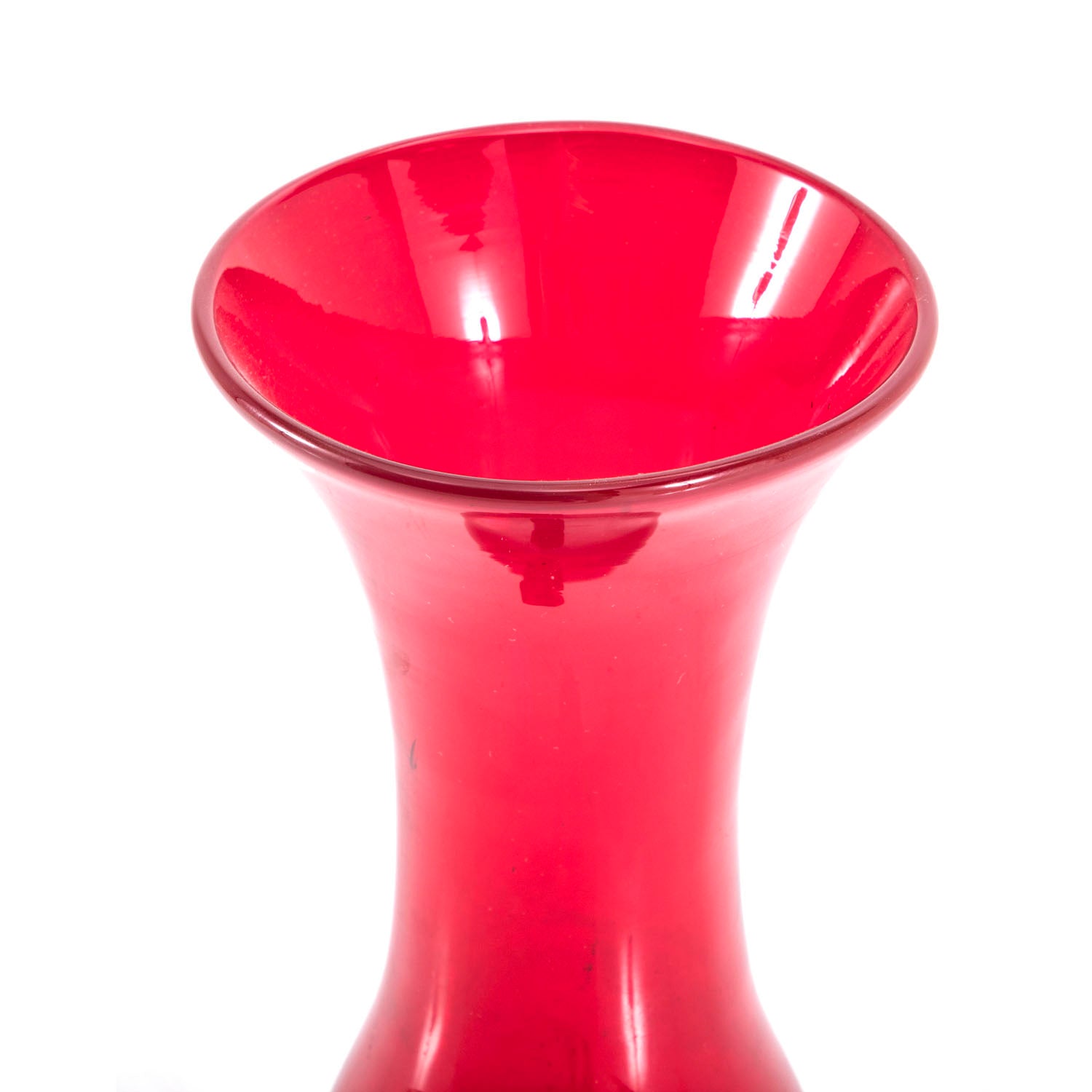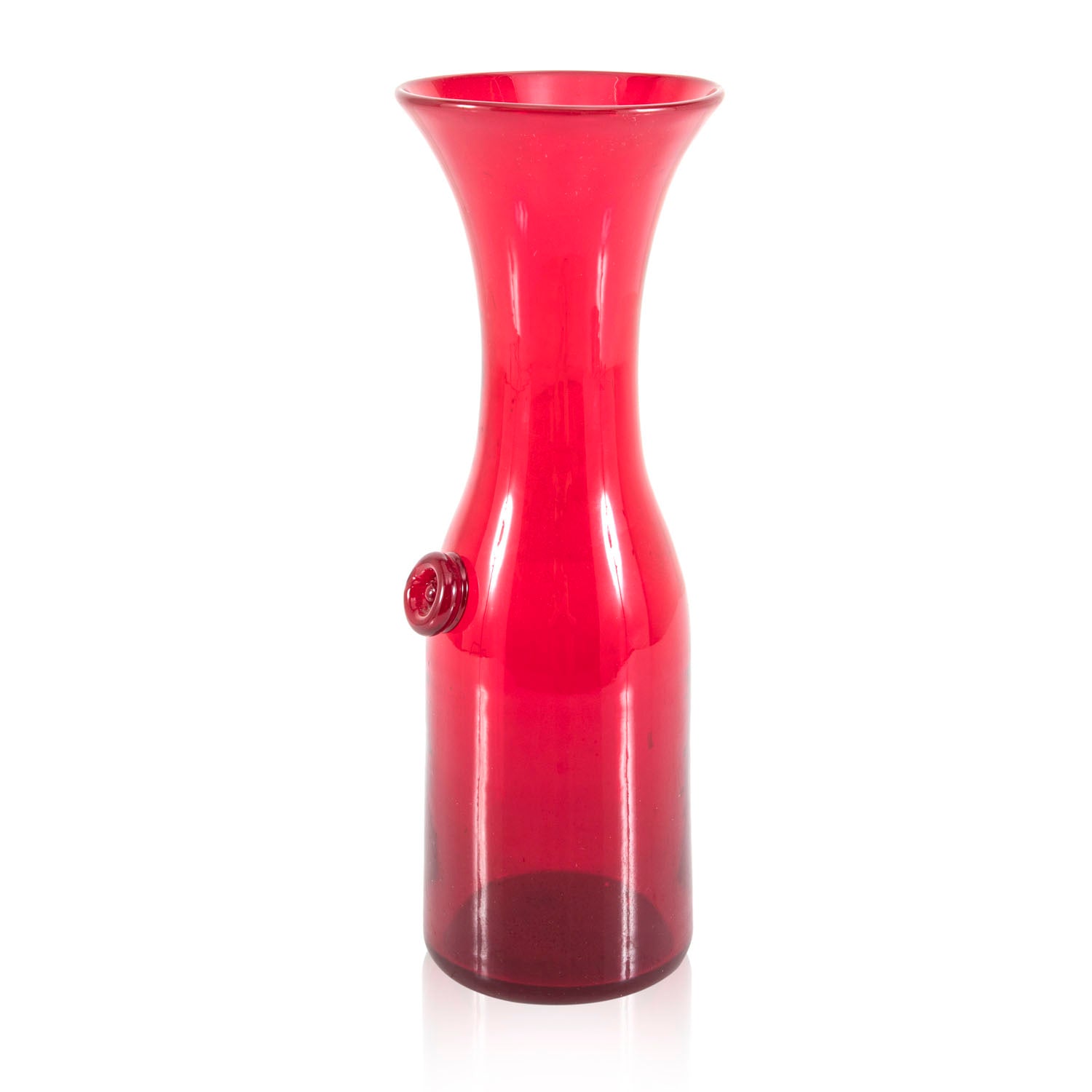 Details: Red glass carafe style vase Dimensions: 12" H x 4.5" W x 4.5" D
