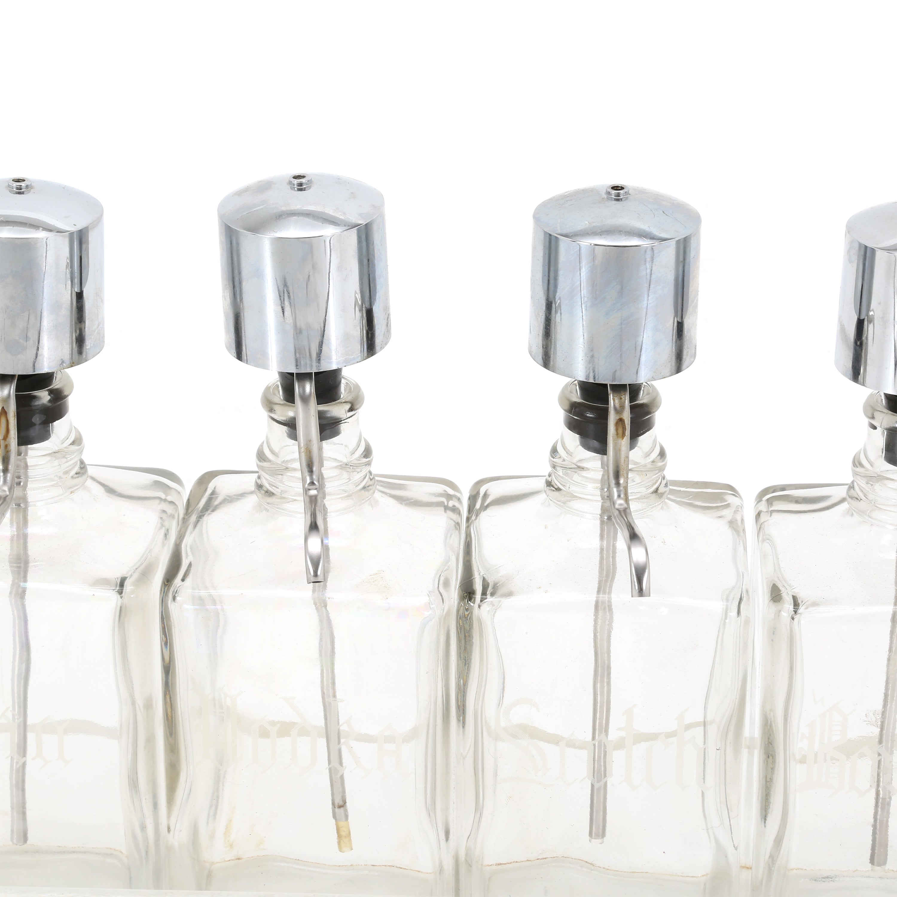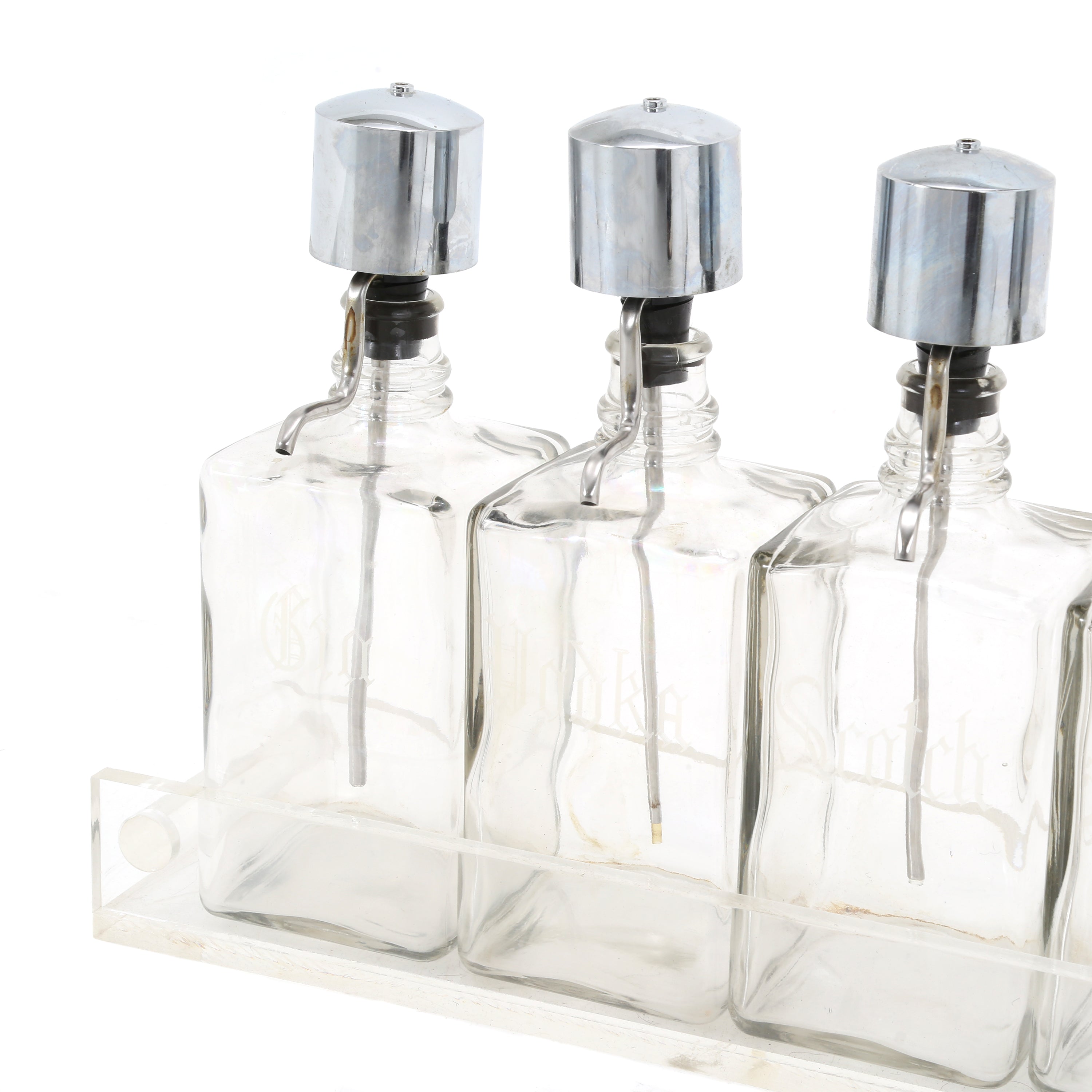 Details: Clear glass rectangular bottle with pump attachments. Lucite tray base. Dimensions: 11" H x 17" W x 4.5" D