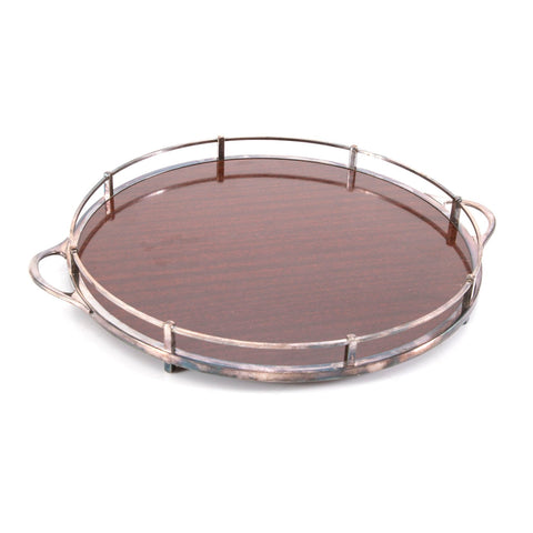 Details: Round wood tray with lacquer finish and metal frame Dimensions: 1.75" H x 16.5" W x 14" D Quantity: 1
