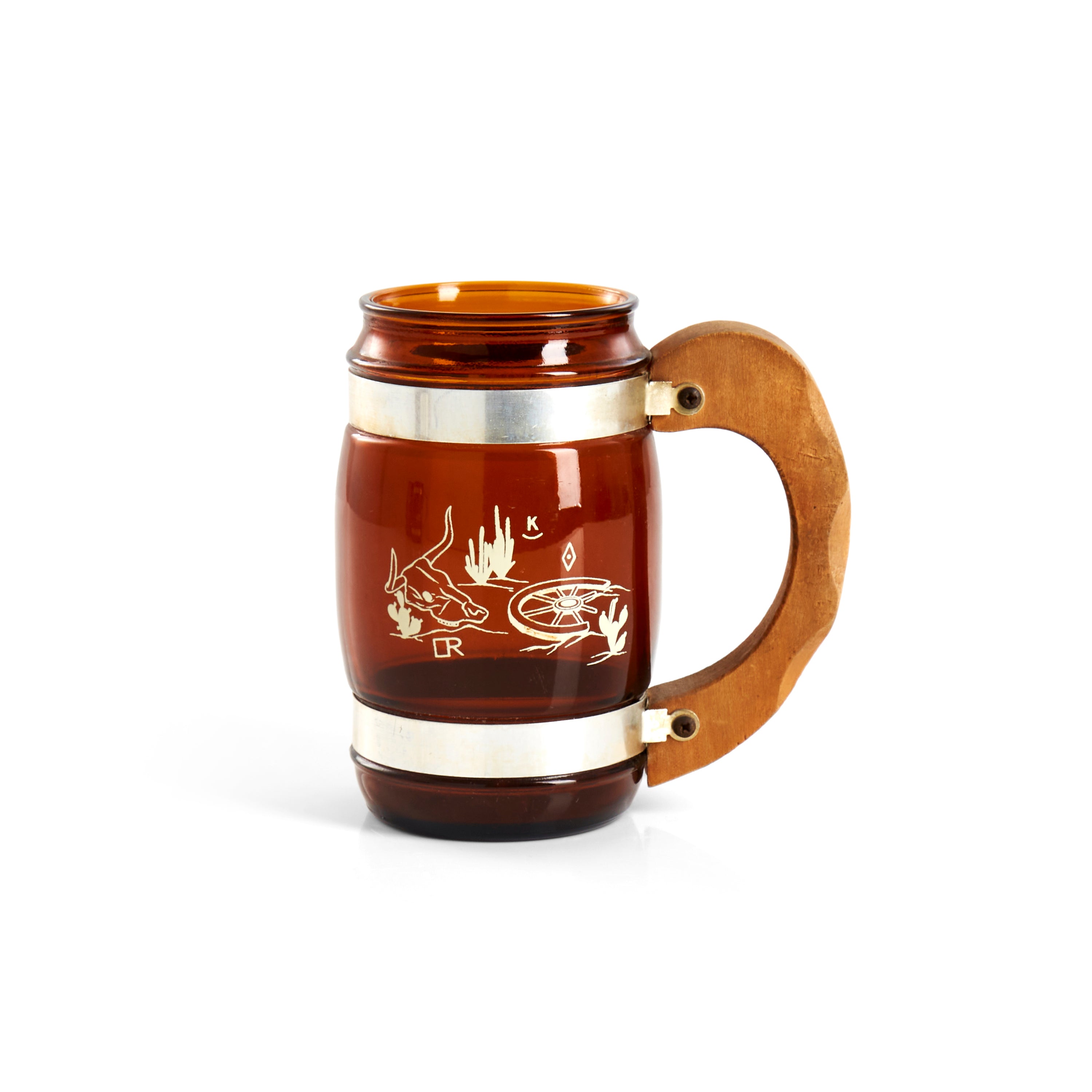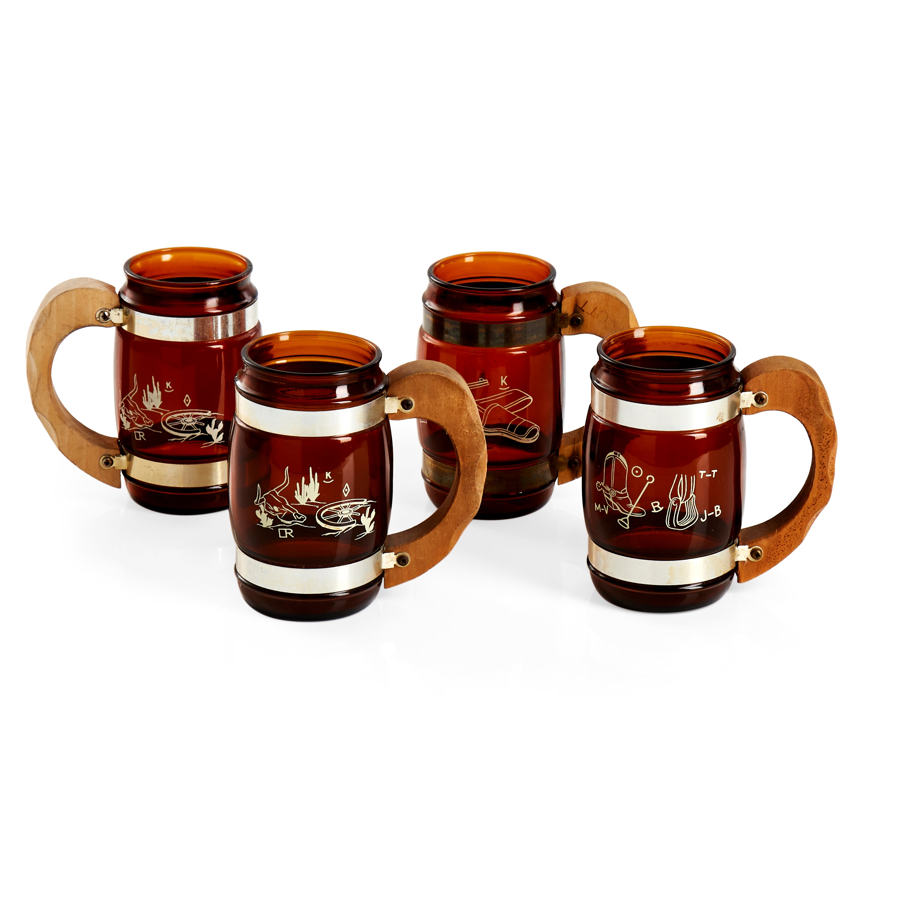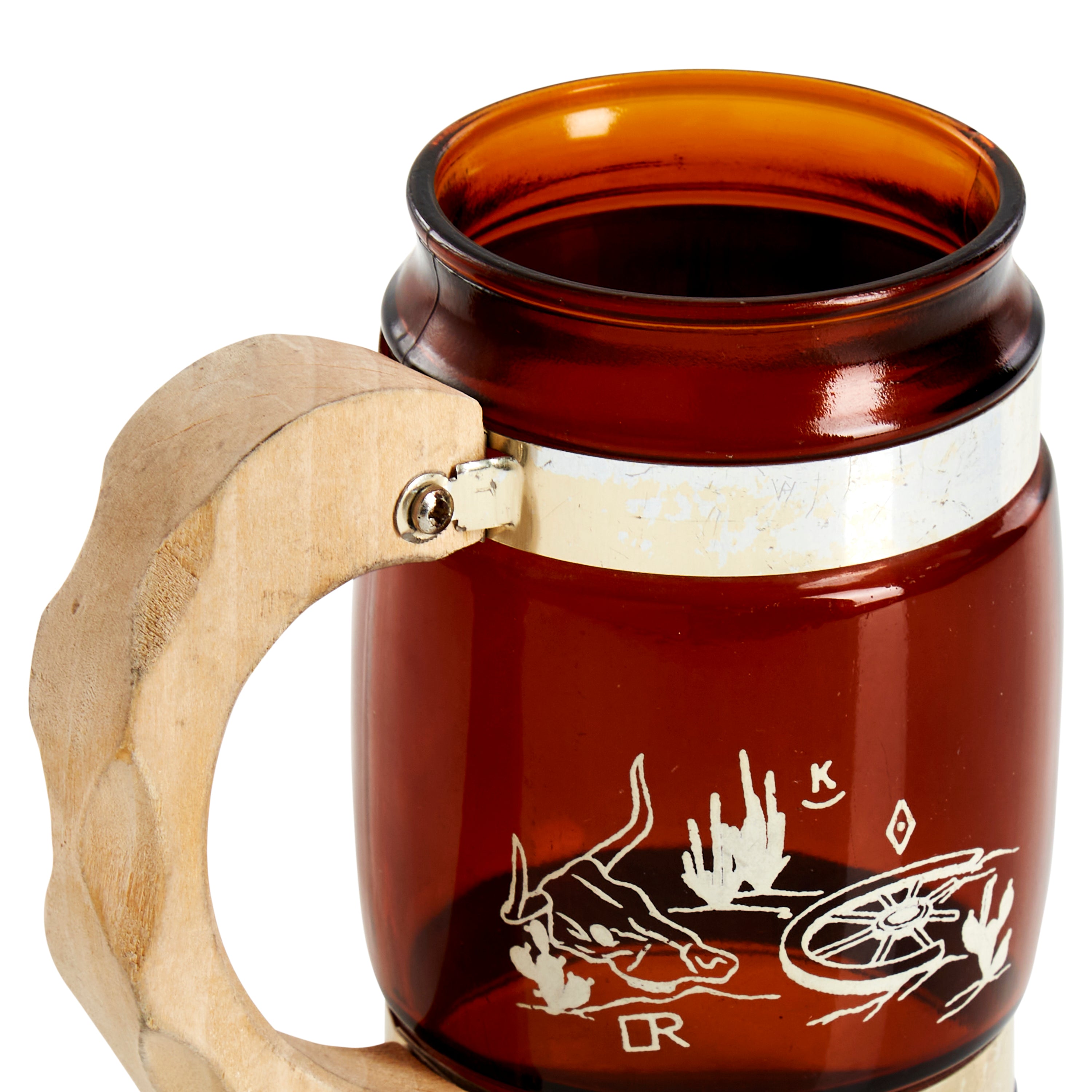 Details: Set of four amber glass mugs with printed cowboy decals and wooden handles Dimensions: 5" High x 5" Wide (each)