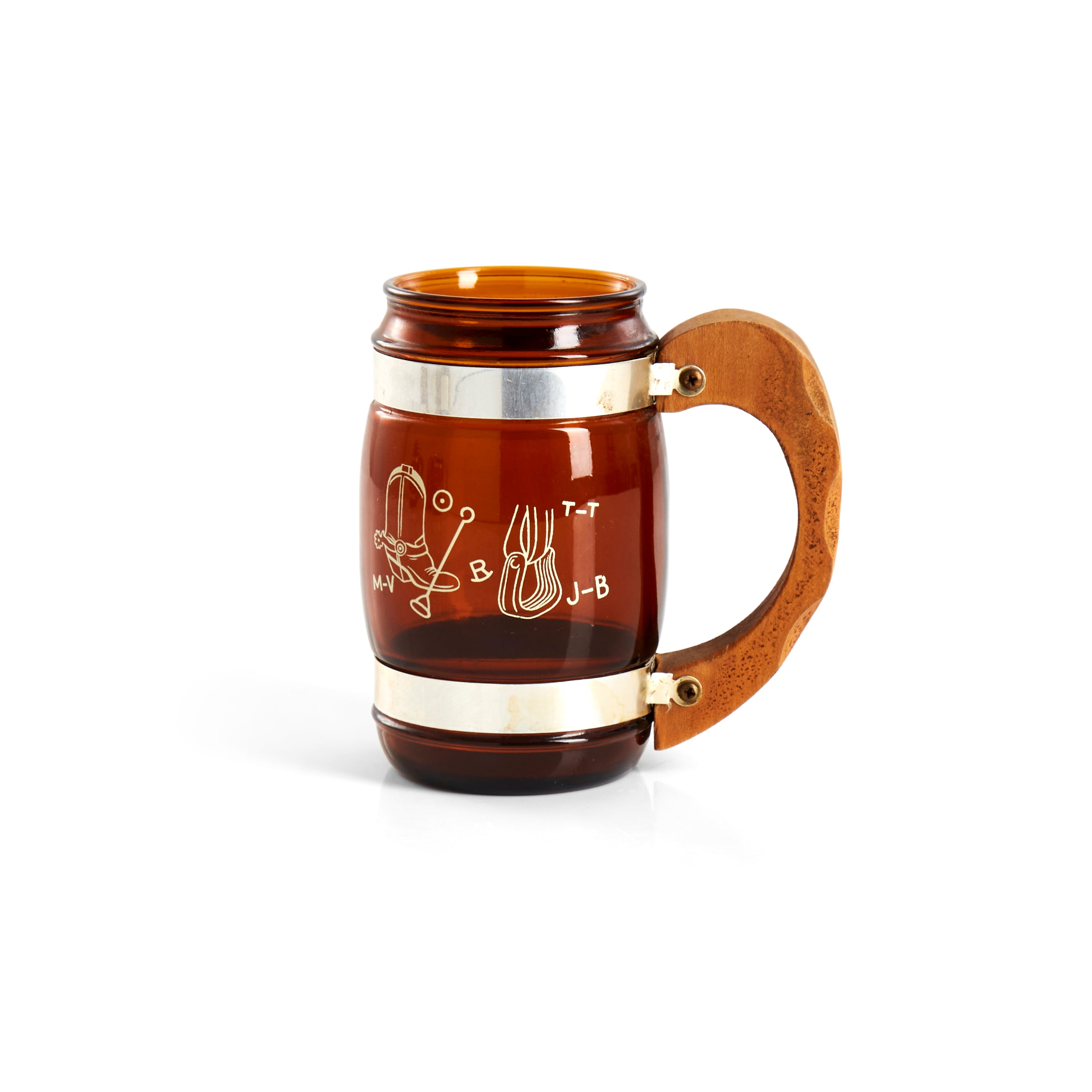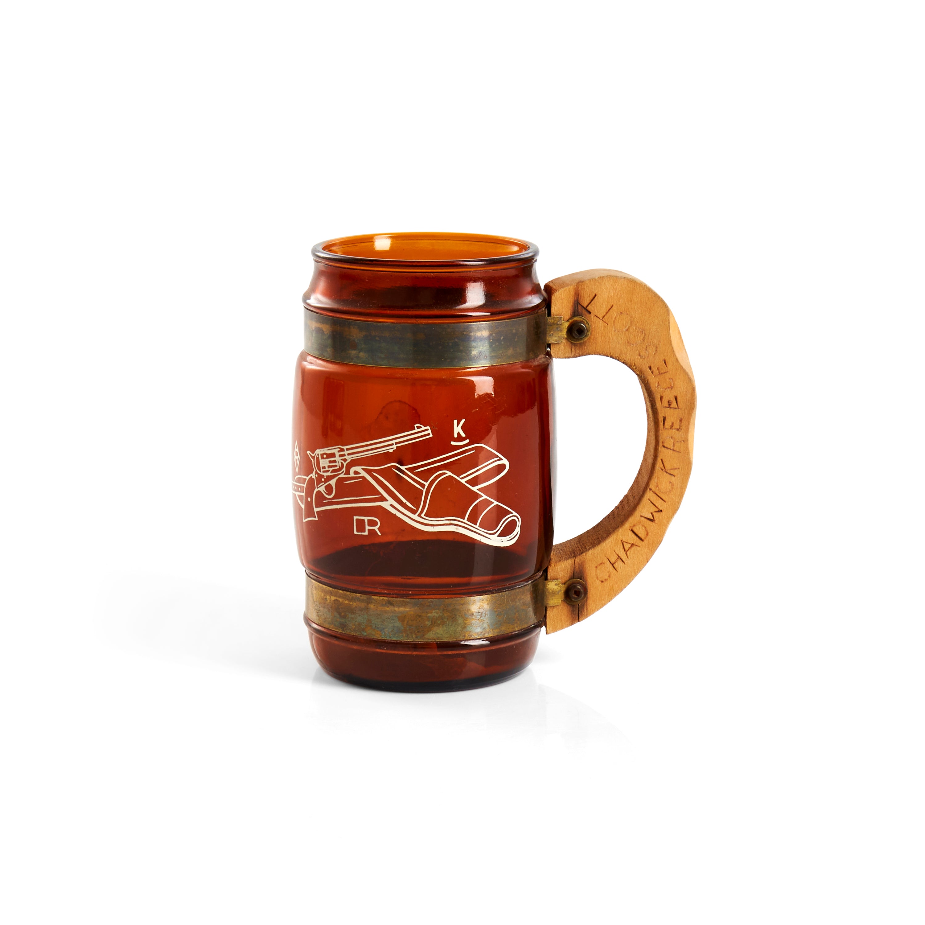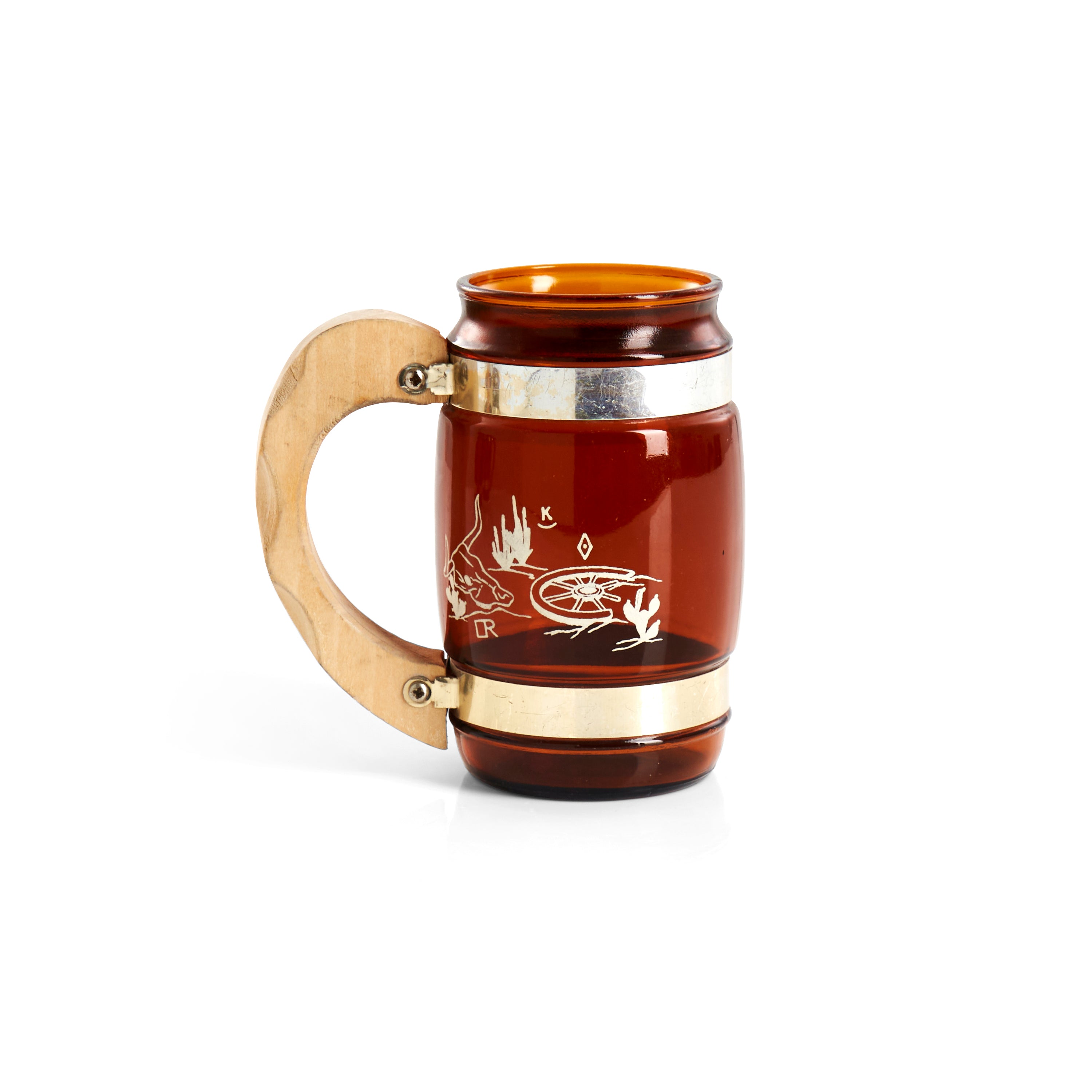 Details: Set of four amber glass mugs with printed cowboy decals and wooden handles Dimensions: 5" High x 5" Wide (each)