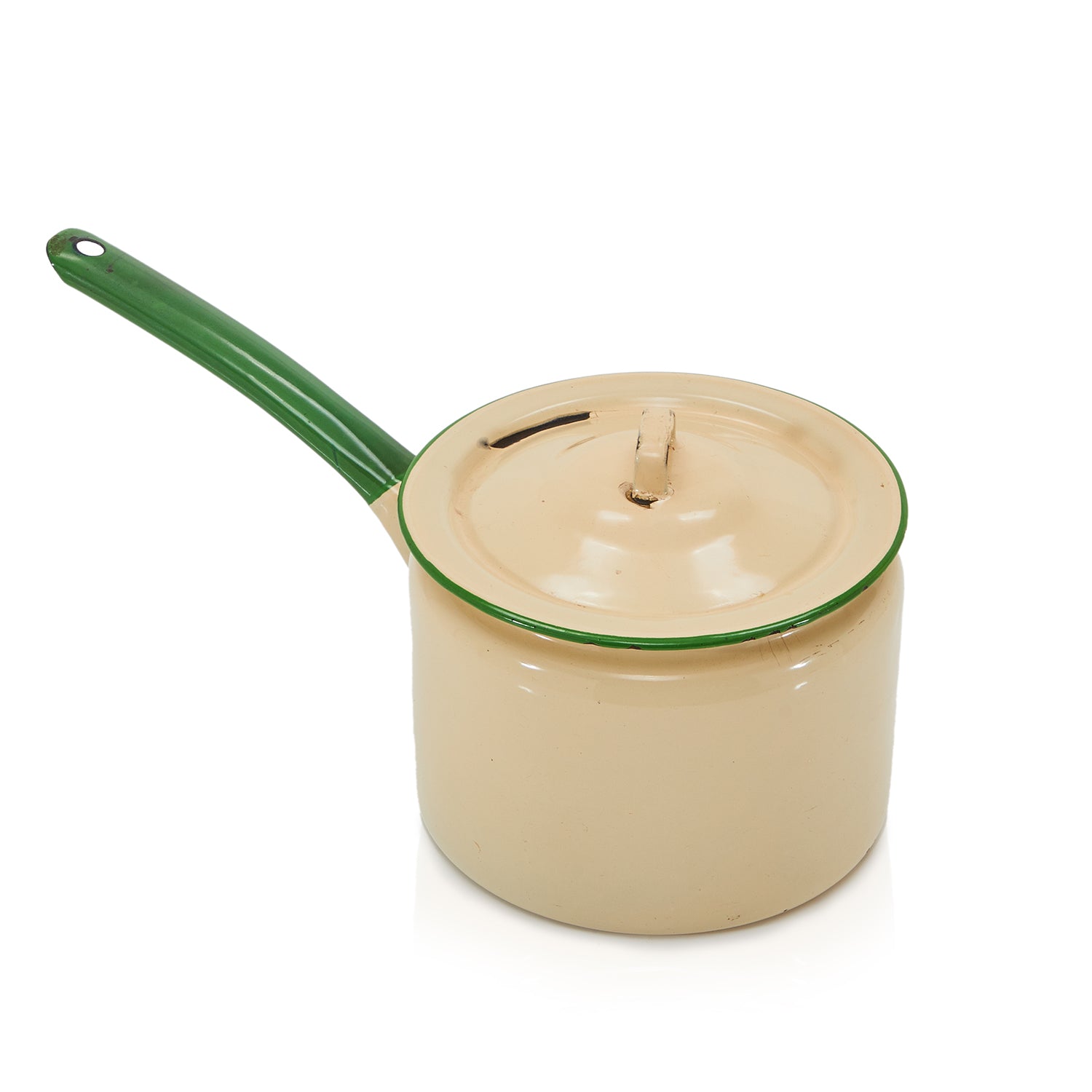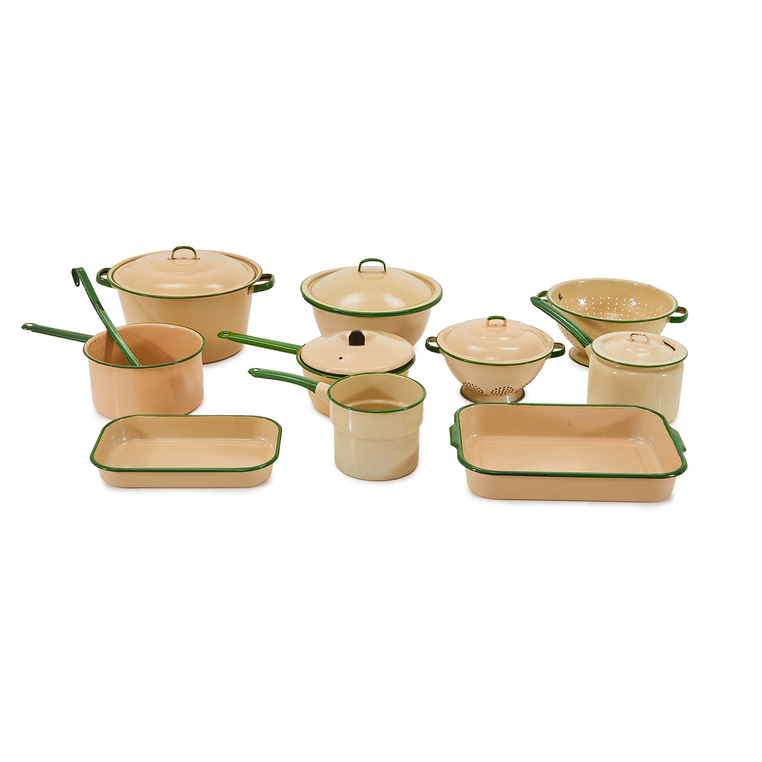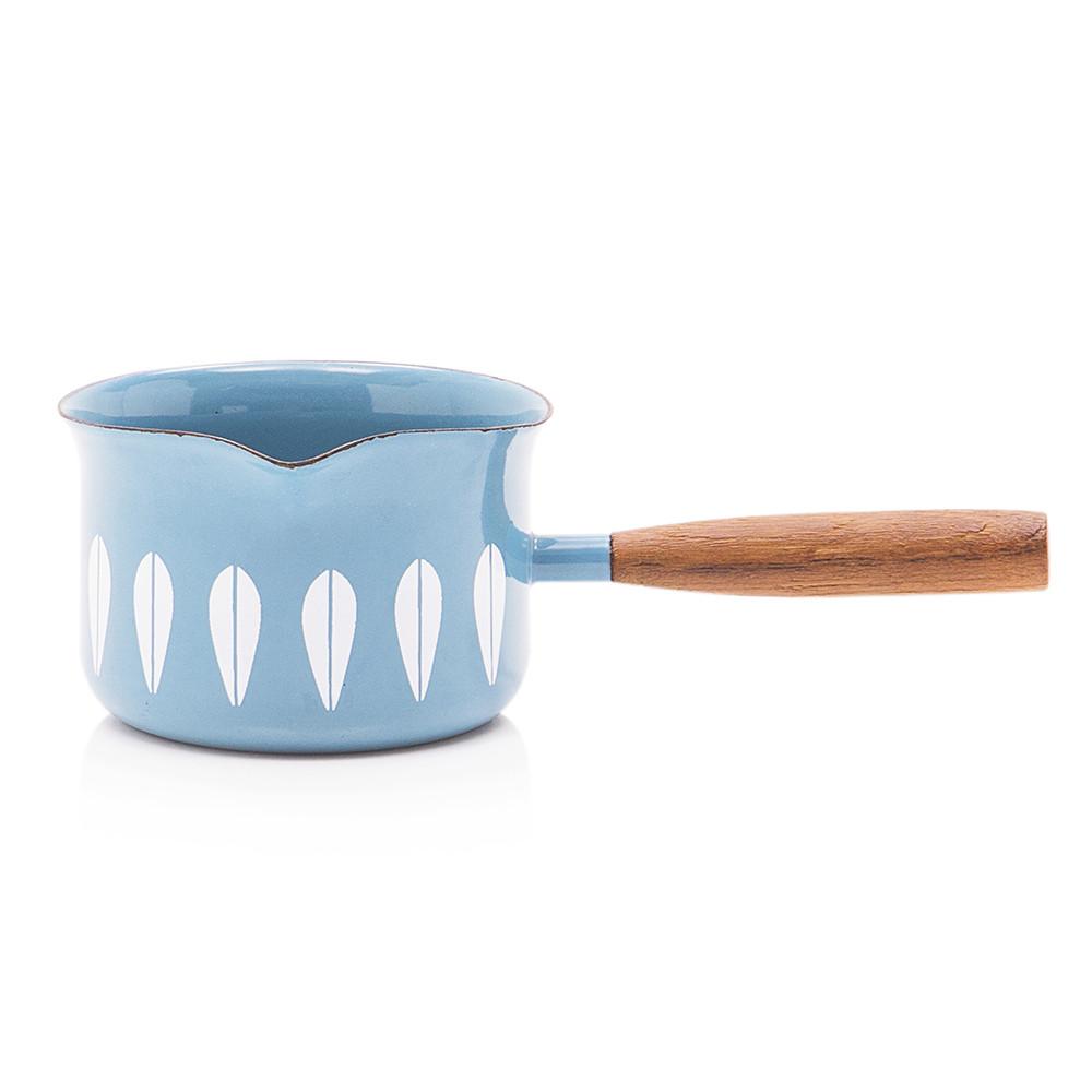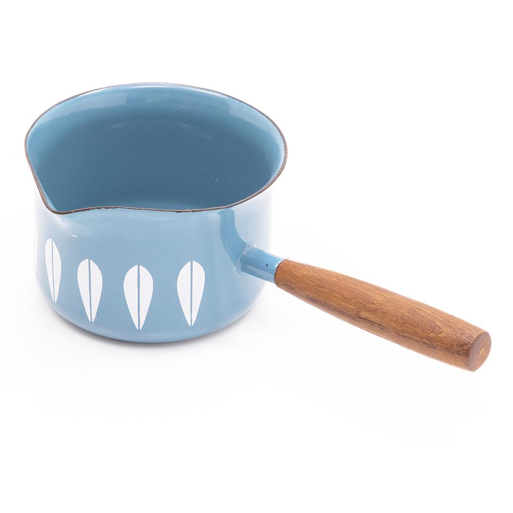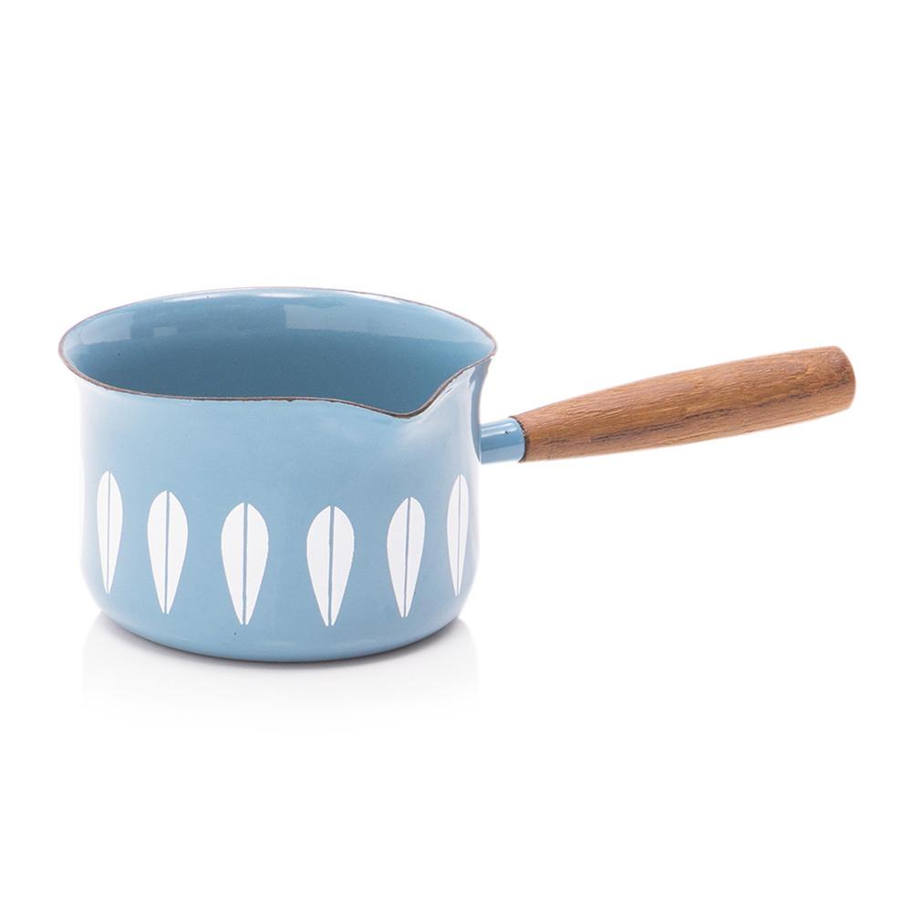 Details: Cathrineholm, Norway, White Leaves, Blue, White, Black, Yellow, Various Cookware, Pots, Bowls, Butter Pans, Lids, Kitchenware Dimensions: 3" H x 9.5" W X 5"...