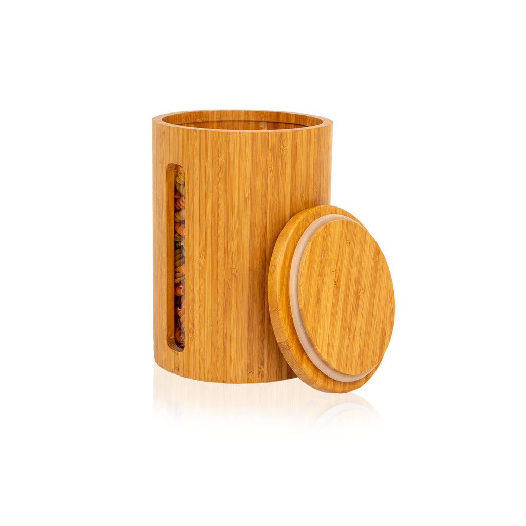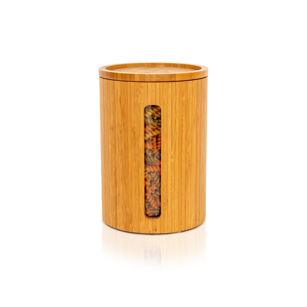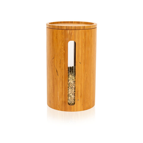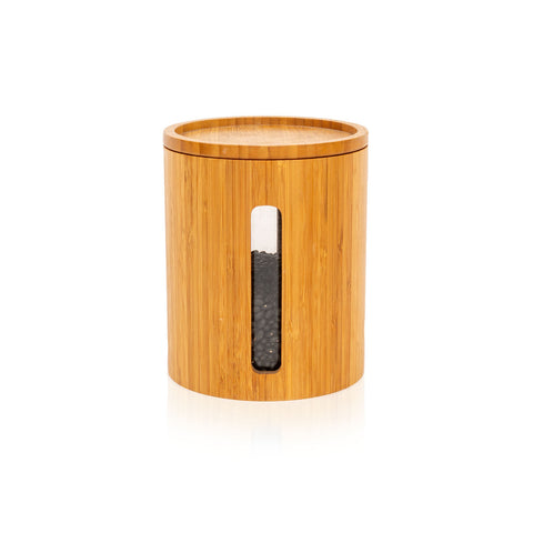 Details: Tall wood spice container with lid and glass window slit Dimensions: 10" H x 6" W x 6" D Quantity: 1