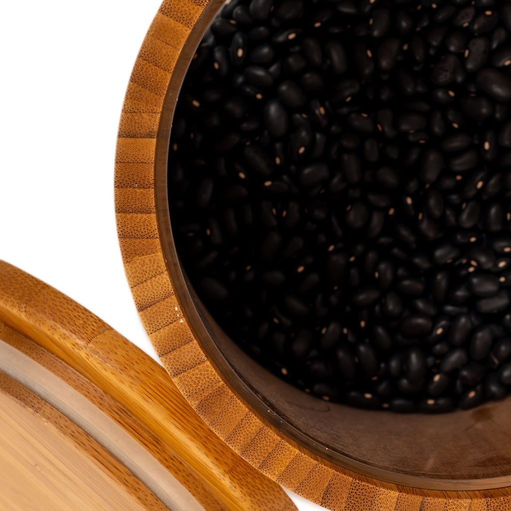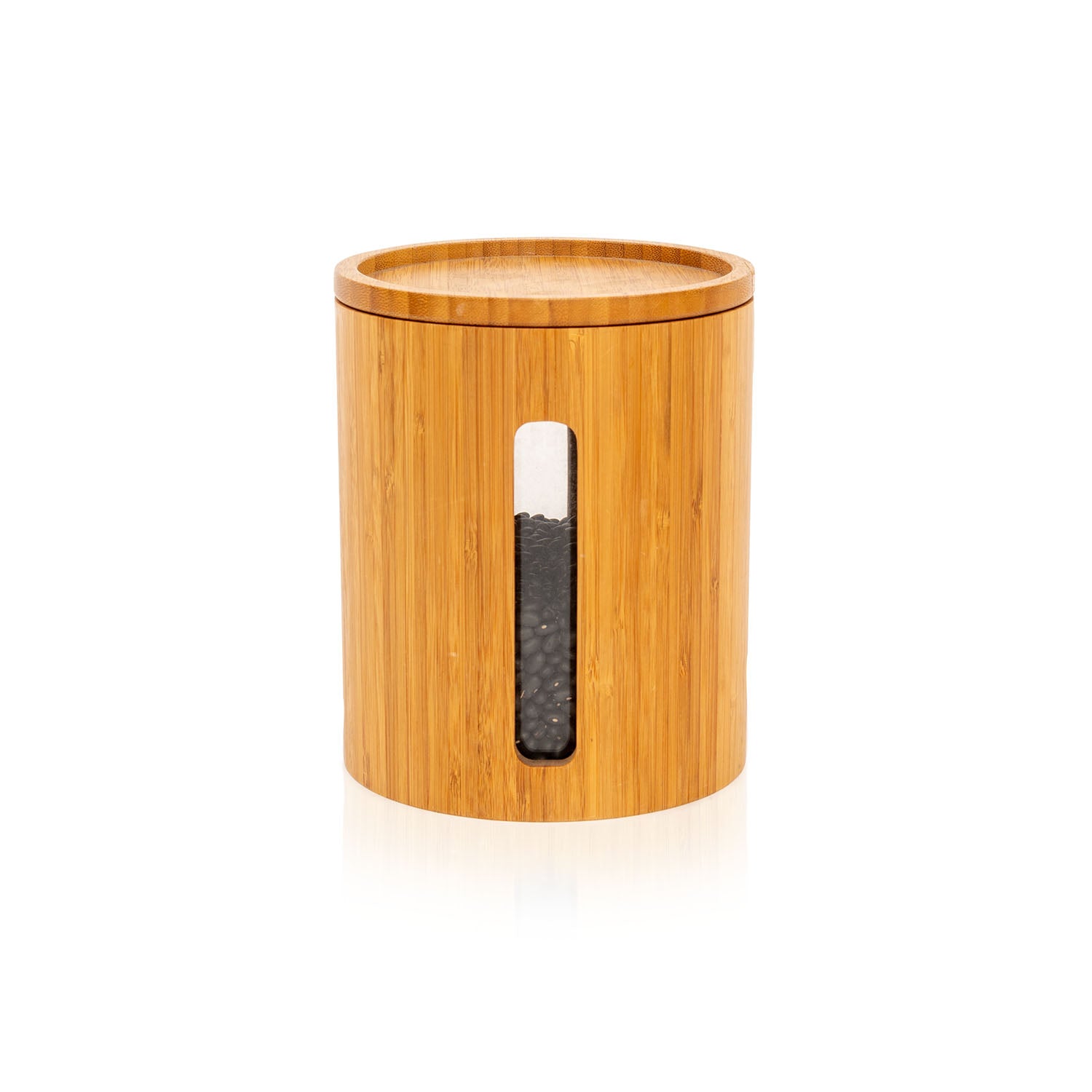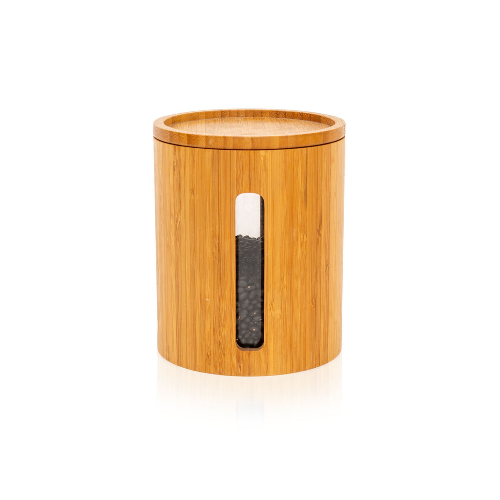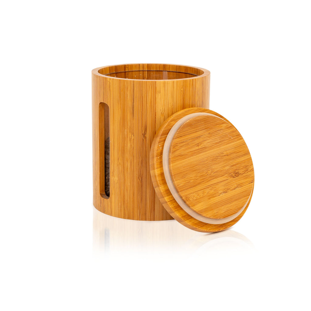 Details: Medium size wood spice container with lid and glass window slit Dimensions: 8" H x 6" W x 6" D Quantity: 1