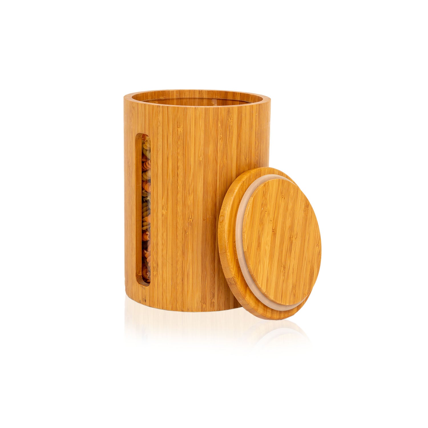 Details: Small size wood spice container with lid and glass window slit Dimensions: 10" H x 6" W x 6" D Quantity: 1