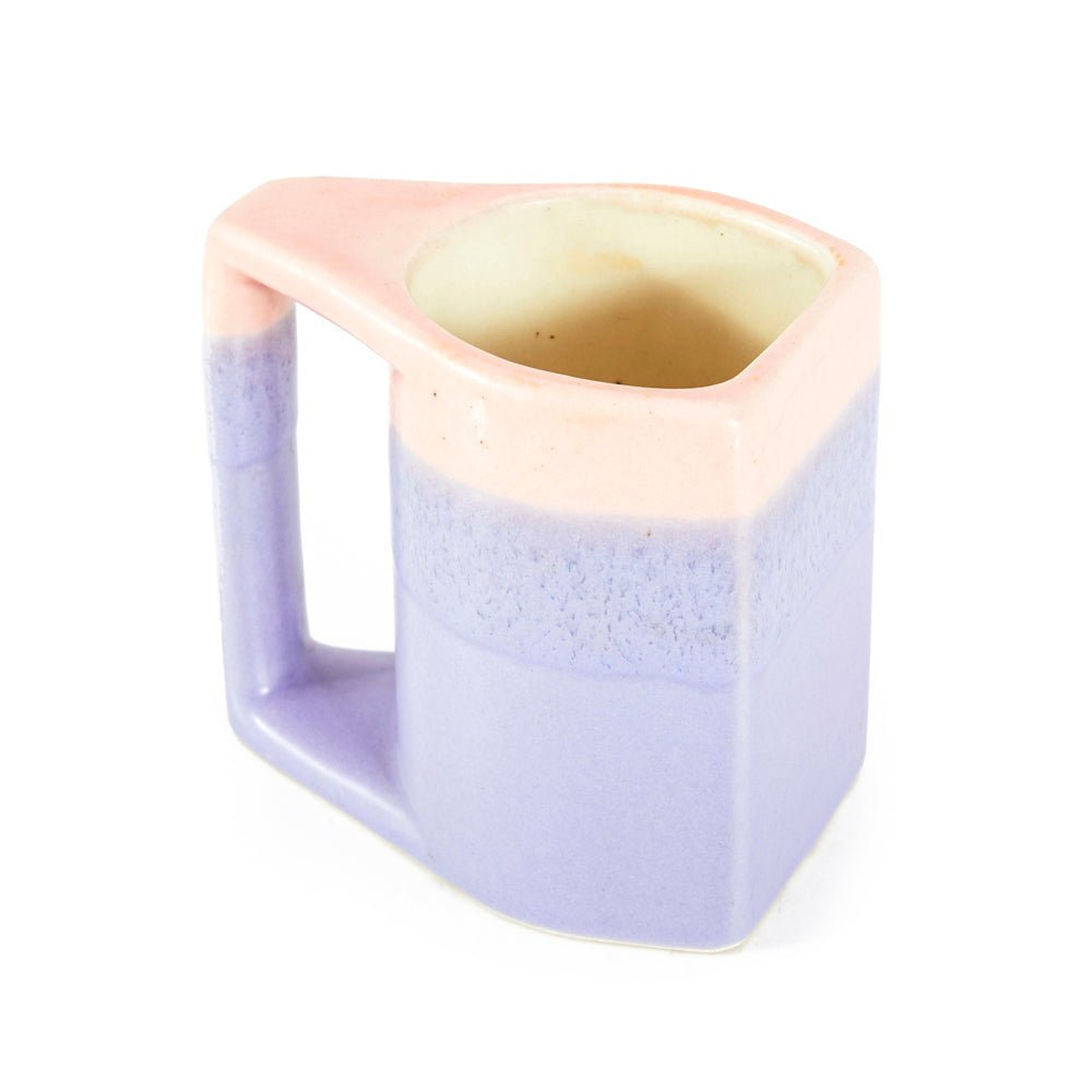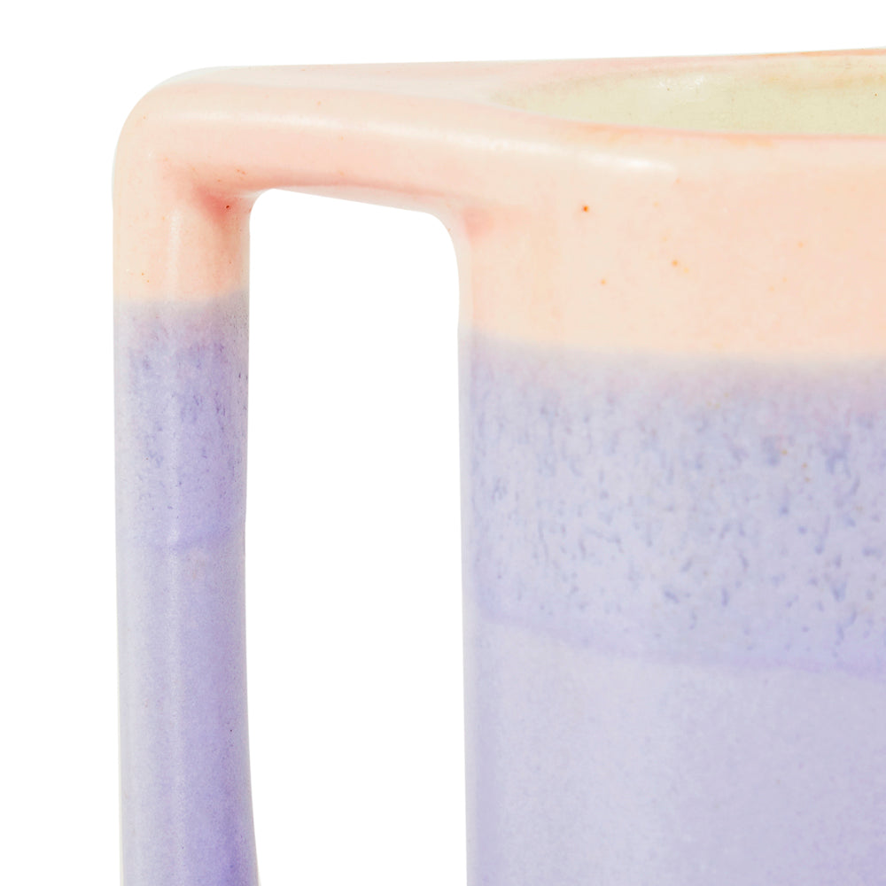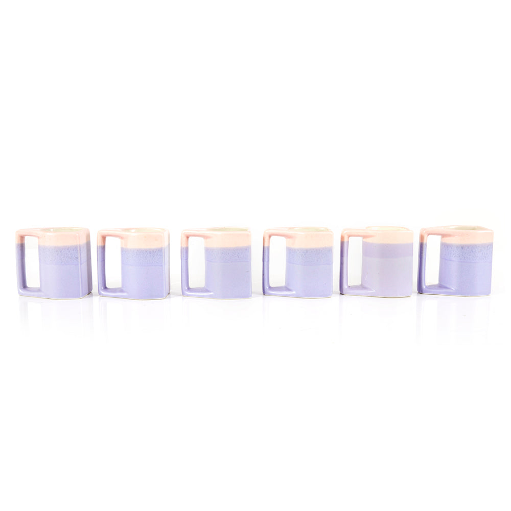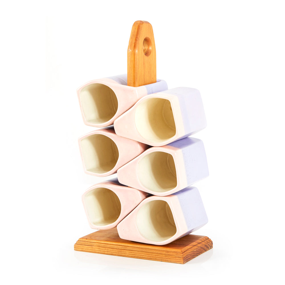 Details: Purple and pink two-tone ceramic mug with wood stand for the set Dimensions: 4.25" H x 3" W x 5" D Quantity: 6