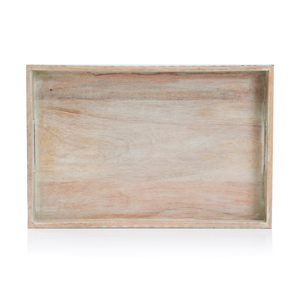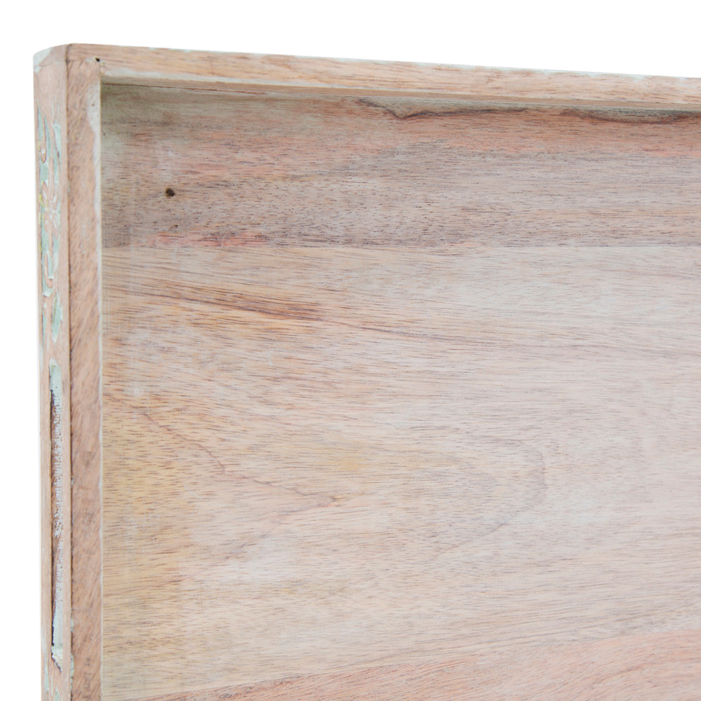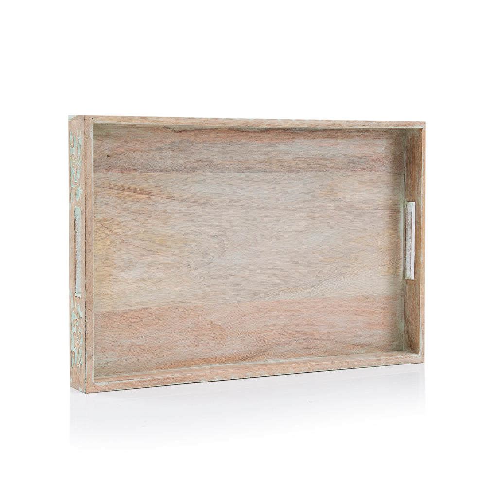 Details: Rectangular light wood serving tray with green etchings on side Dimensions: 12" H x 18" W x 2" D Quantity: 1