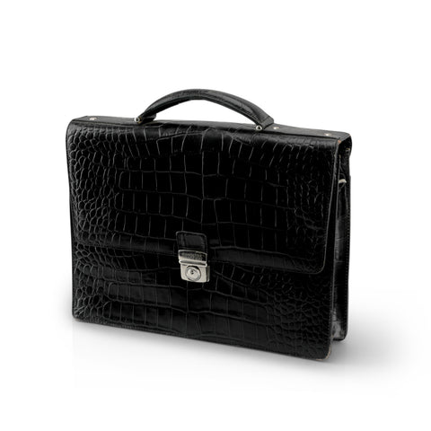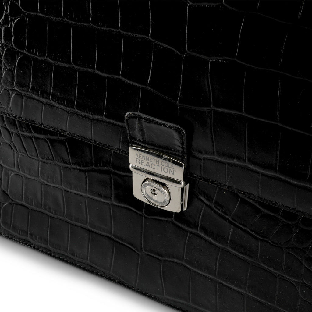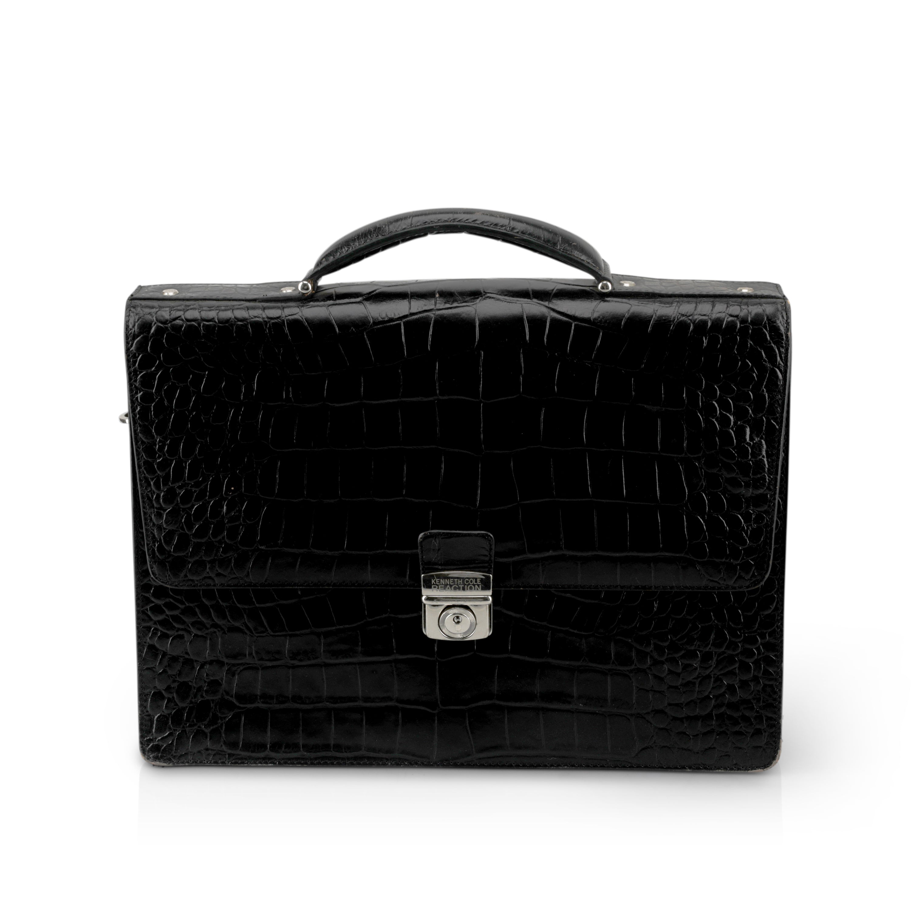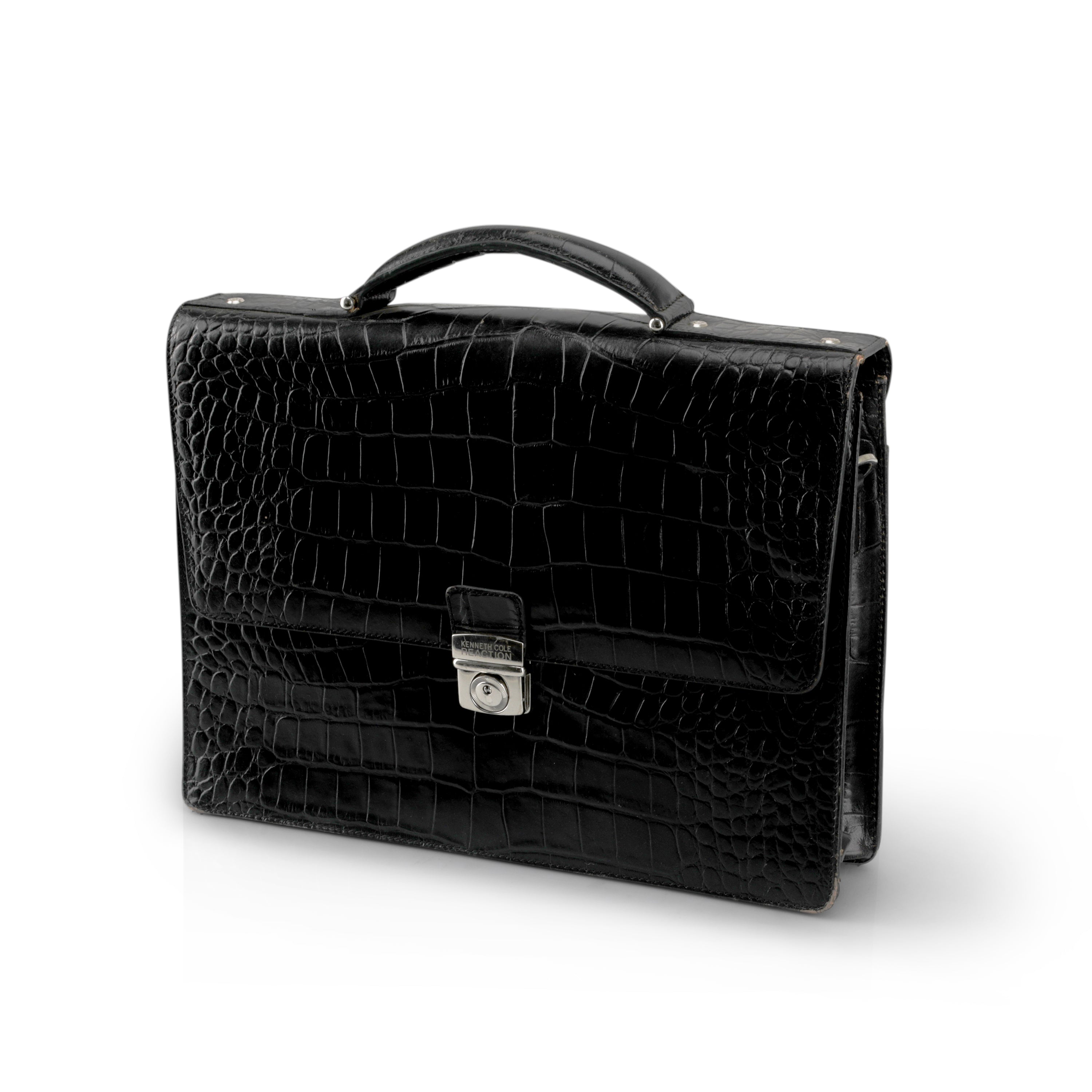 Details: Black embossed bag with chrome latch Dimensions: 12" H x 16" W x 3" D