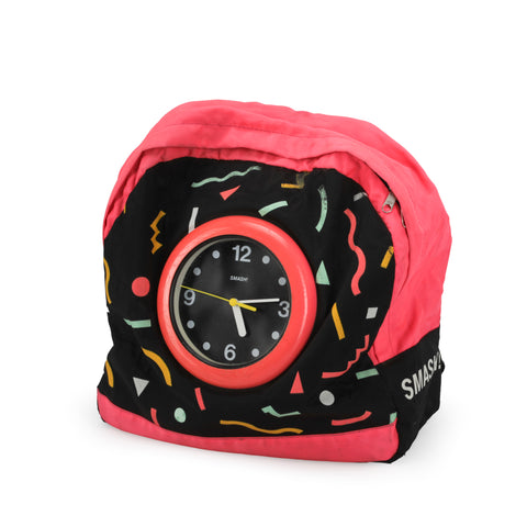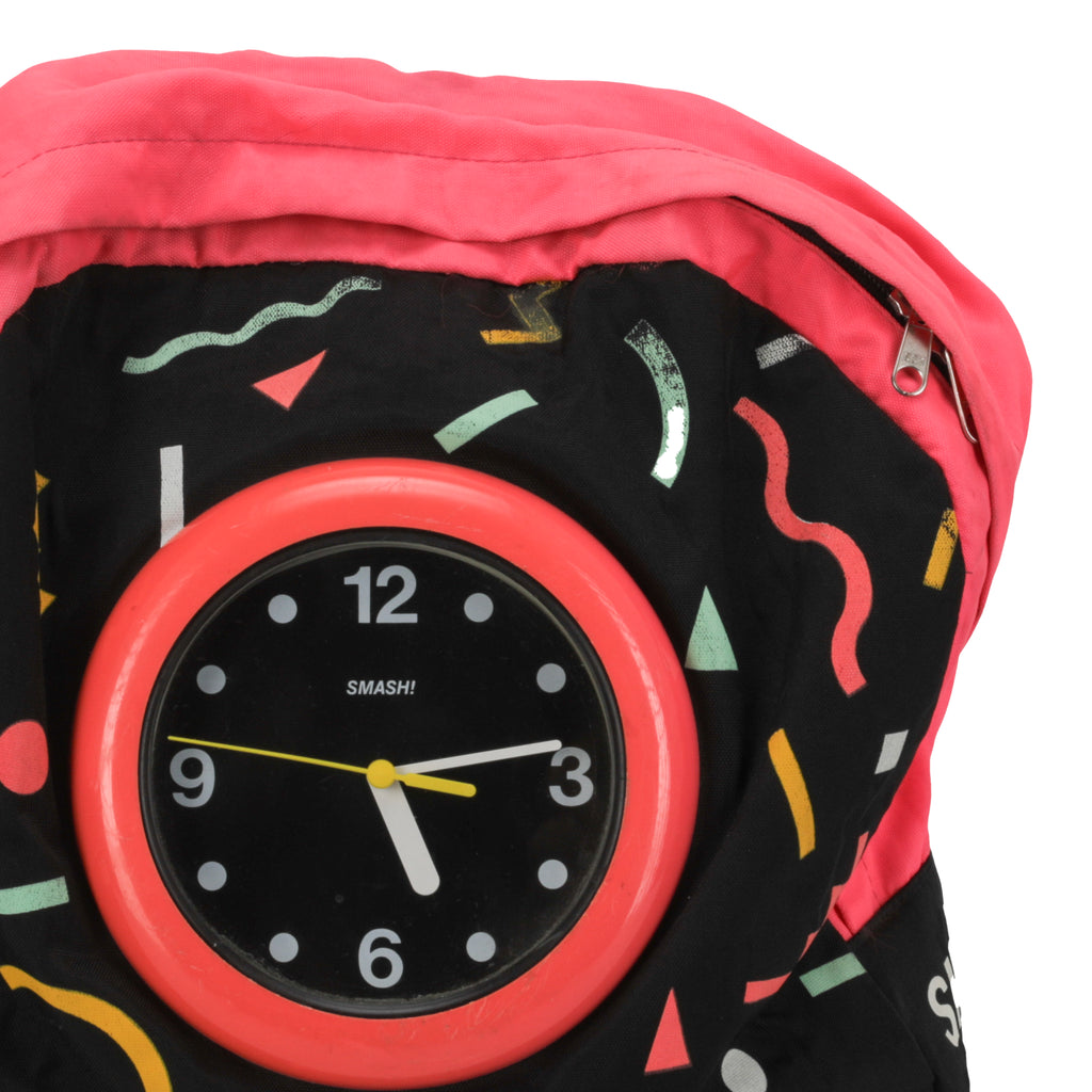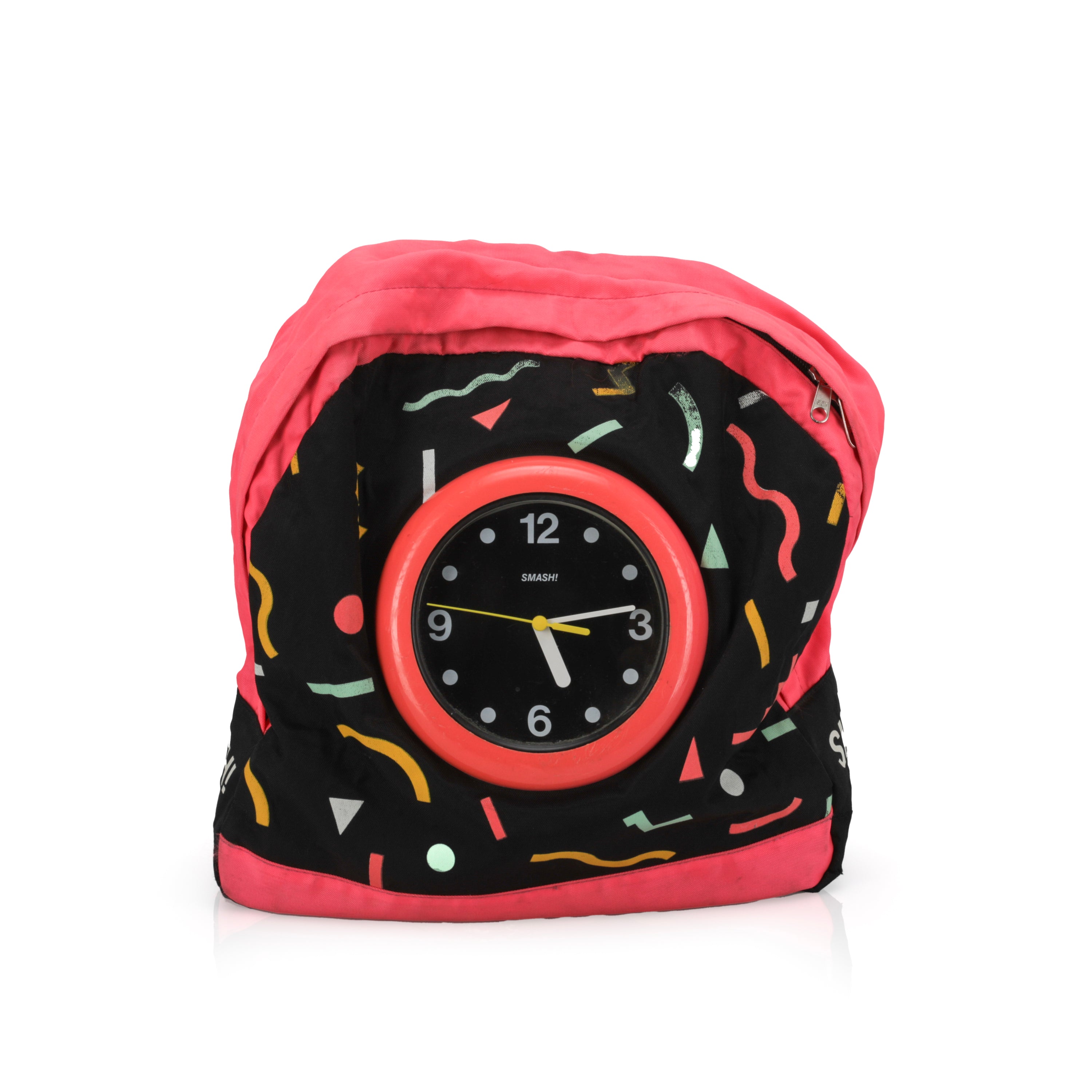 Details: Vibrant backpack with clock embedded in back. "Smash!" written on sides and clock face. Dimensions: 15" H x 13" W x 8" D