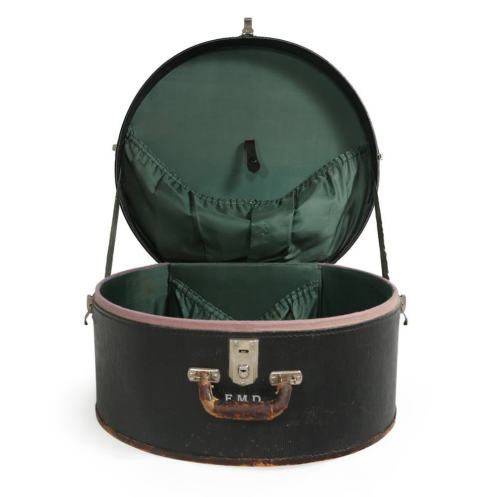 Details: Round, Black, Hat Box, Luggage, Beat Up, Dark Green Lining, Bron Handle Dimensions: 16" H X 17" Diameter