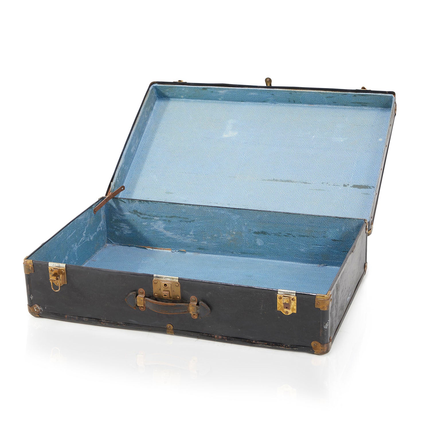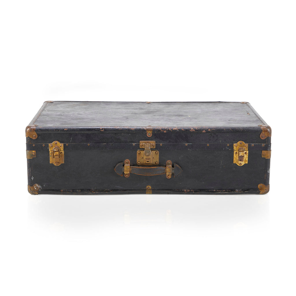Details: Trunk with black exterior, gold fasteners, and a baby blue interiorDimensions: 12" H X 38" W X 22" D
