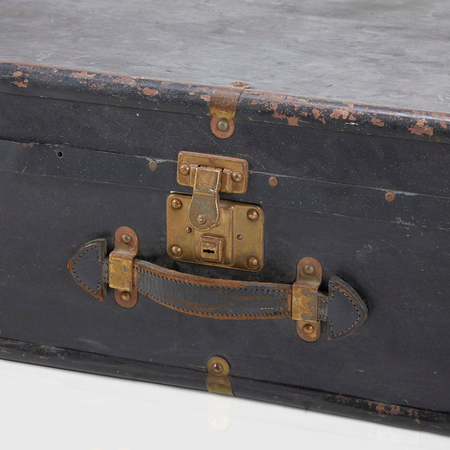 Details: Black metal trunk with blue interior, gold hardware Dimensions: 9.5" H x 31" W x 20" D Quantity: 1