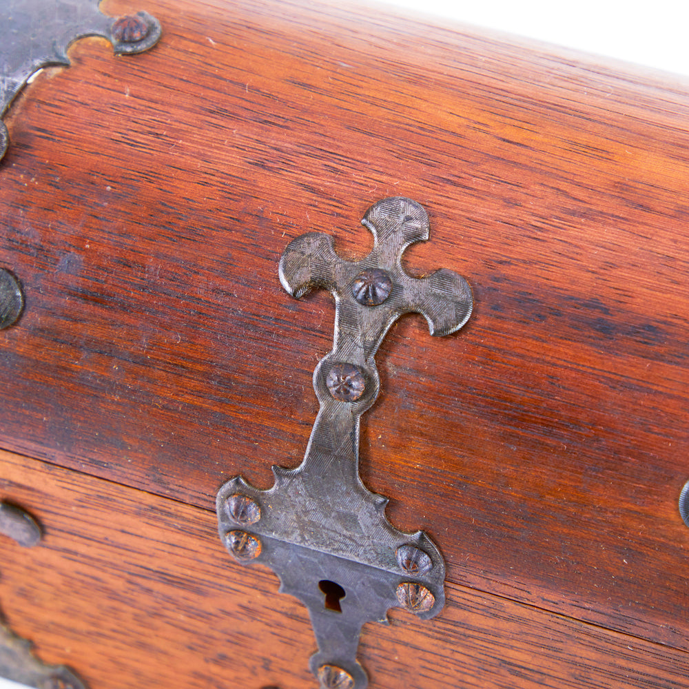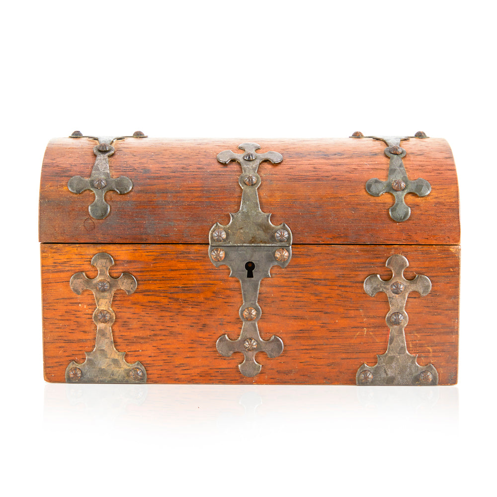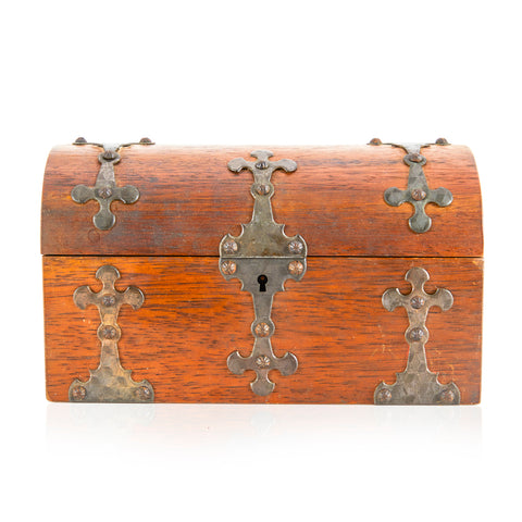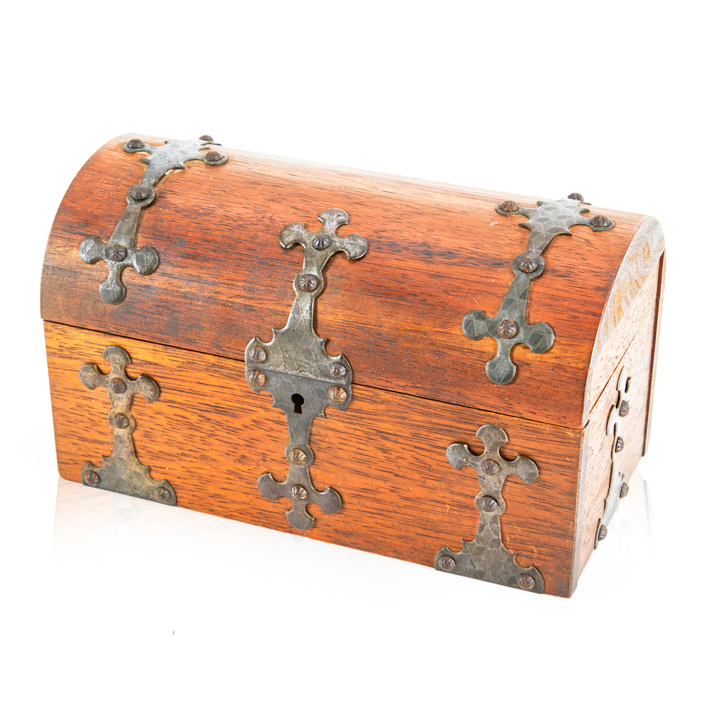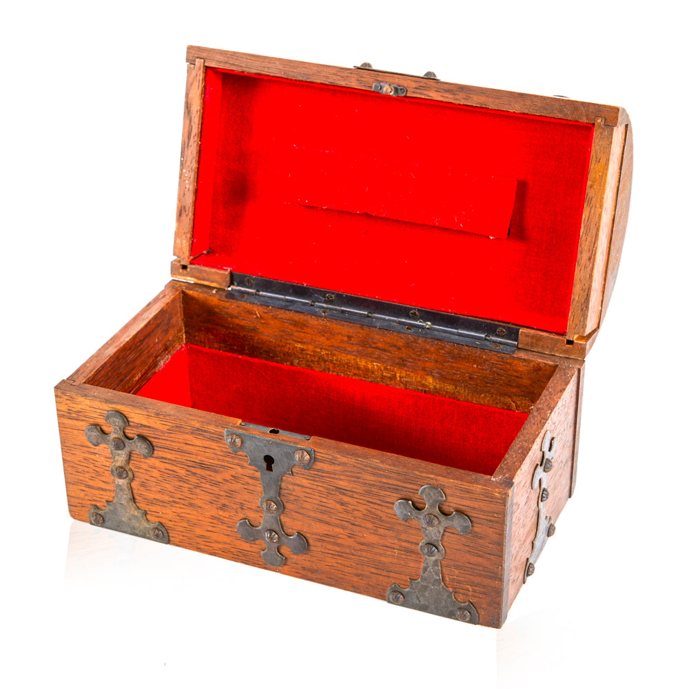 Details: Small dark wood treasure chest for keepsakes/jewelry with red velvet interior Dimensions: 5" H x 8.75" W x 4.75" D