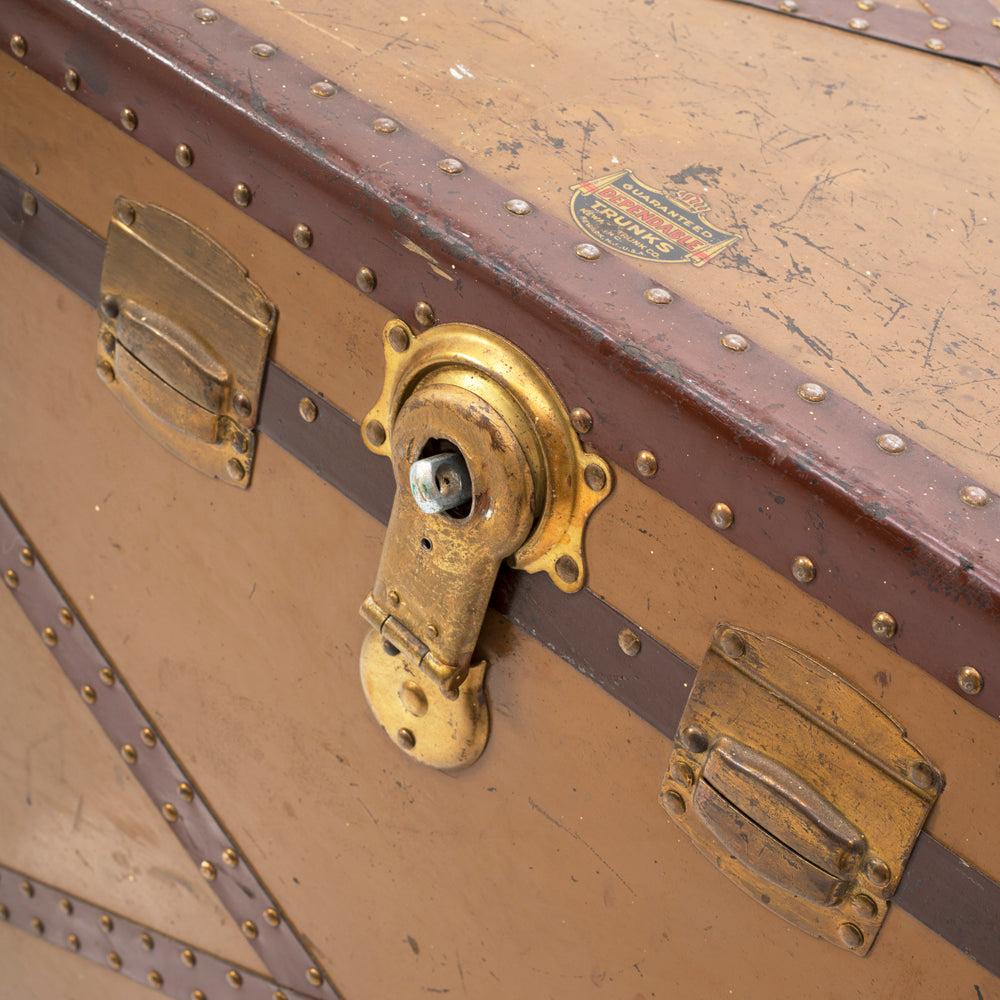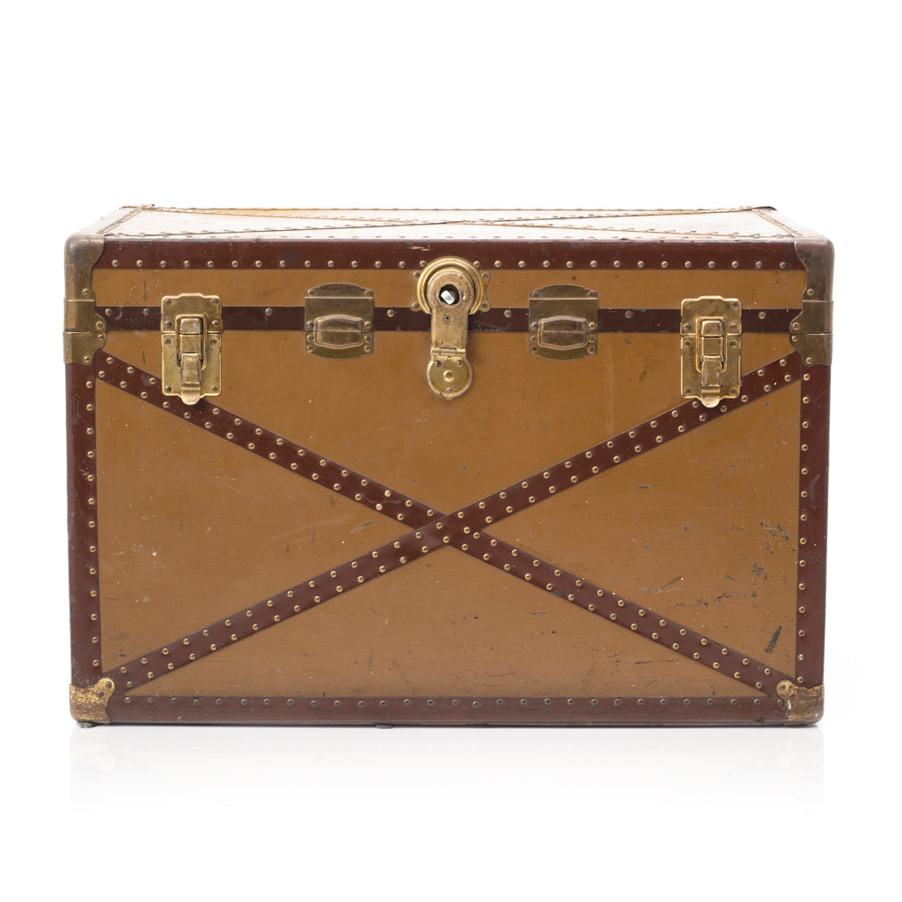 Details: Large tan trunk with brass clasps and X belt.