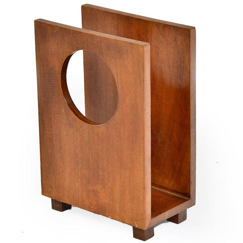 Details: Walnut magazine rack with circular hole insert and small wooden feetDimensions: 13" H X 9" W X 5" D