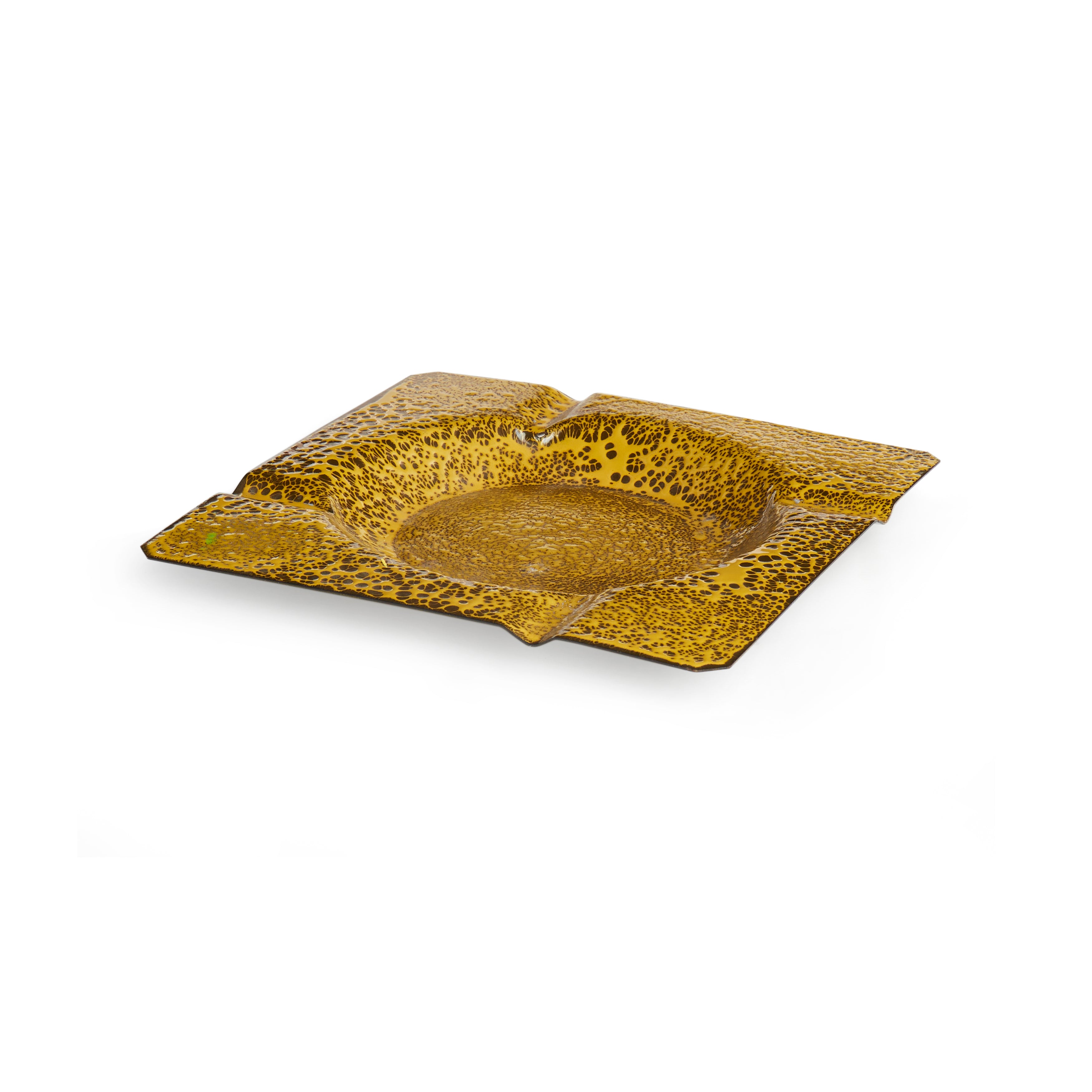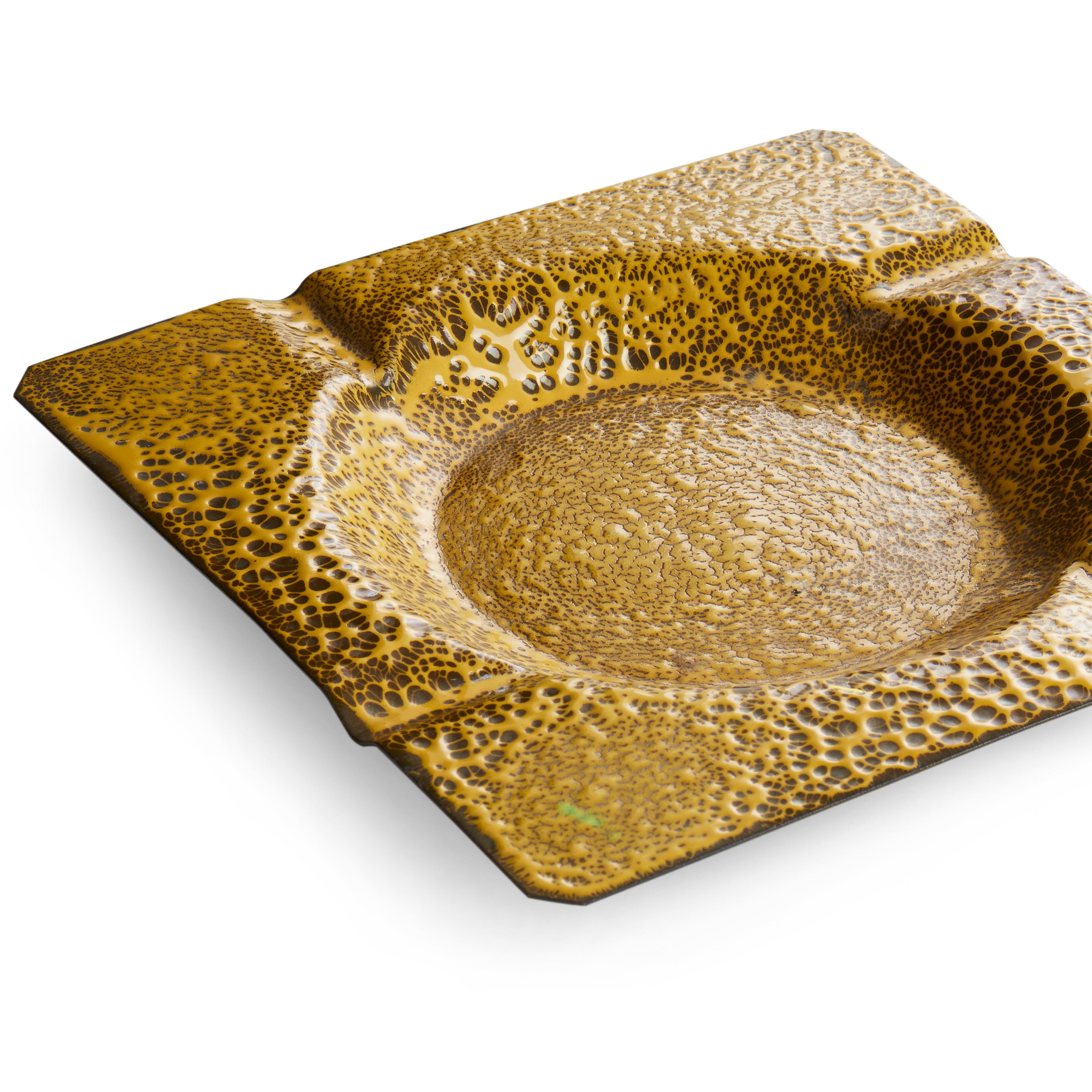 Details: Speckled textured hammertone -esque gold enamel covered brown metal ashtray. Dimensions: 10" L x 10" W x 1" D