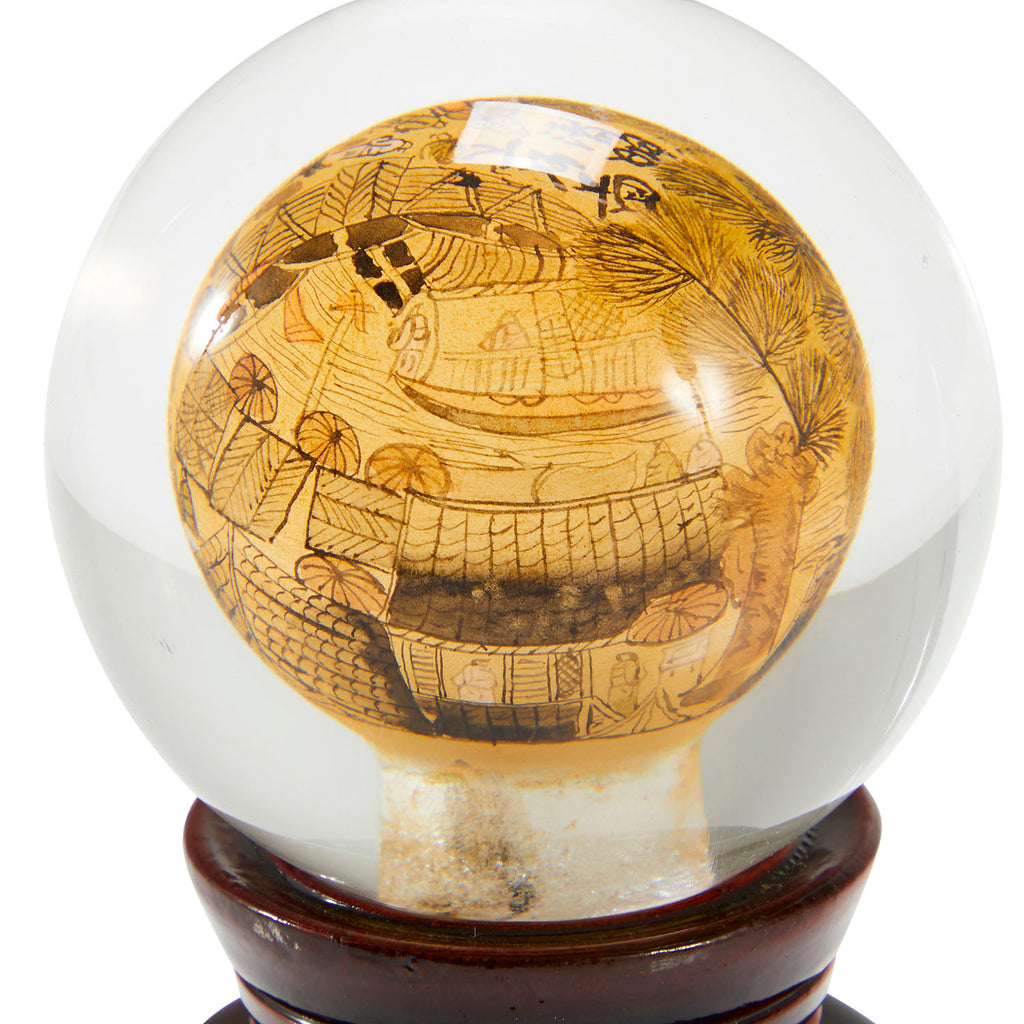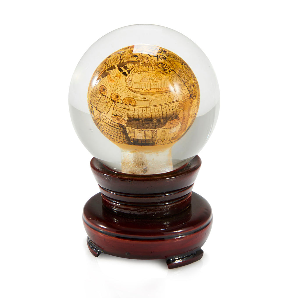 Details: A glass table globe with wood base and painted yellow core. Dimensions: 4" H x 2" W x 2" D Quantity: 1