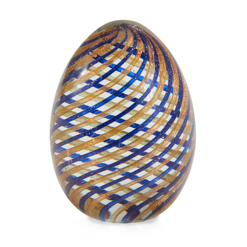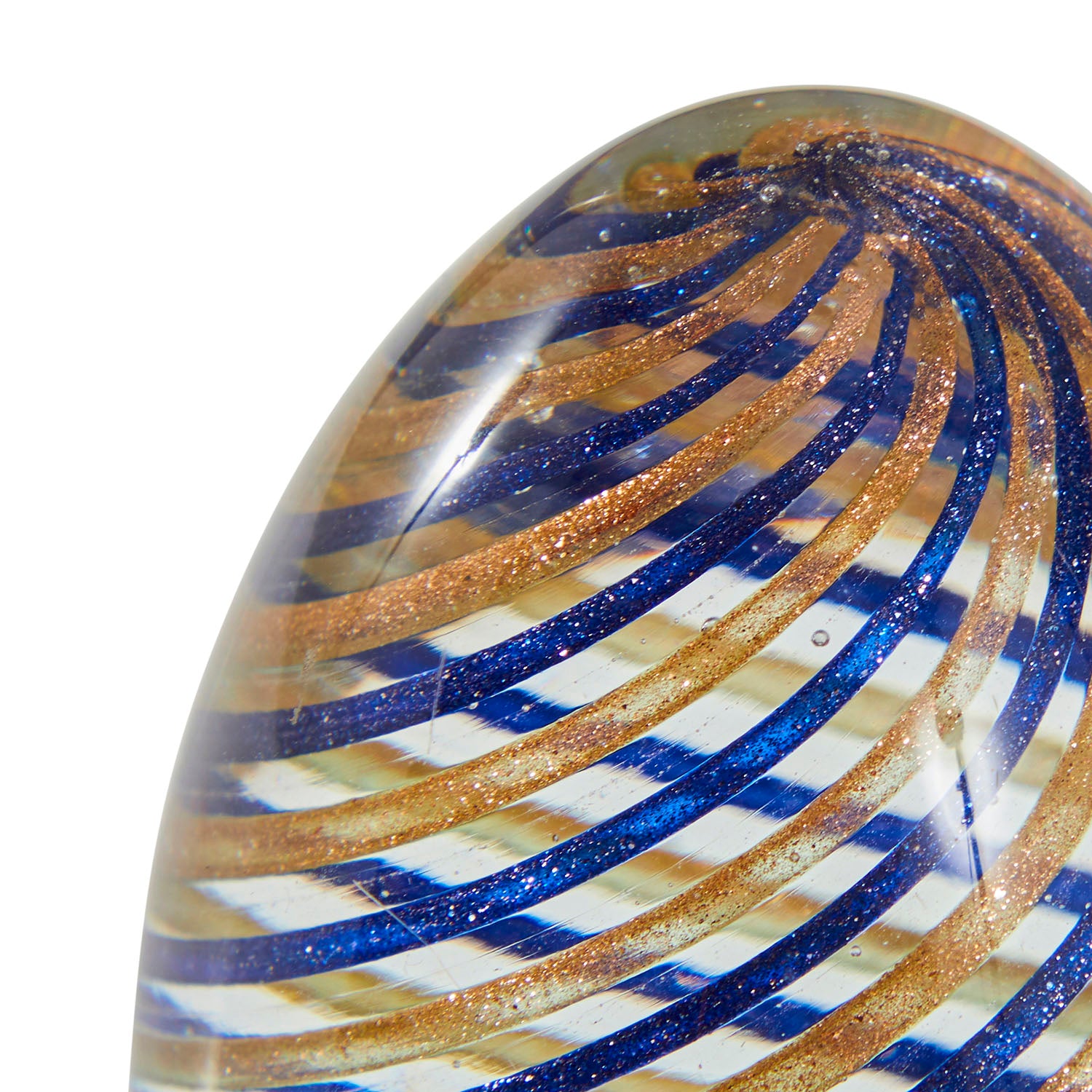 Details: A glass egg shaped paperweight with blue and rust color stripes Dimensions: 3" H x 2" W x 2" D