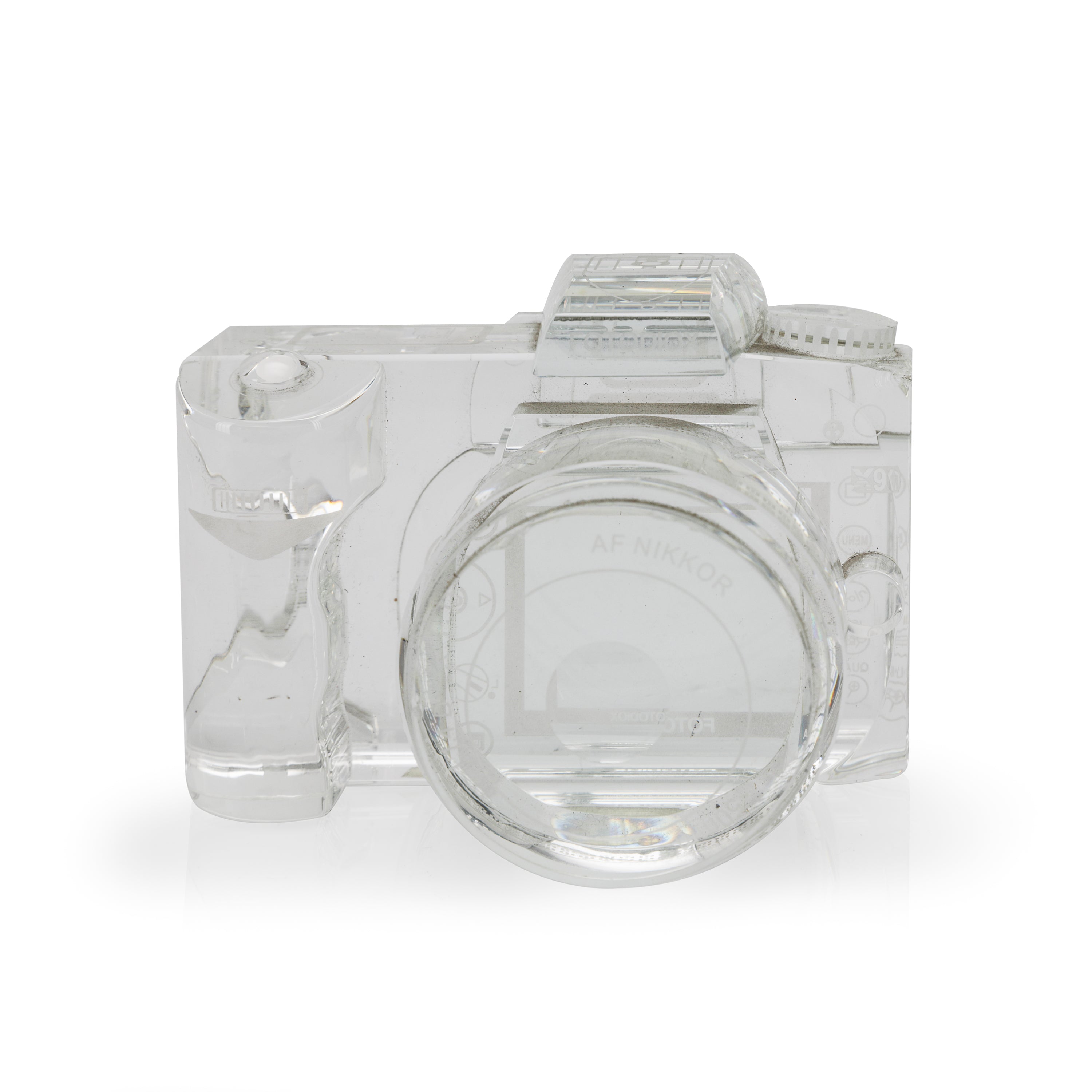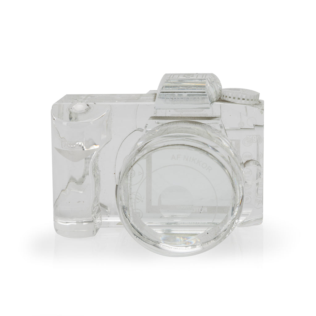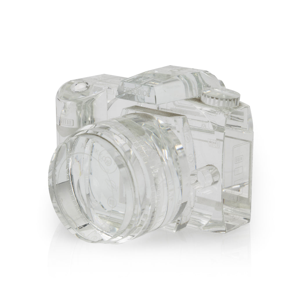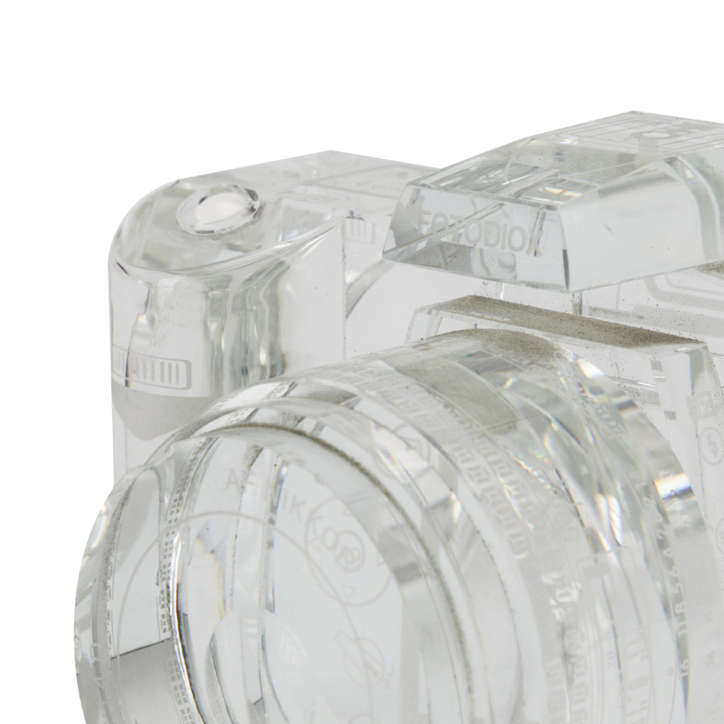 Details: Glass camera-shaped paperweight with etched details. Dimensions: 3" H x 4" W x 3.5" D