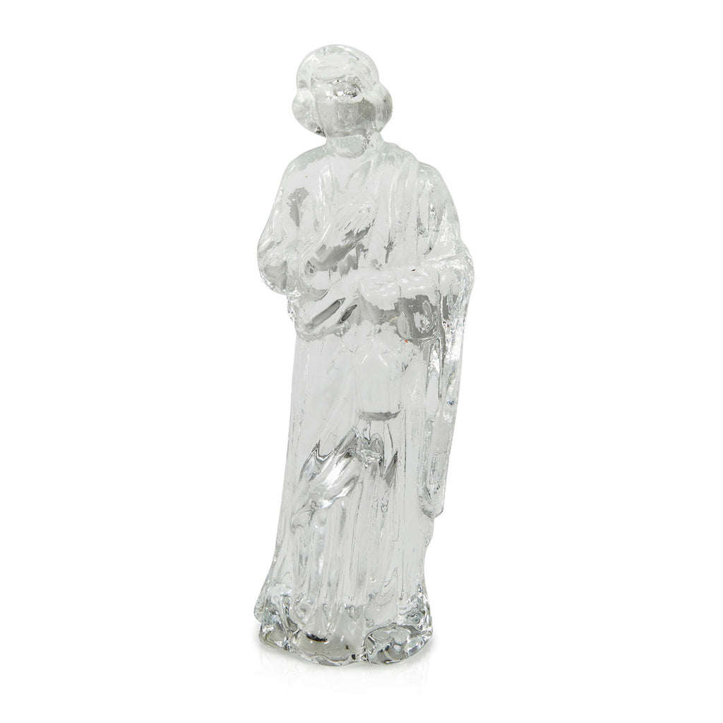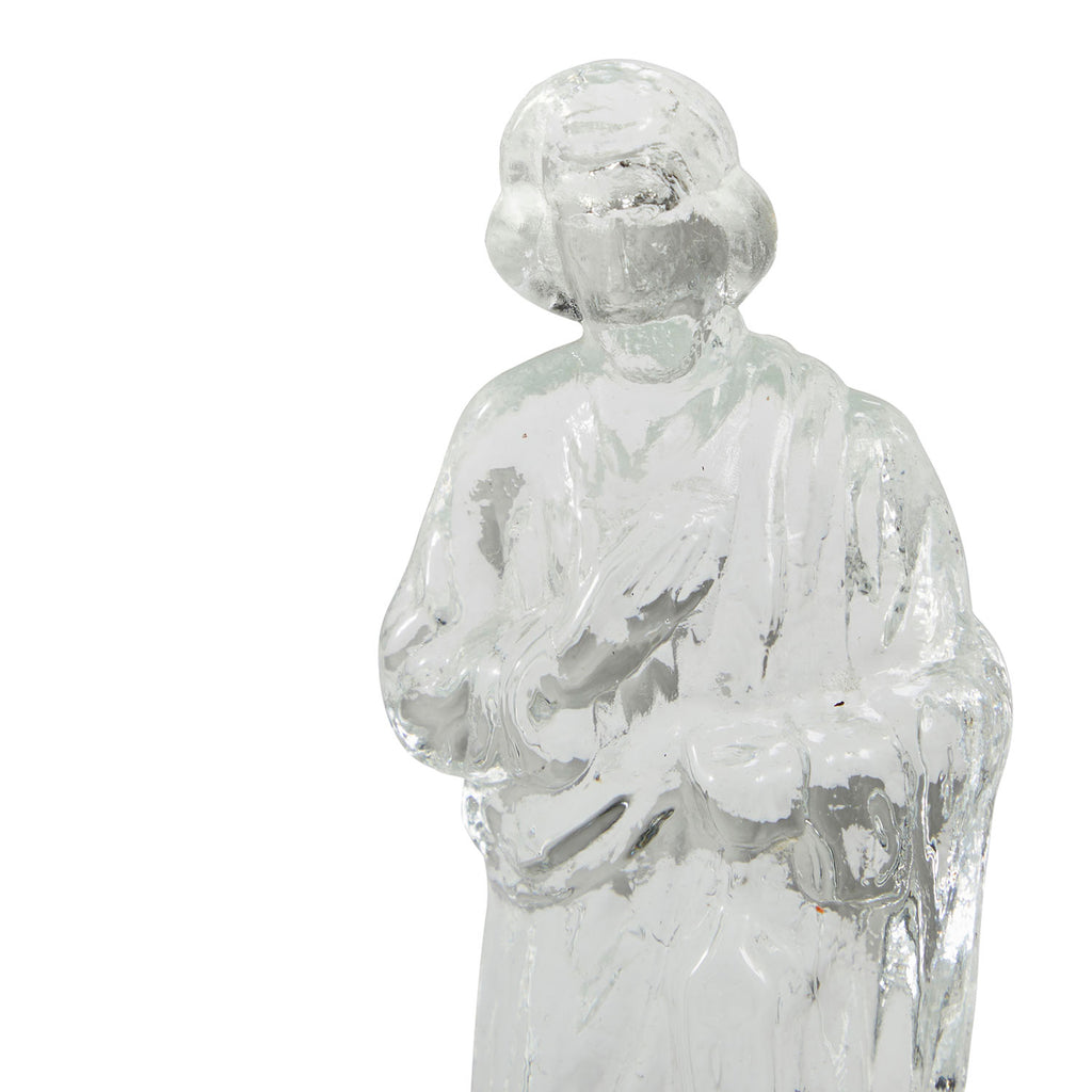 Details: A clear glass religious figurine of man with gesturing arms Dimensions: 6.5" H x 2" W x 2" D Quantity: 1