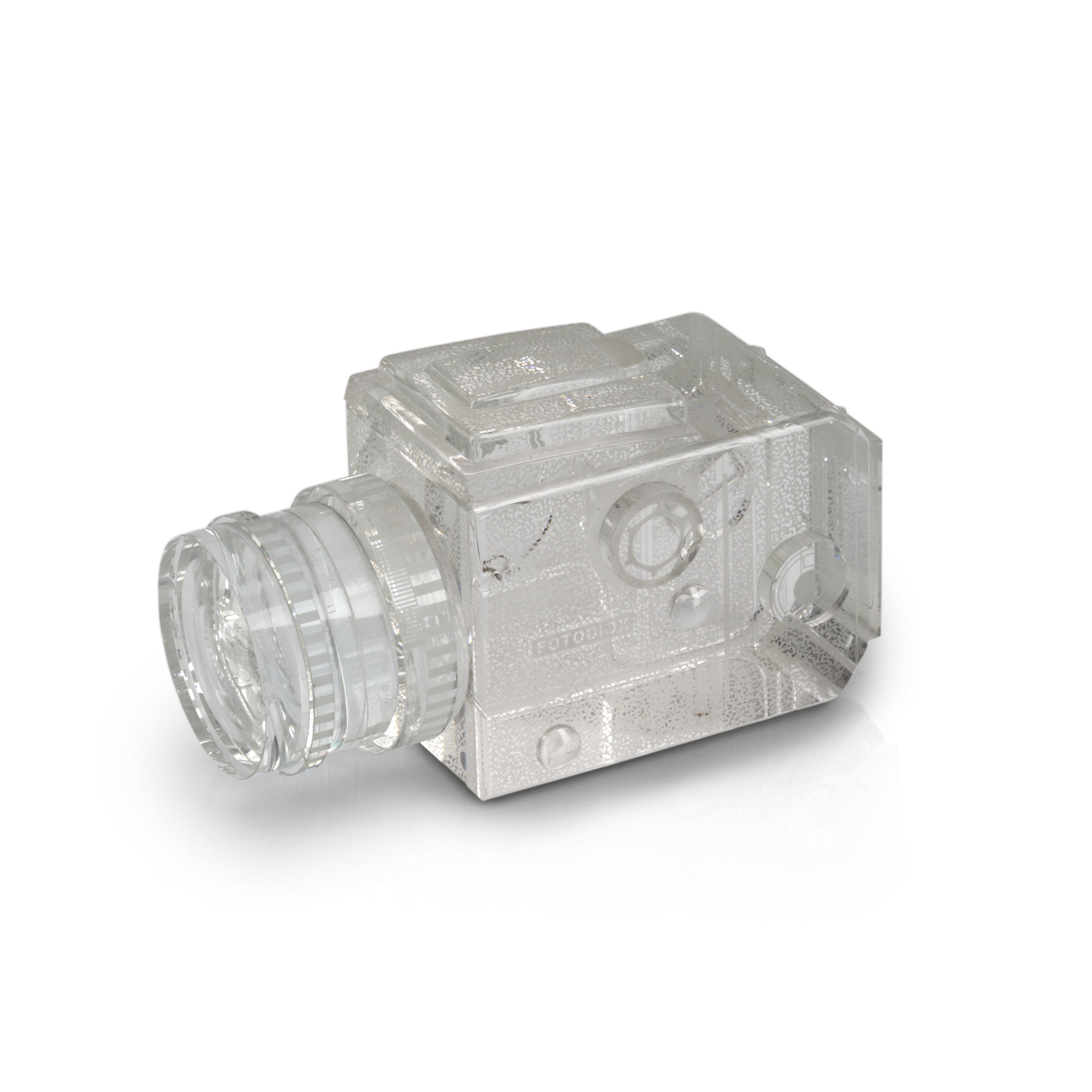 Details: Glass camera-shaped paperweight with etched details. Dimensions: 3" H x 5.5" W x 3" D