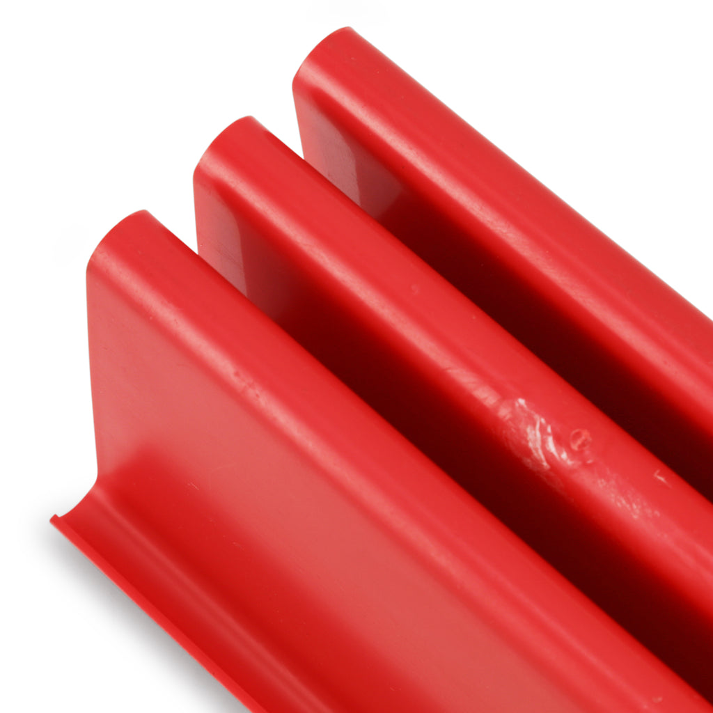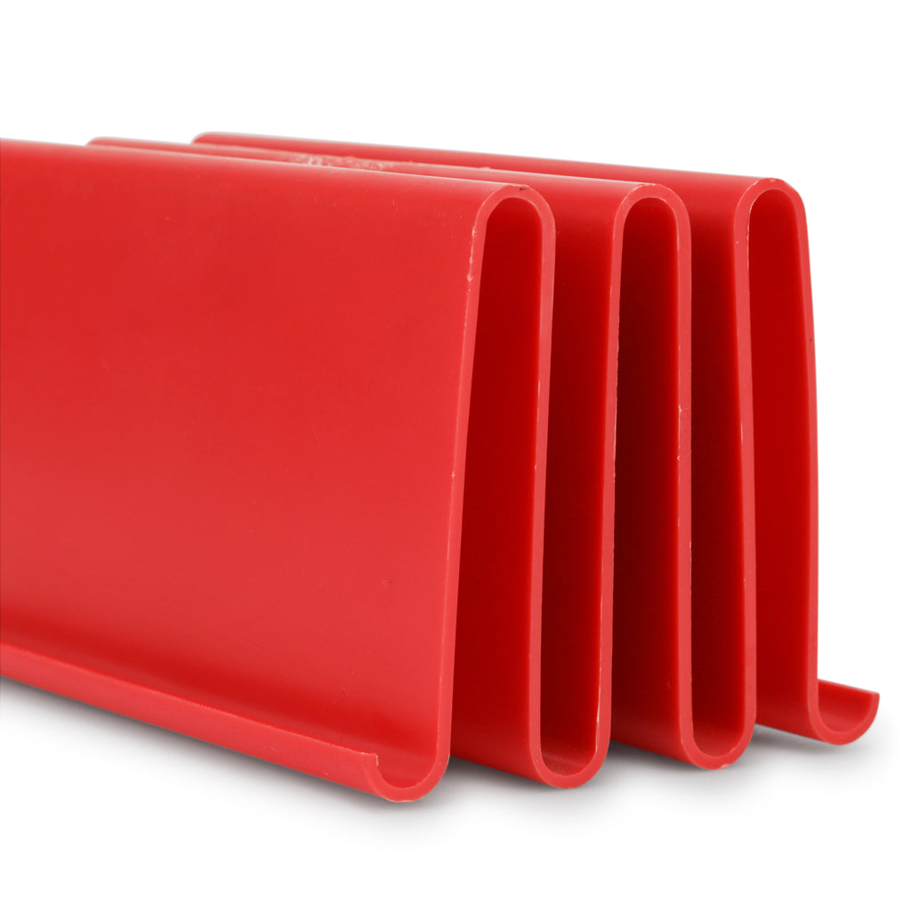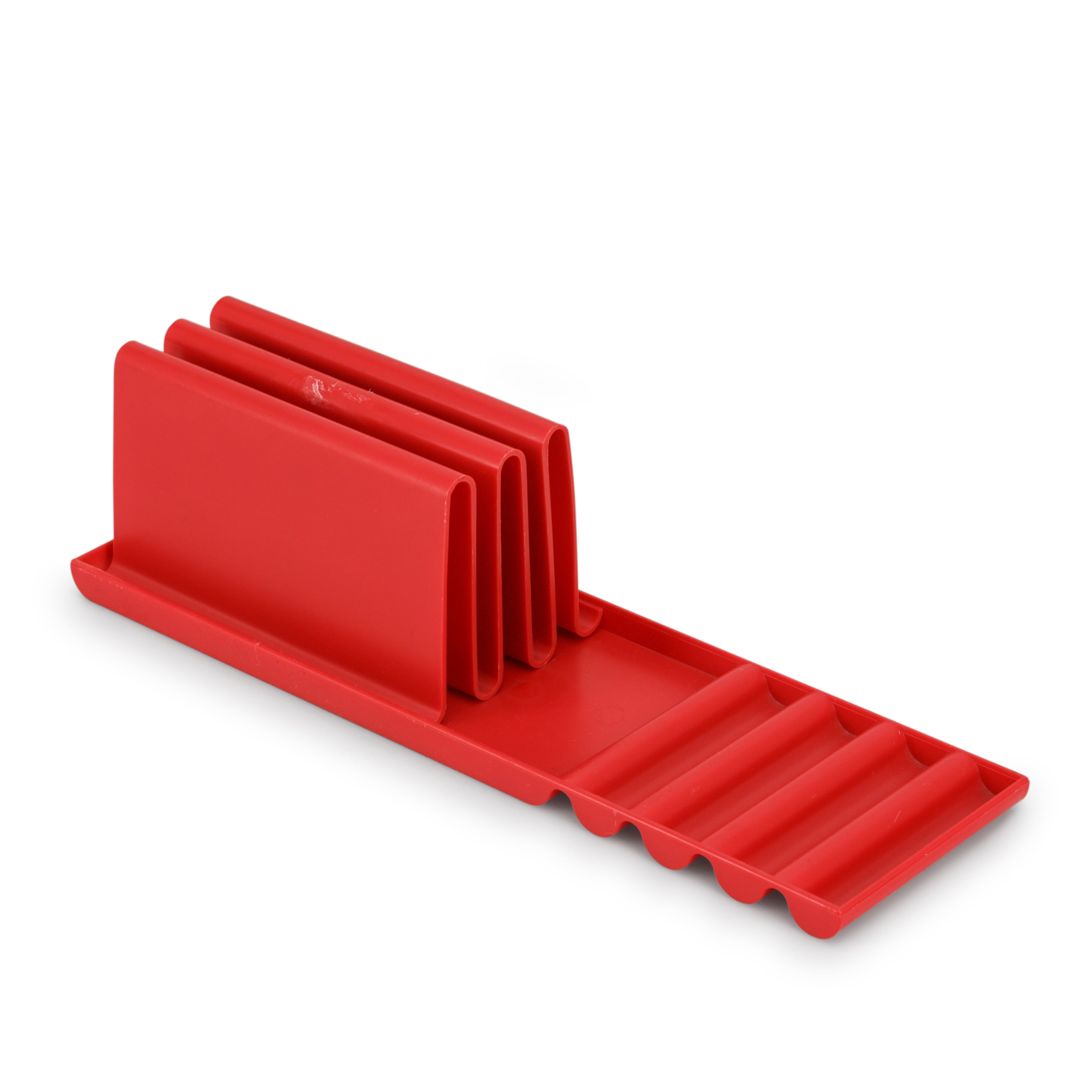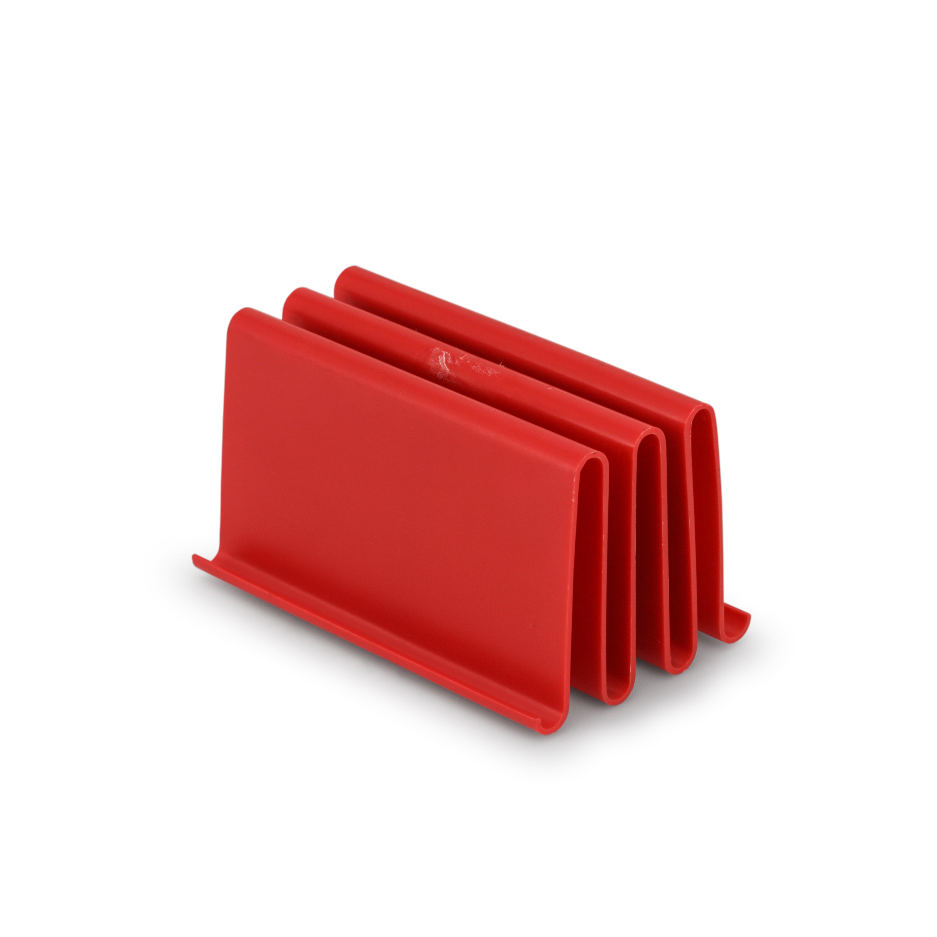 Details: Red plastic file holder with wavy aesthetic. Fits in a desk organizer (rented separately). Dimensions: 3" H x 6" W x 4" D