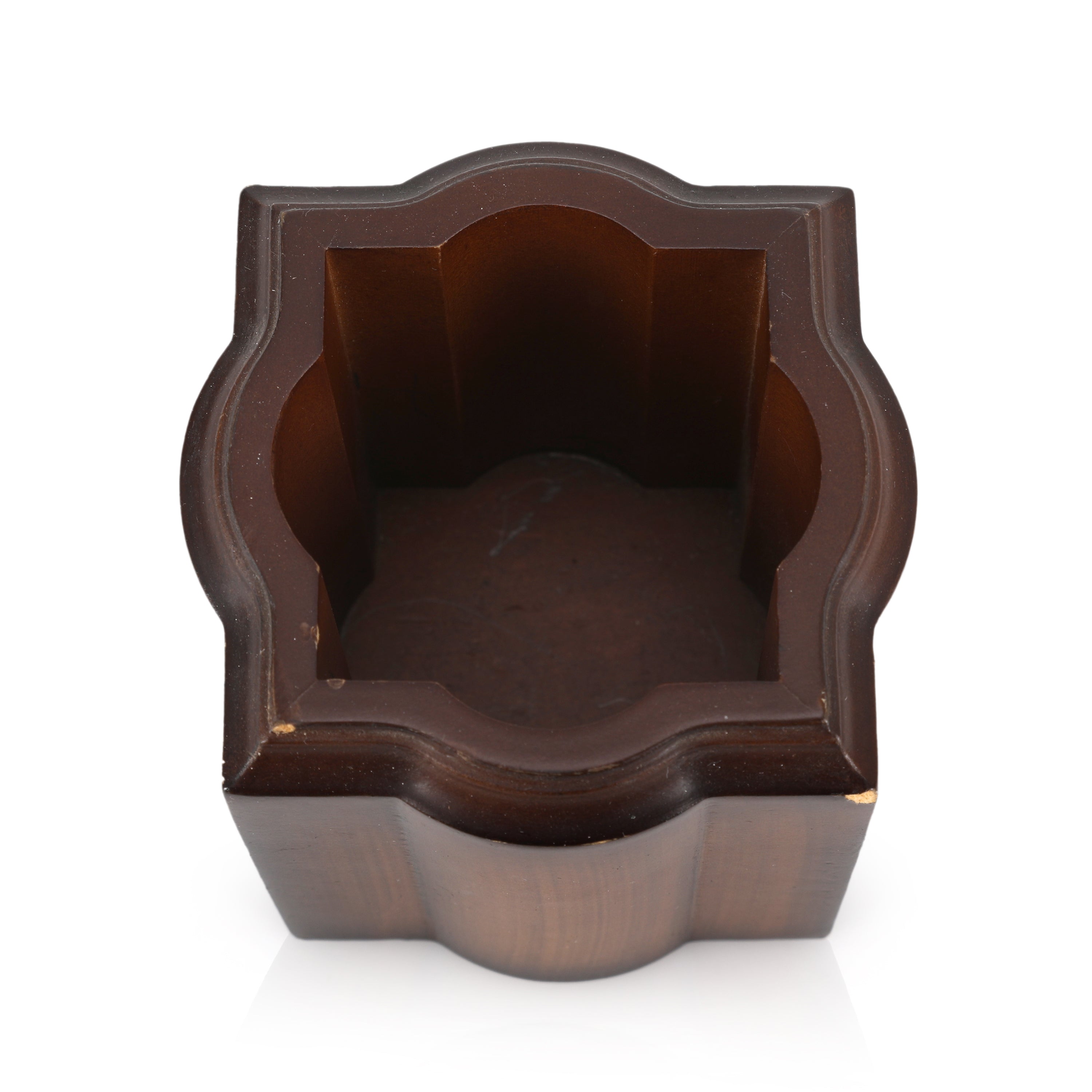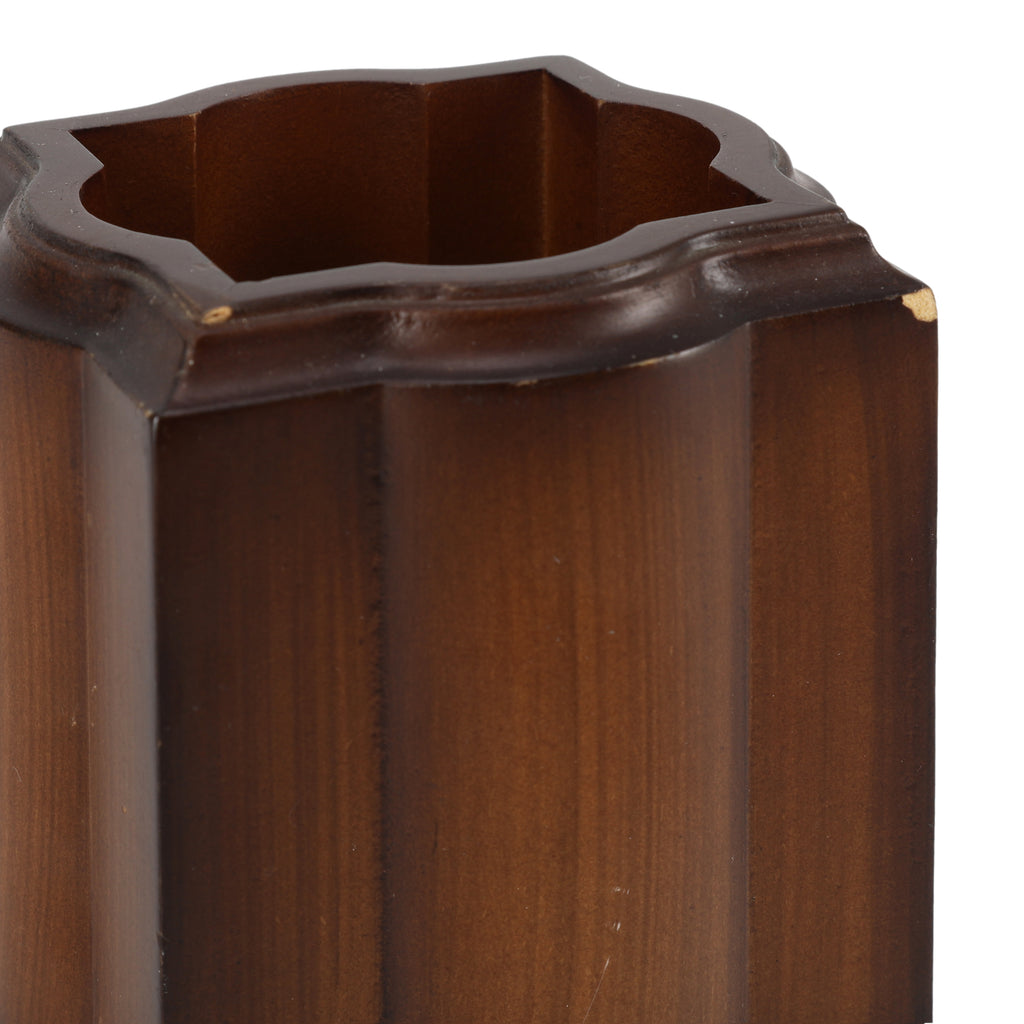 Details: Carved wood pen holder. Small chips visible - rented as is. Dimensions: 3.5" H x 3.5" W x 3.5" D