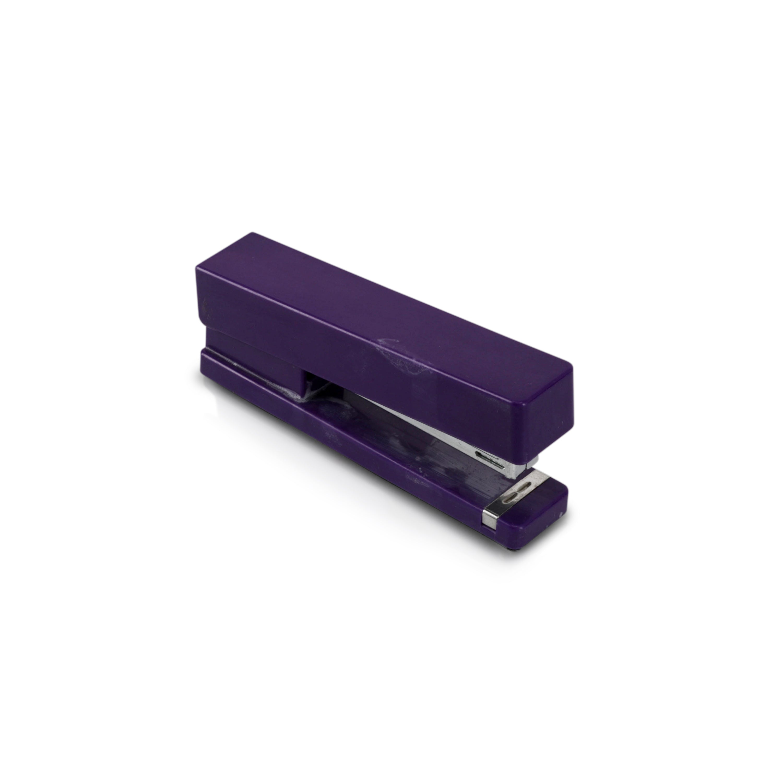 Details: blue & brass stapler with black base. Dimensions: 2" H x 5.5" W x 1.25" D
