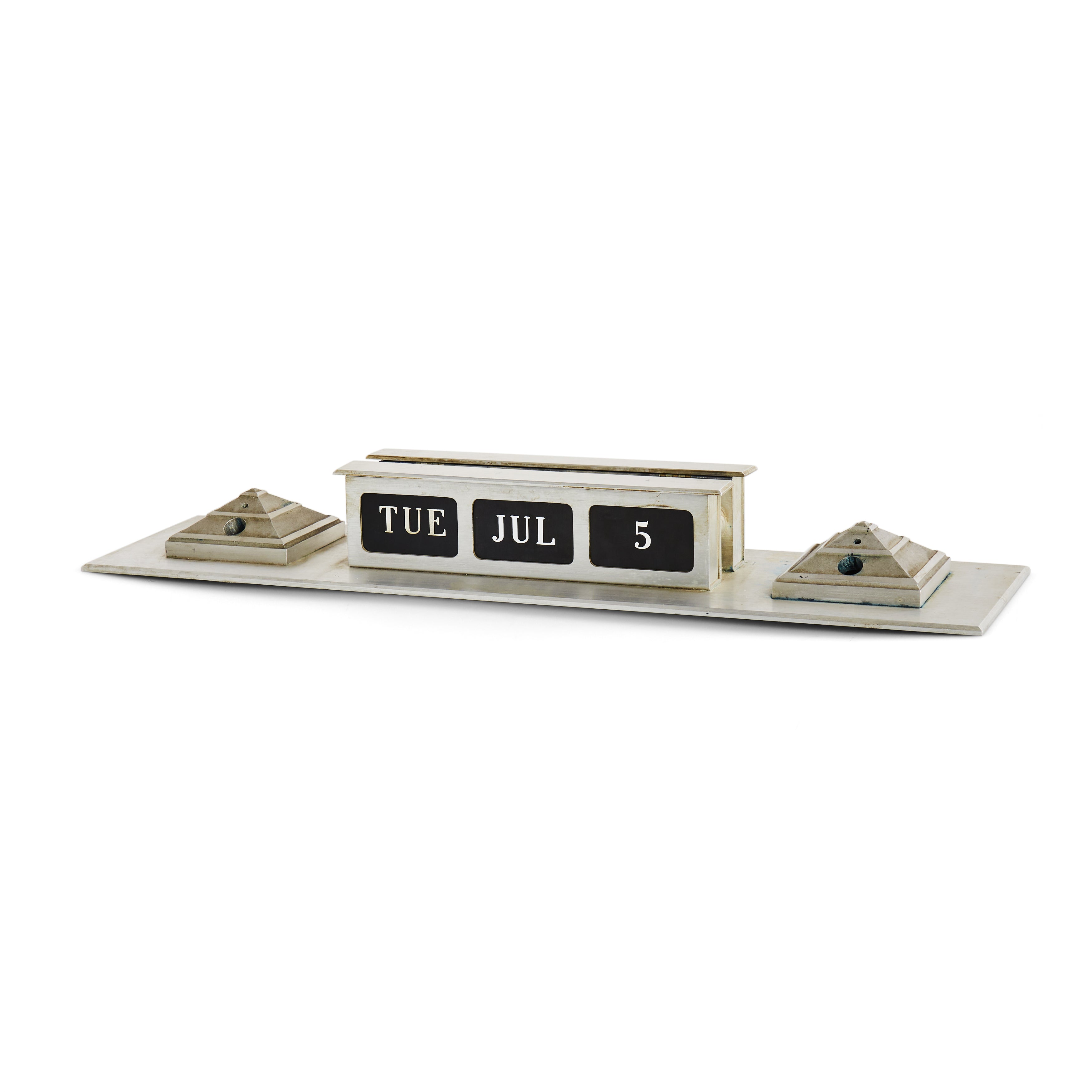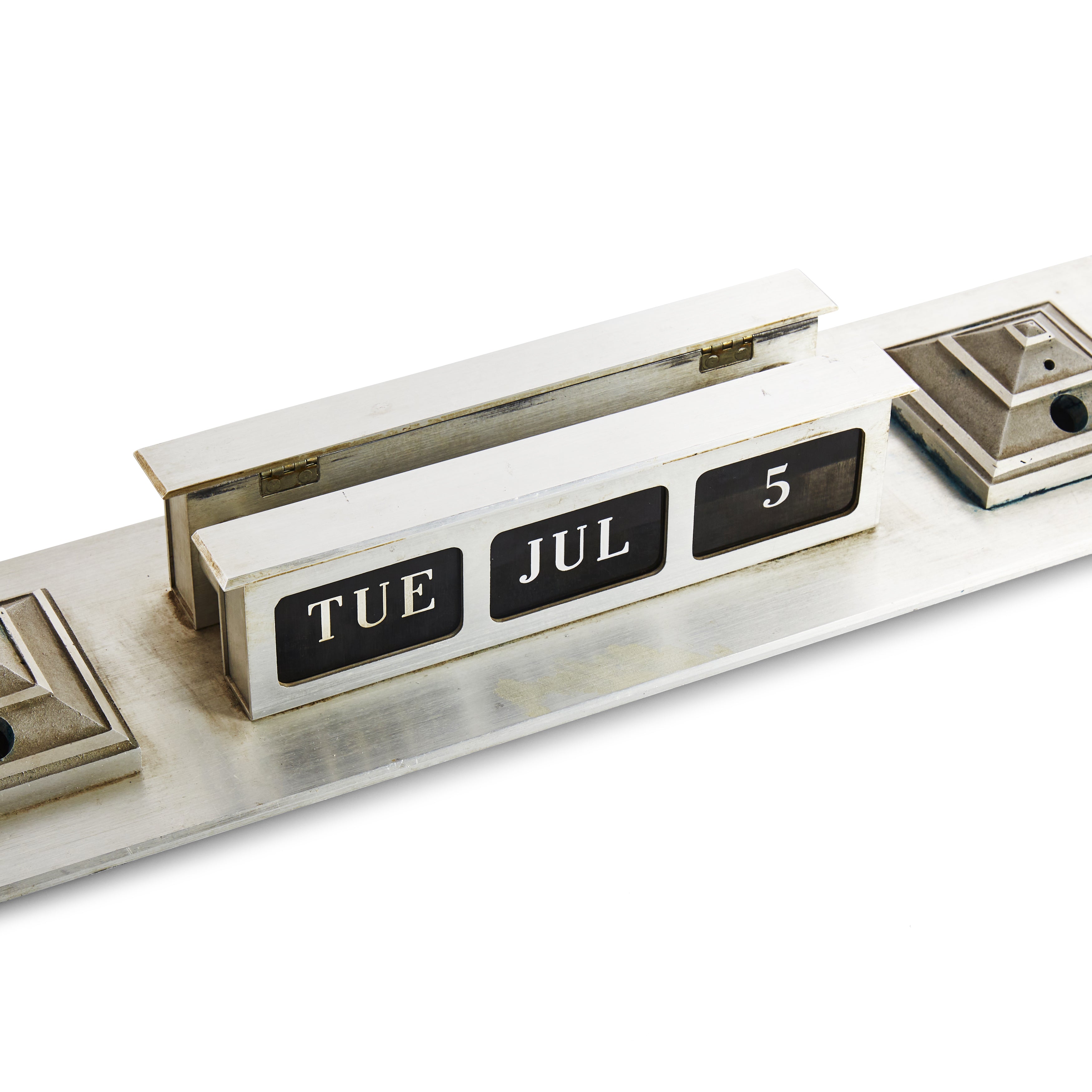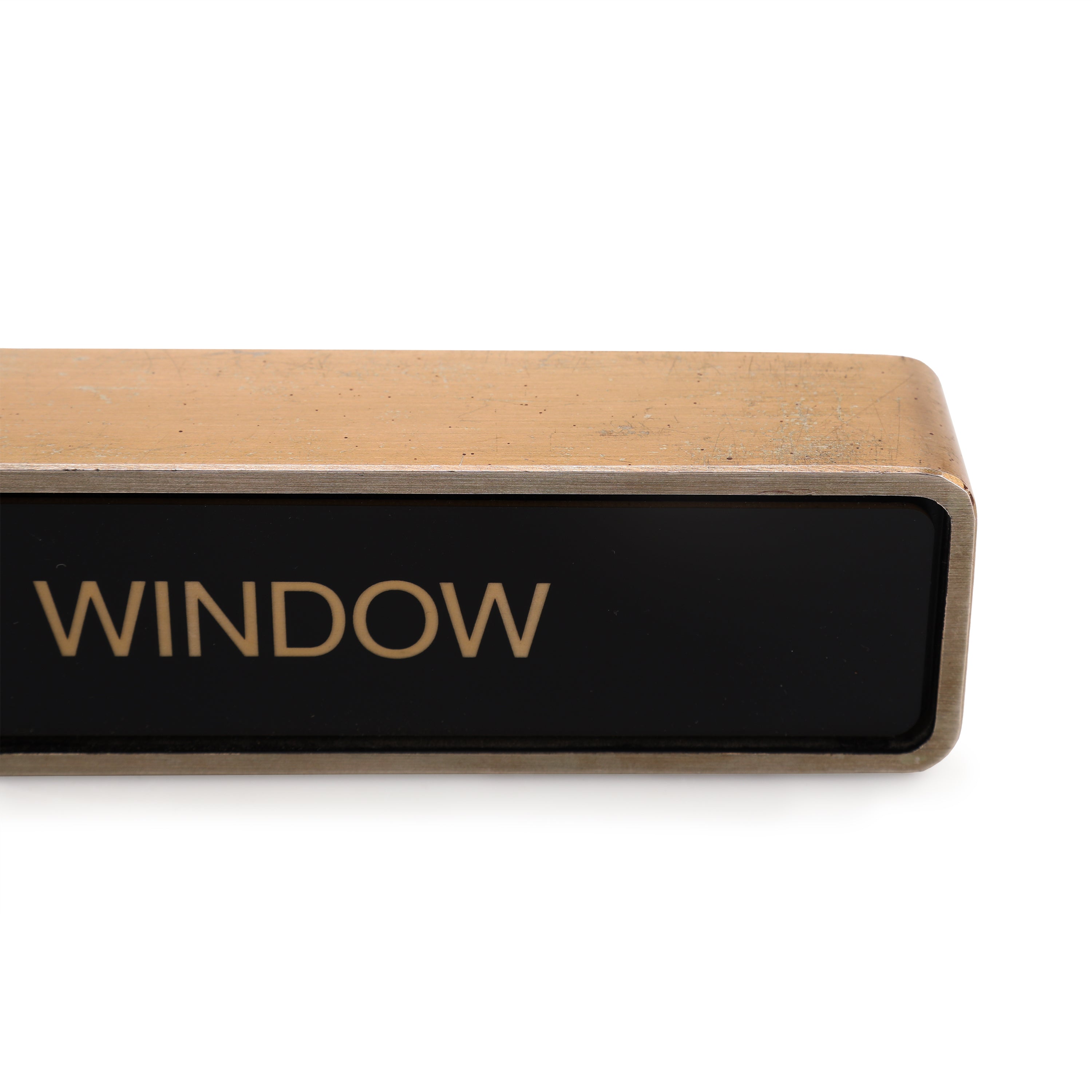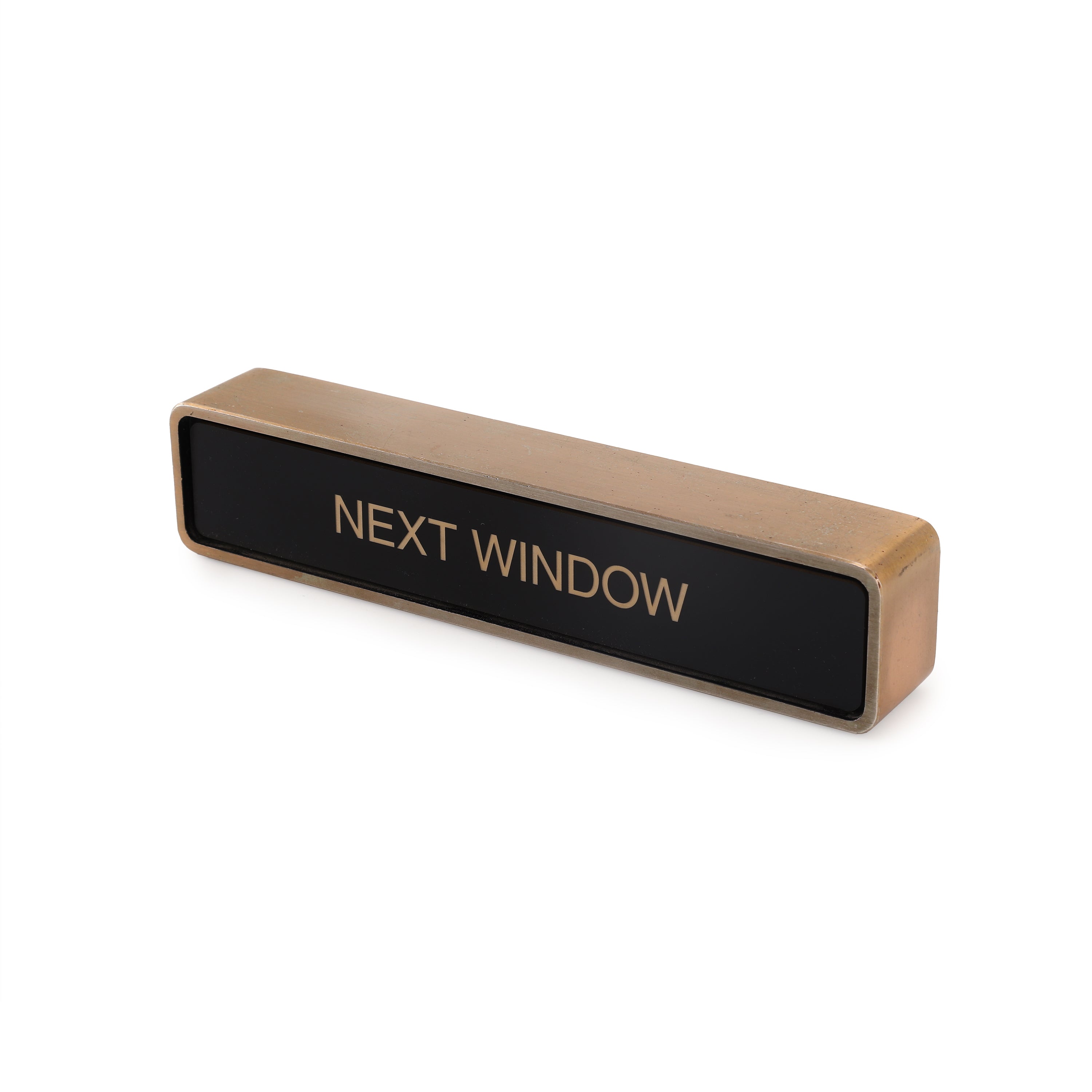 Details: Small brass desk sign. Dimensions: 2" H x 9.5" W x 1.5" D Quantity: 2
